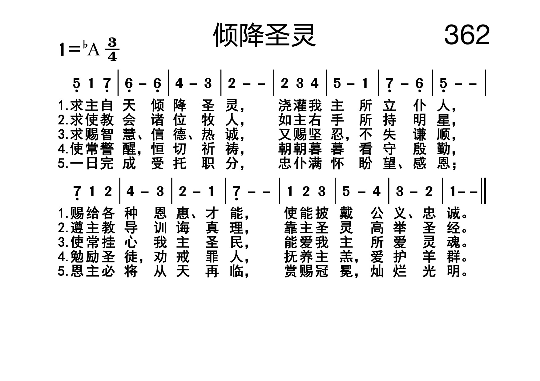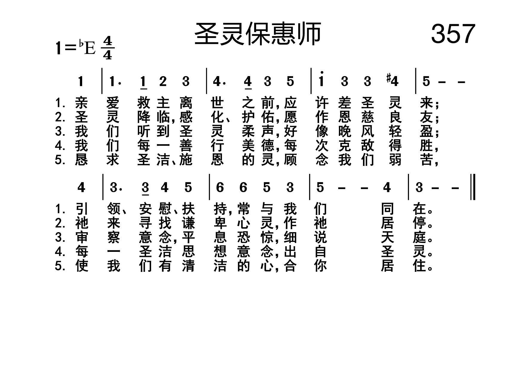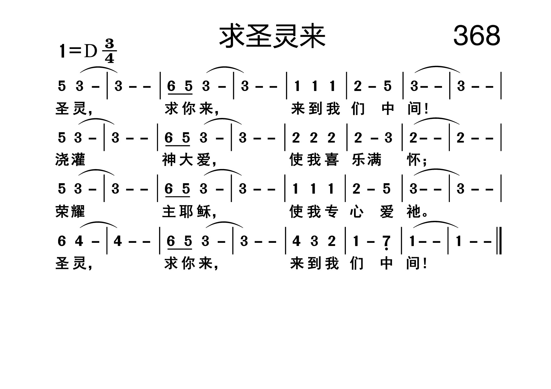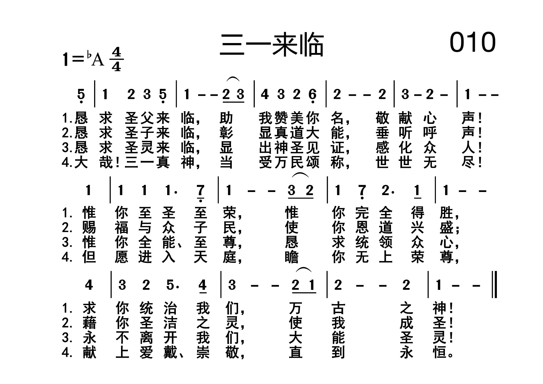 恳求圣父来临,助我赞美主名,敬献心声!惟主无上尊荣,惟主完全得胜,求主统治我们,万古之神!恳求圣子来临,彰显威严大能,垂听呼声!施恩与众子民,使主圣道振兴,建立善义公平,救主良朋!恳求圣灵来临,显出神圣见证,感化众人!惟主全能至尊,恳求统治众心,永不离开我们,大能圣灵!大哉三一真神,当受万民颂称,世世无尽!但愿我众齐来,欢然瞻仰圣明,献上爱戴崇敬,直到永恒!