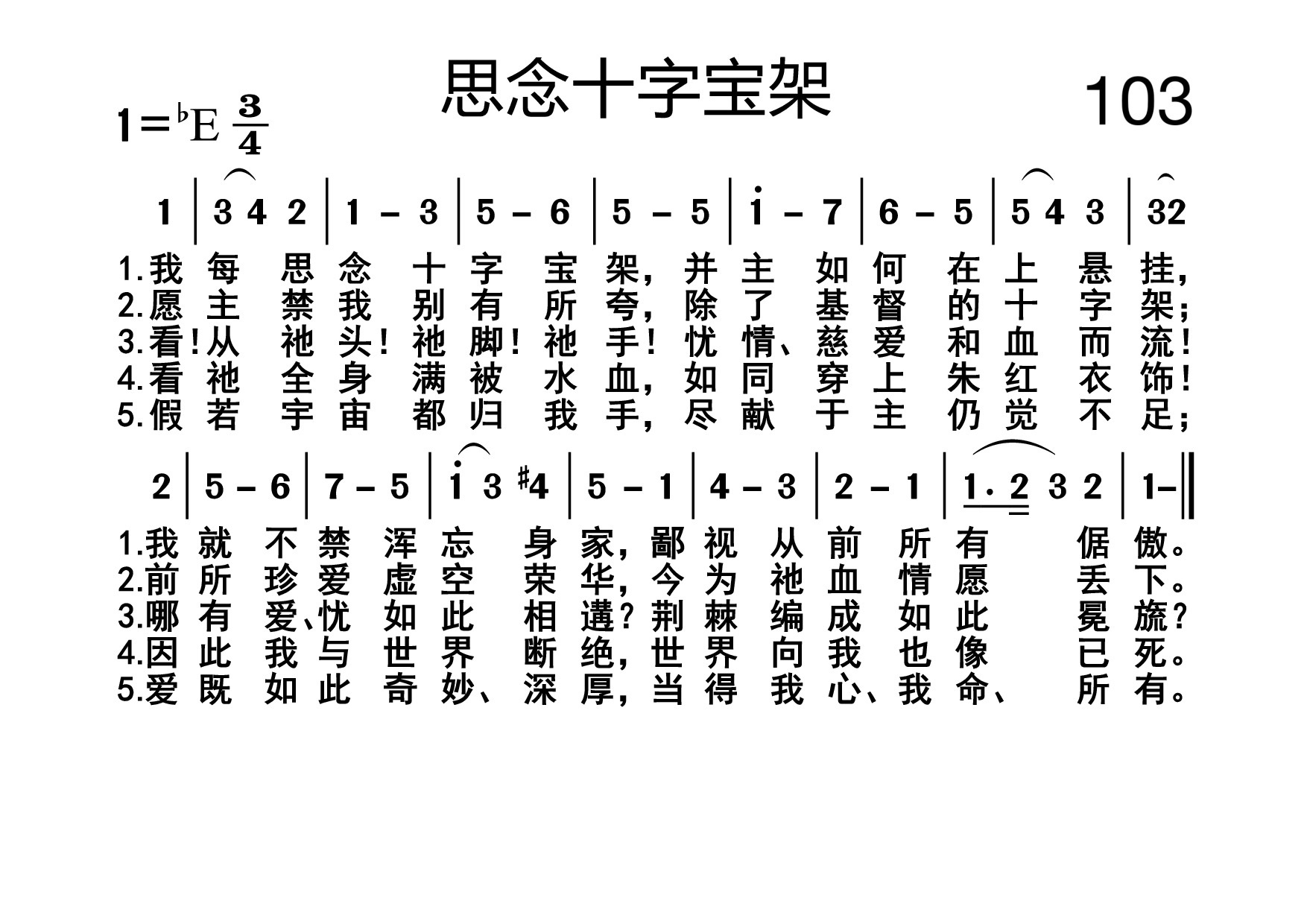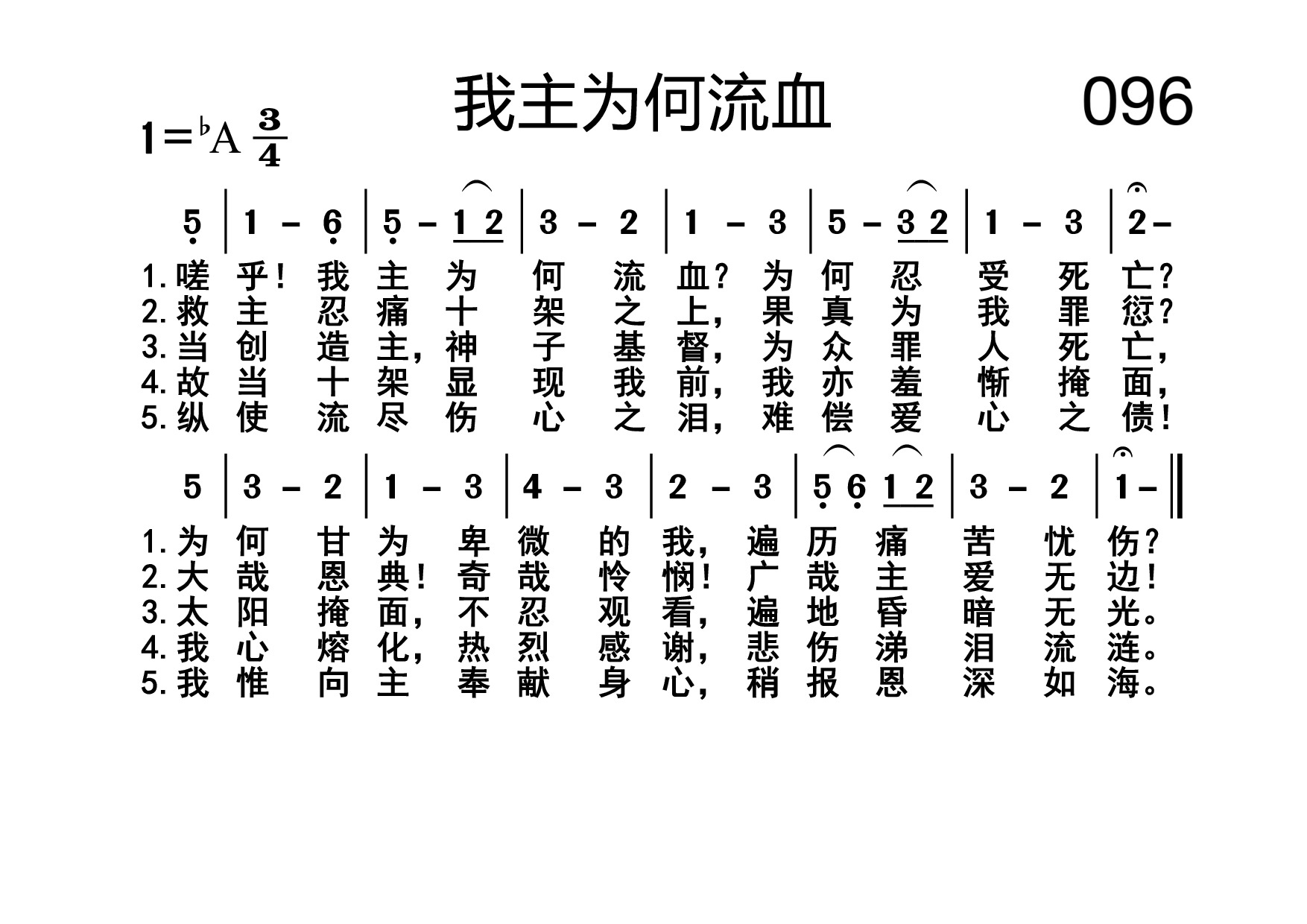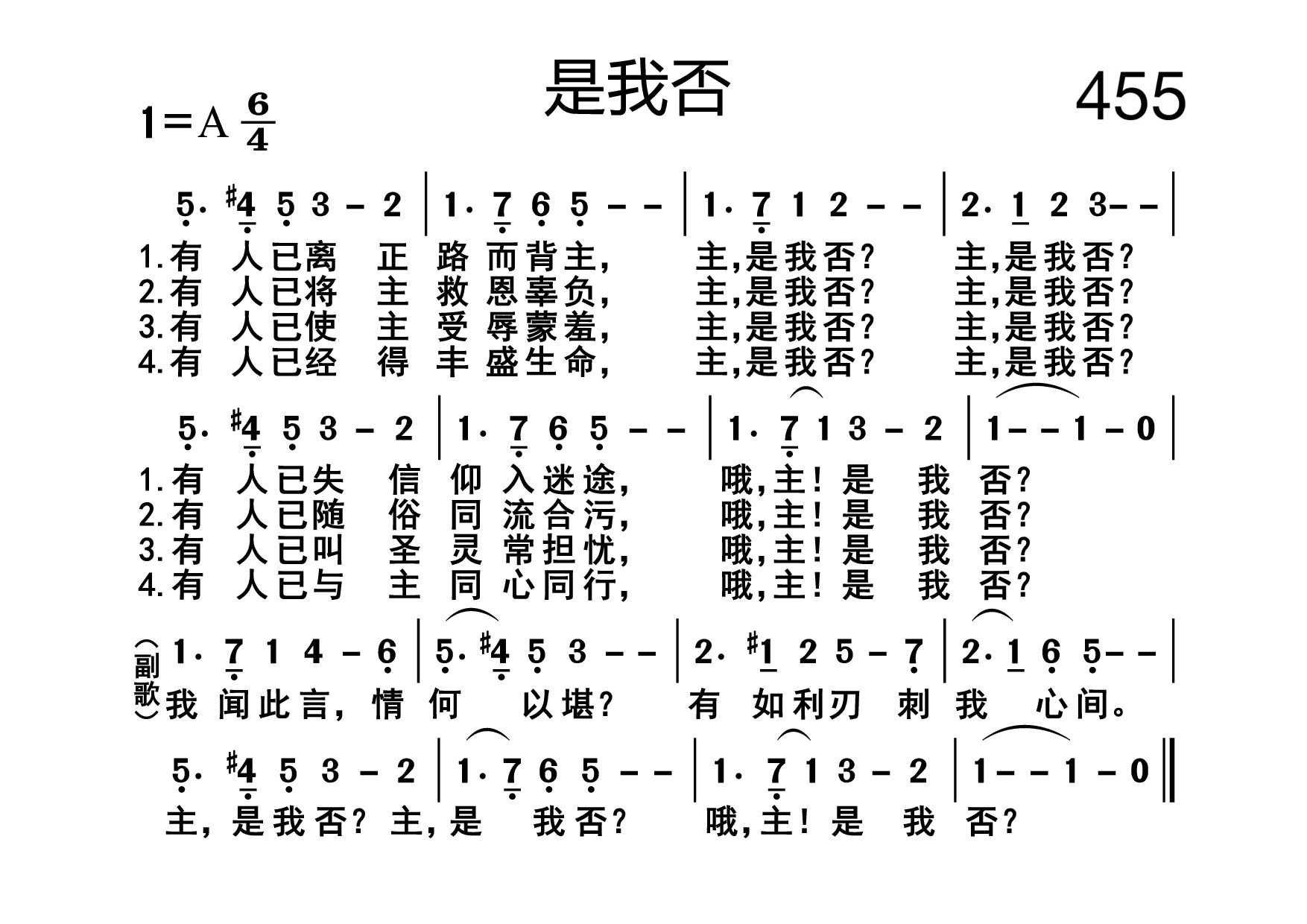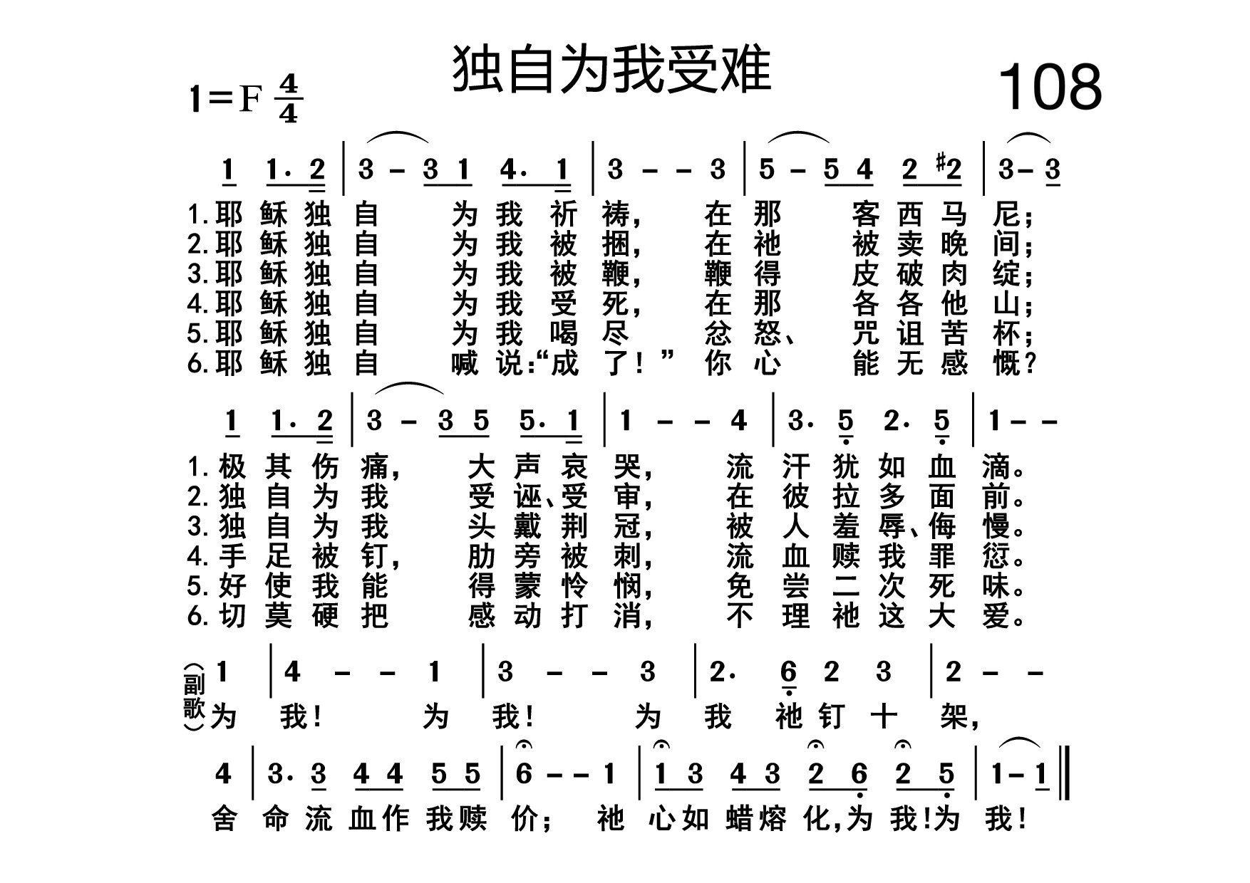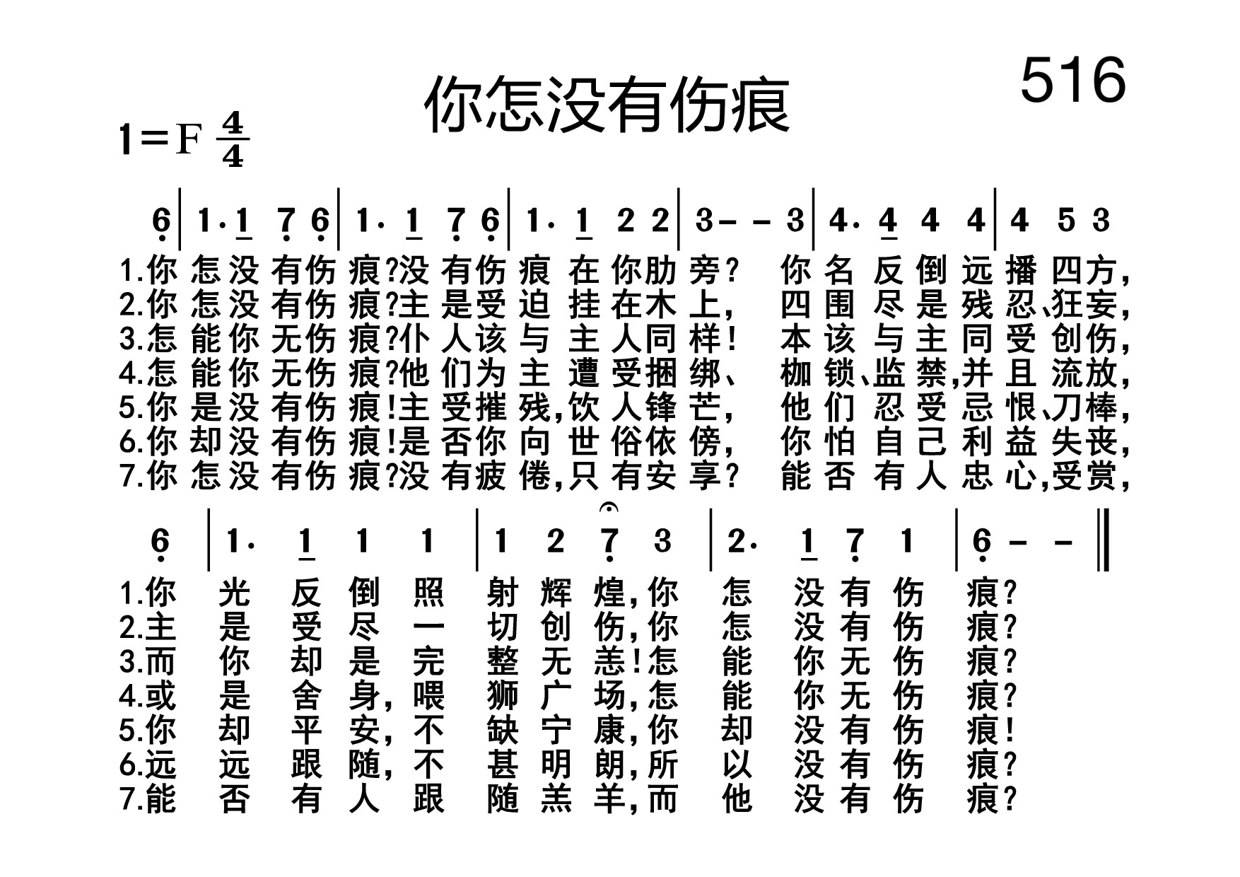 一 你怎没有伤痕?没有伤痕在你肋旁?你名反倒远播四方,你光反倒照射辉煌,你怎没有伤痕? 二 你怎没有伤痕?我是受迫挂在树上,四围尽是残忍、狂妄,我是受尽一切创伤,你怎没有伤痕? 三 怎能你无伤痕?仆人该与主人同样!本该与我同受创伤,而你却是完整无恙!怎能你无伤痕? 四 怎能你无伤痕?他们为我受人捆绑,枷锁、监禁,并且流放,或是舍身,喂狮广场,怎能你无伤痕? 五 你是没有伤痕!我受摧残,饮人锋芒,他们忍受忌恨、刀棒,你却平安,不缺宁康。你却没有伤痕! 六 你却没有伤痕!是否你向世俗依傍,你怕自己利益失丧,远远跟随,不甚明朗,所以没有伤痕? 七 你怎没有伤痕?没有疲倦、只有安享?能否有人忠心,受赏?能否有人跟隧羔羊,而他没有伤痕?