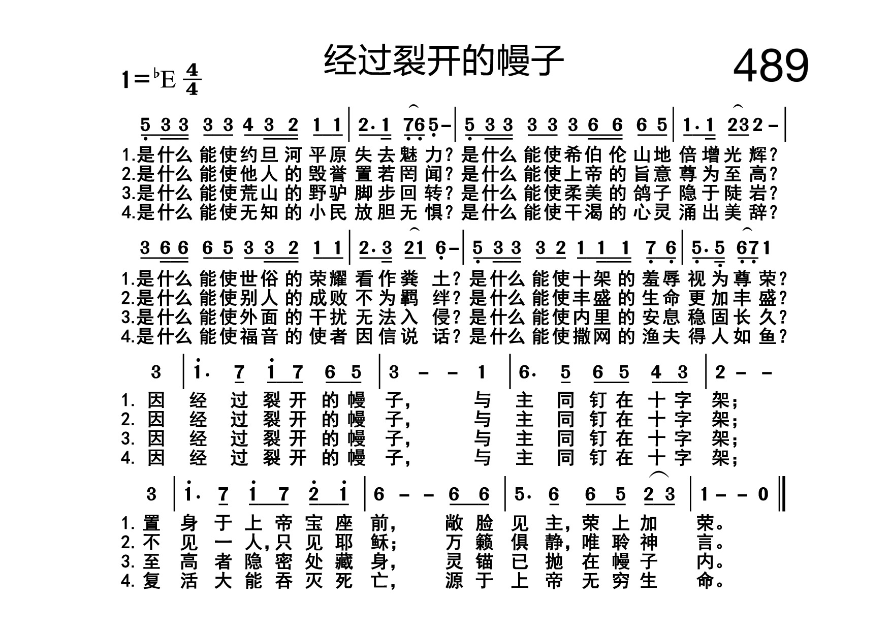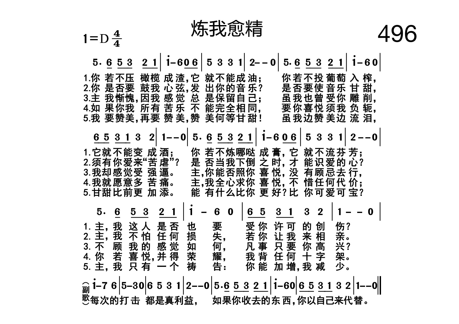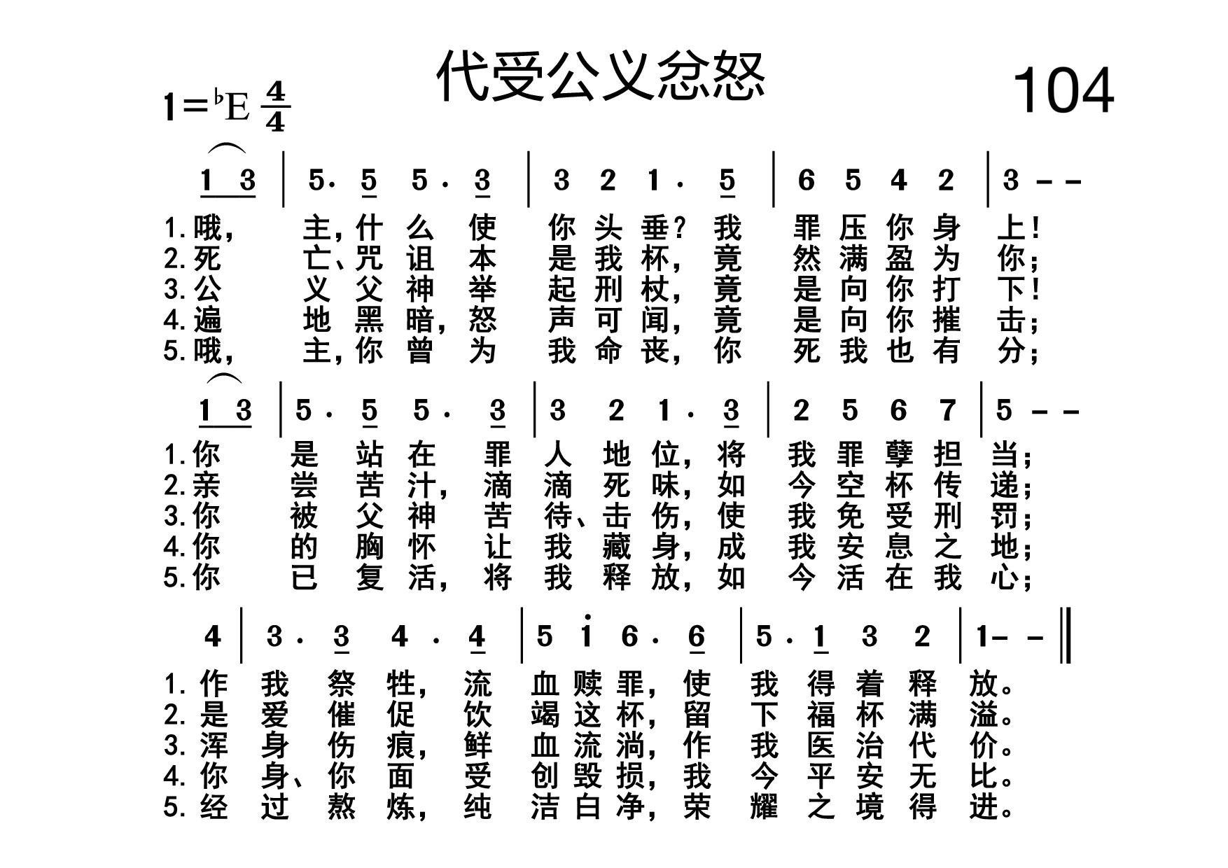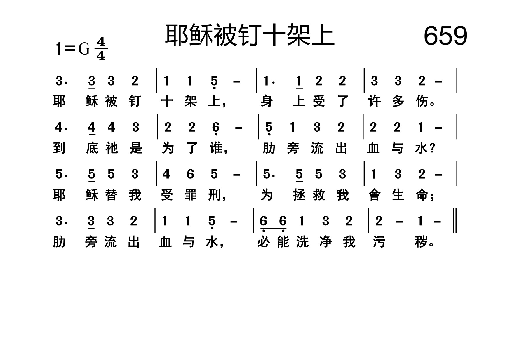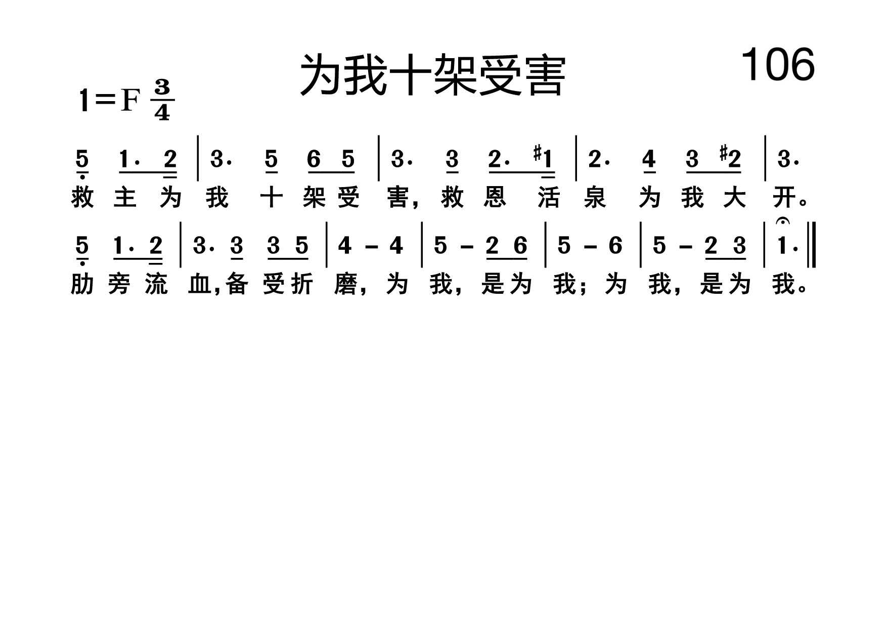 一 你怎没有伤痕?没有伤痕在你肋旁?你名反倒远播四方,你光反倒照射辉煌,你怎没有伤痕? 二 你怎没有伤痕?我是受迫挂在树上,四围尽是残忍、狂妄,我是受尽一切创伤,你怎没有伤痕? 三 怎能你无伤痕?仆人该与主人同样!本该与我同受创伤,而你却是完整无恙!怎能你无伤痕? 四 怎能你无伤痕?他们为我受人捆绑,枷锁、监禁,并且流放,或是舍身,喂狮广场,怎能你无伤痕? 五 你是没有伤痕!我受摧残,饮人锋芒,他们忍受忌恨、刀棒,你却平安,不缺宁康。你却没有伤痕! 六 你却没有伤痕!是否你向世俗依傍,你怕自己利益失丧,远远跟随,不甚明朗,所以没有伤痕? 七 你怎没有伤痕?没有疲倦、只有安享?能否有人忠心,受赏?能否有人跟隧羔羊,而他没有伤痕?