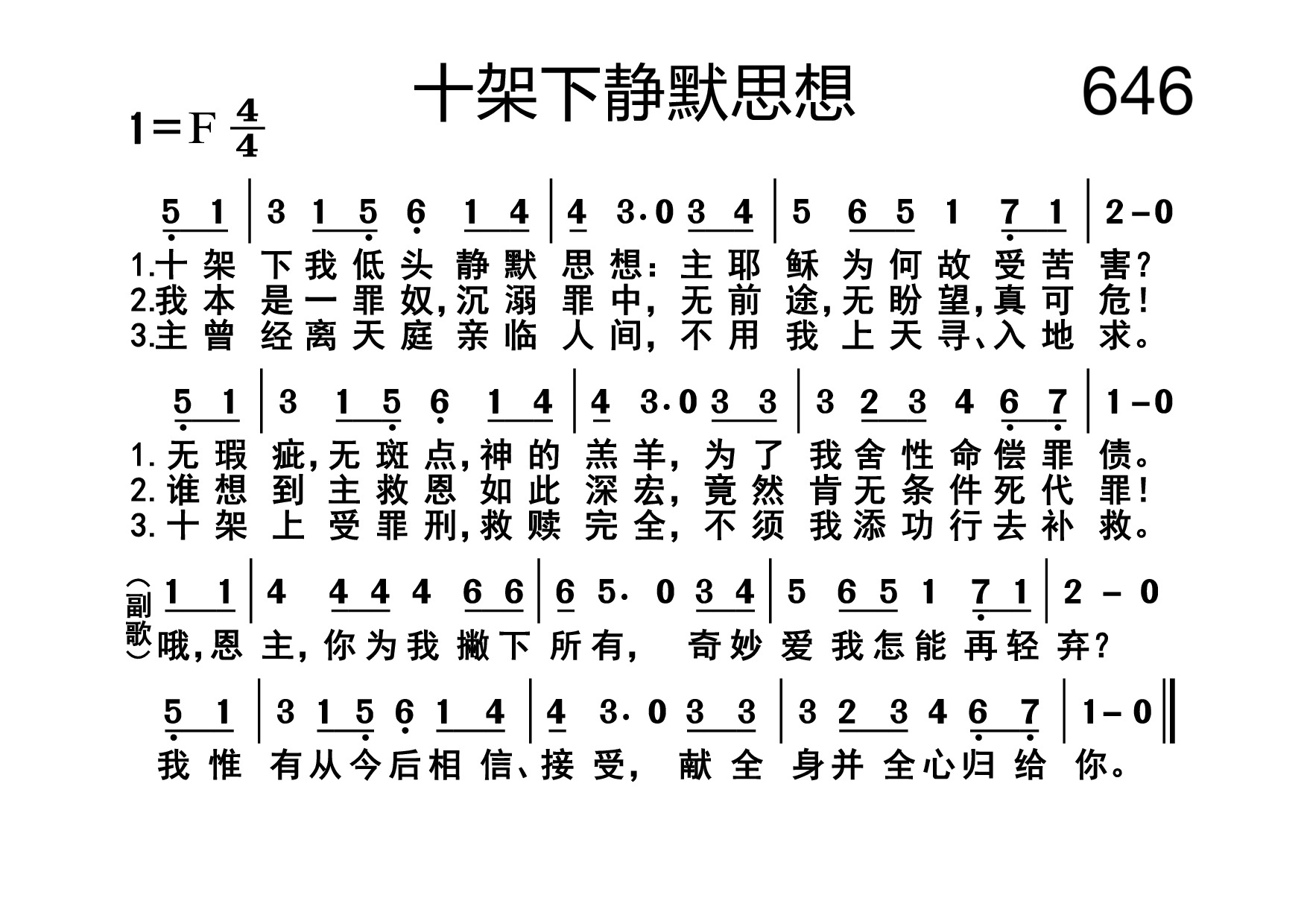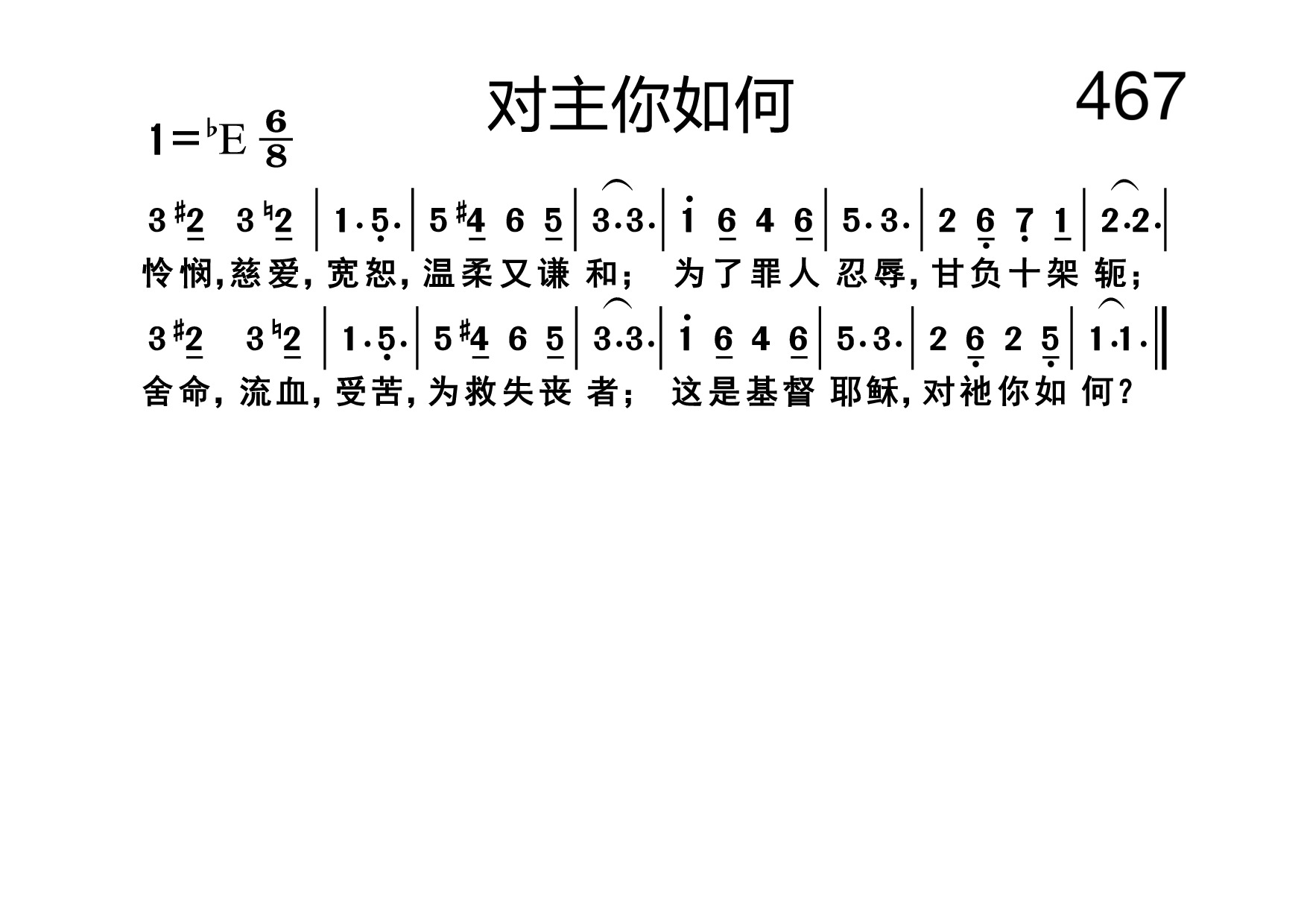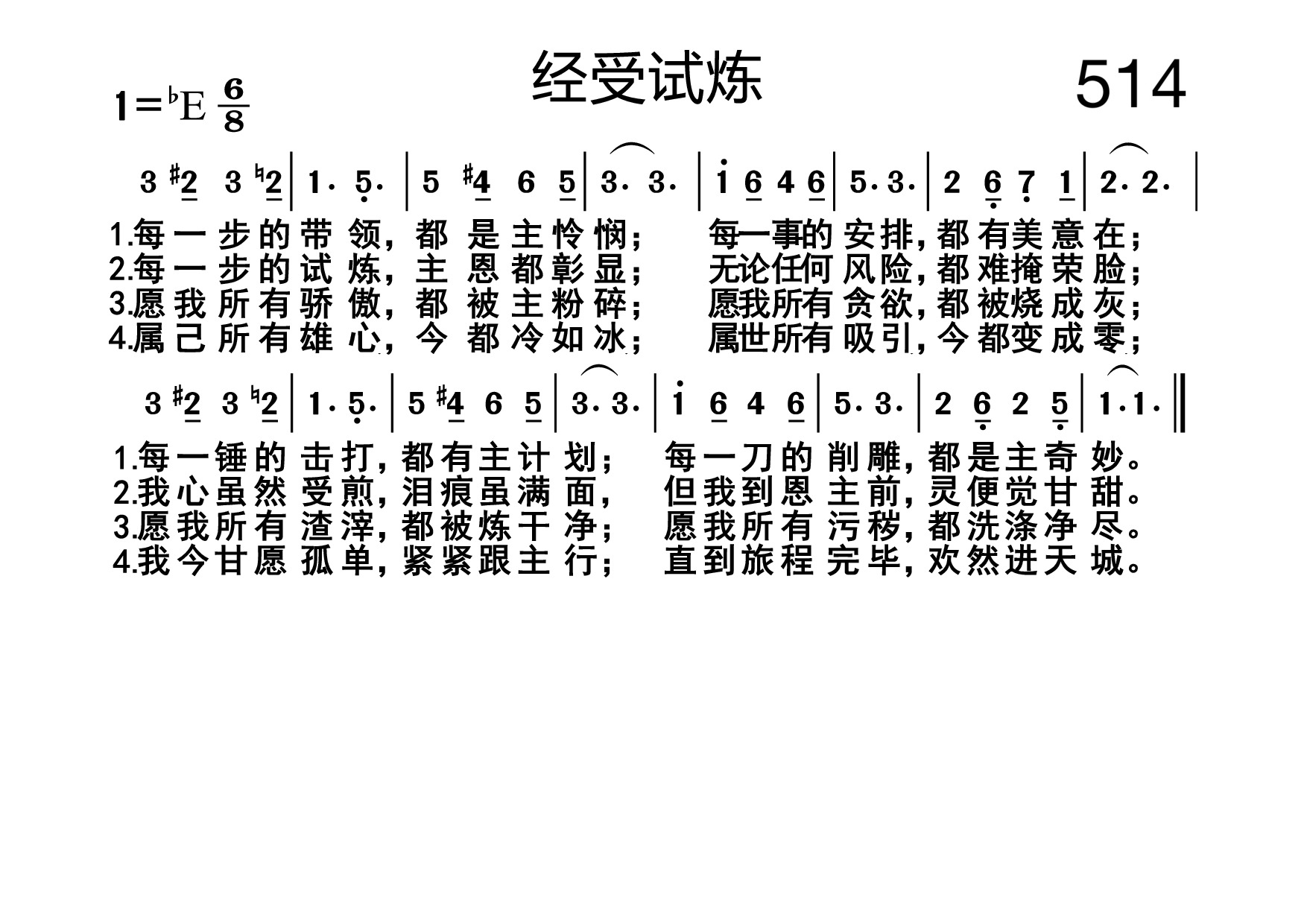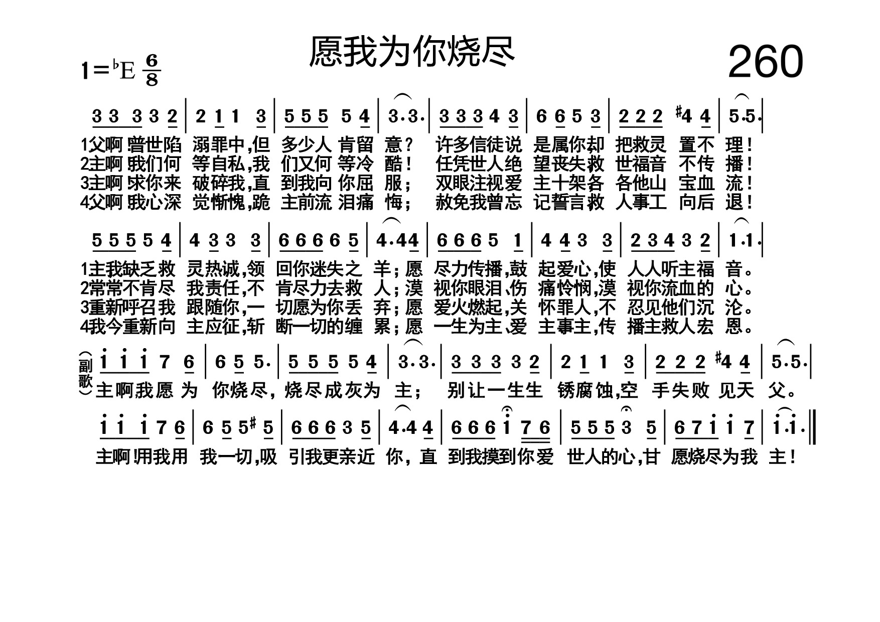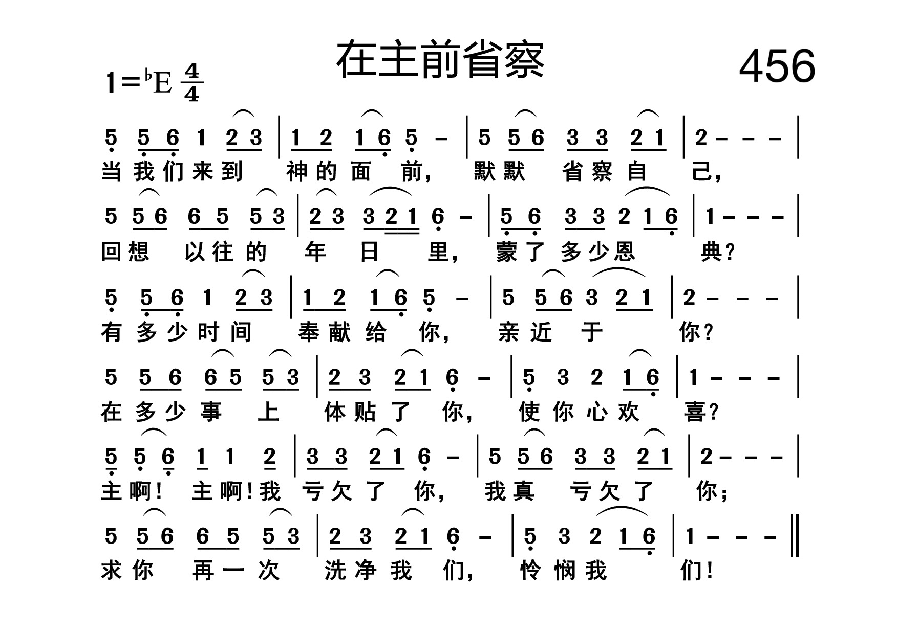 一 你怎没有伤痕?没有伤痕在你肋旁?你名反倒远播四方,你光反倒照射辉煌,你怎没有伤痕? 二 你怎没有伤痕?我是受迫挂在树上,四围尽是残忍、狂妄,我是受尽一切创伤,你怎没有伤痕? 三 怎能你无伤痕?仆人该与主人同样!本该与我同受创伤,而你却是完整无恙!怎能你无伤痕? 四 怎能你无伤痕?他们为我受人捆绑,枷锁、监禁,并且流放,或是舍身,喂狮广场,怎能你无伤痕? 五 你是没有伤痕!我受摧残,饮人锋芒,他们忍受忌恨、刀棒,你却平安,不缺宁康。你却没有伤痕! 六 你却没有伤痕!是否你向世俗依傍,你怕自己利益失丧,远远跟随,不甚明朗,所以没有伤痕? 七 你怎没有伤痕?没有疲倦、只有安享?能否有人忠心,受赏?能否有人跟隧羔羊,而他没有伤痕?