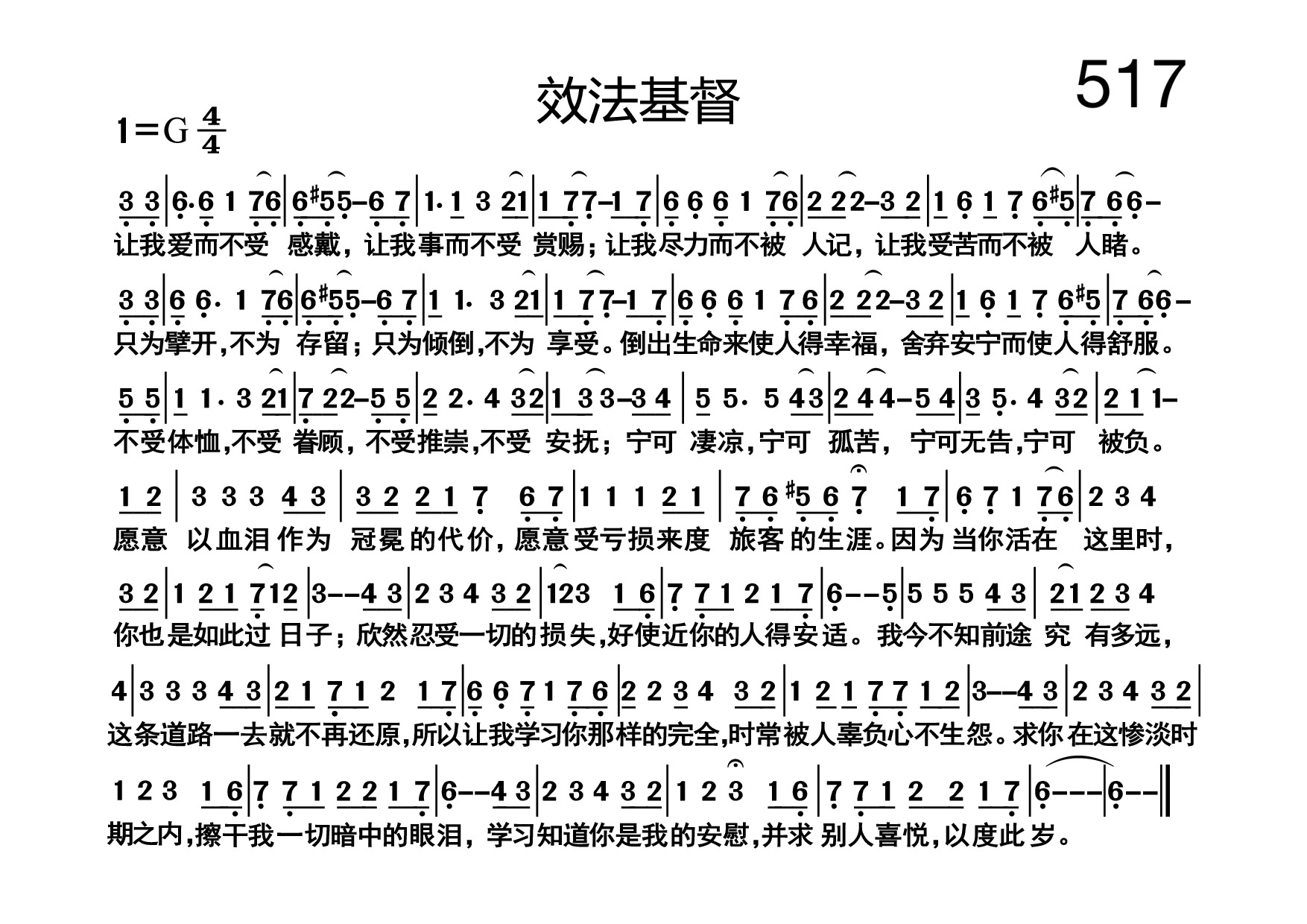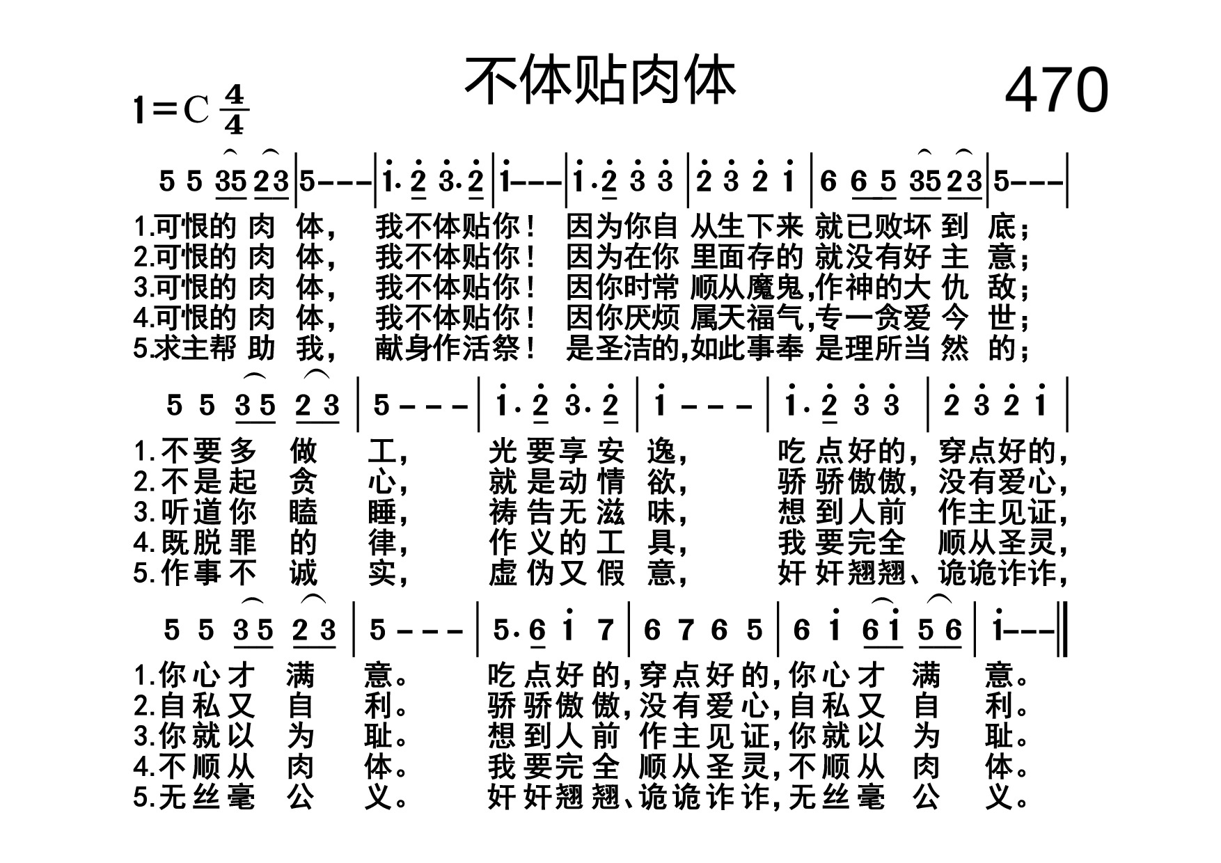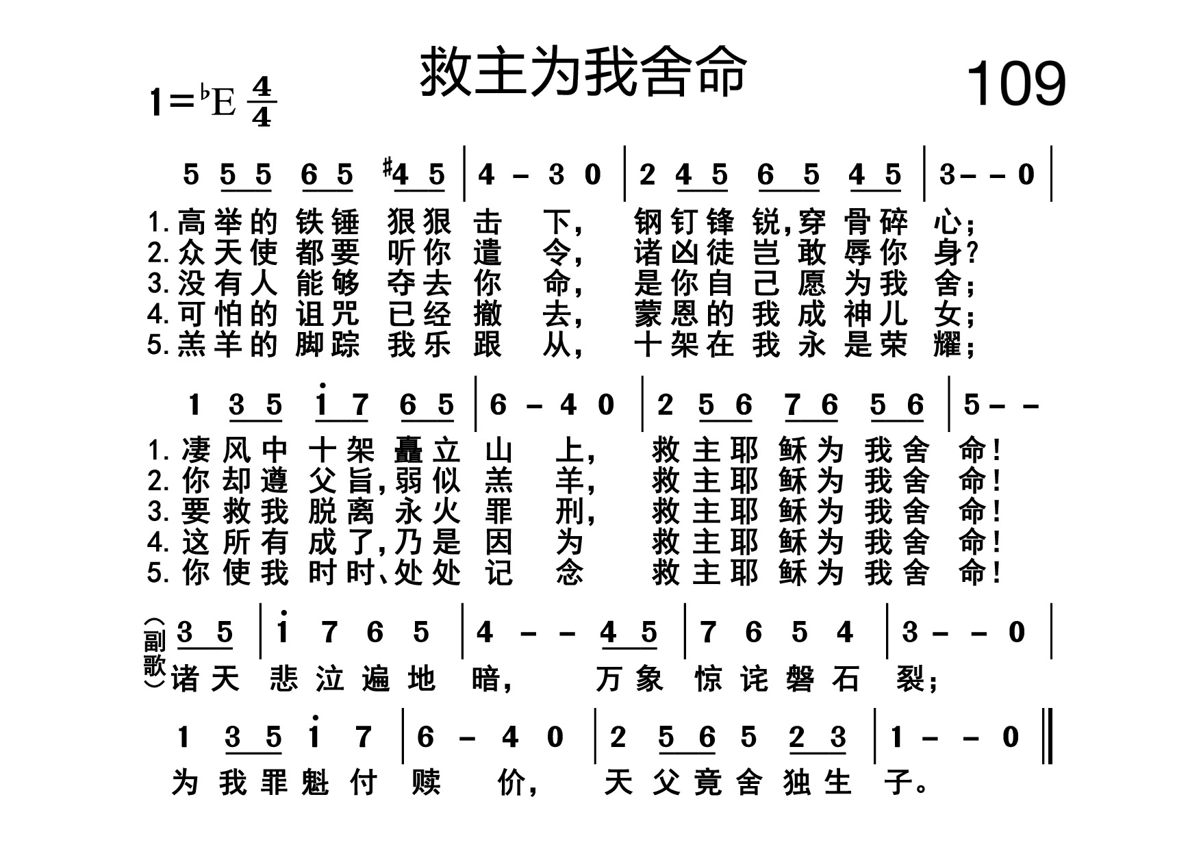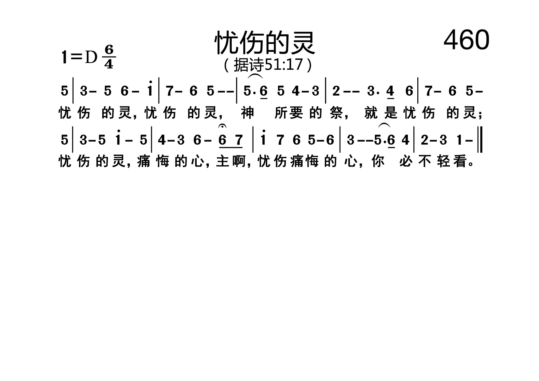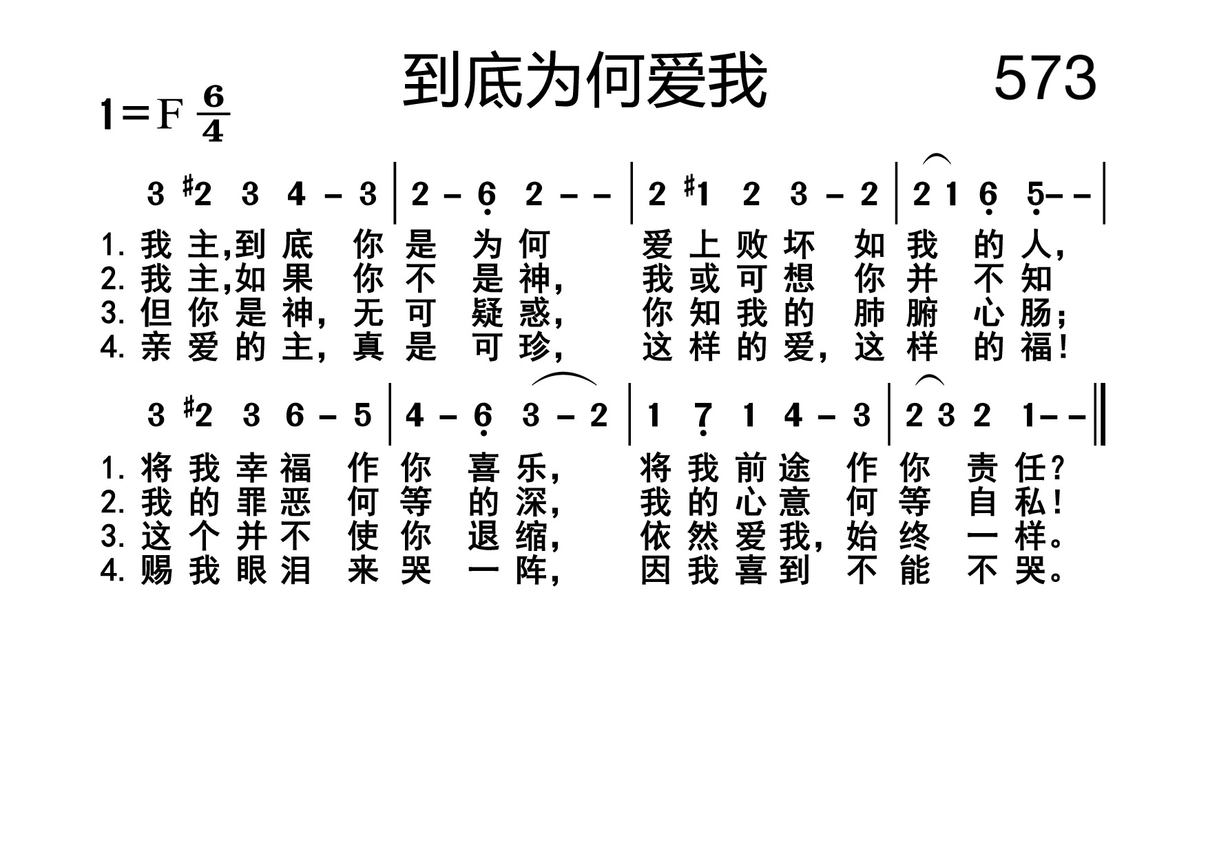 一 你怎没有伤痕?没有伤痕在你肋旁?你名反倒远播四方,你光反倒照射辉煌,你怎没有伤痕? 二 你怎没有伤痕?我是受迫挂在树上,四围尽是残忍、狂妄,我是受尽一切创伤,你怎没有伤痕? 三 怎能你无伤痕?仆人该与主人同样!本该与我同受创伤,而你却是完整无恙!怎能你无伤痕? 四 怎能你无伤痕?他们为我受人捆绑,枷锁、监禁,并且流放,或是舍身,喂狮广场,怎能你无伤痕? 五 你是没有伤痕!我受摧残,饮人锋芒,他们忍受忌恨、刀棒,你却平安,不缺宁康。你却没有伤痕! 六 你却没有伤痕!是否你向世俗依傍,你怕自己利益失丧,远远跟随,不甚明朗,所以没有伤痕? 七 你怎没有伤痕?没有疲倦、只有安享?能否有人忠心,受赏?能否有人跟隧羔羊,而他没有伤痕?