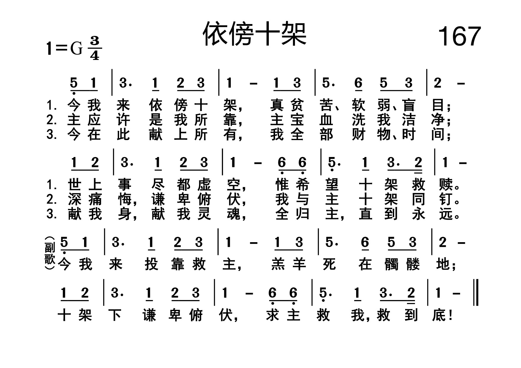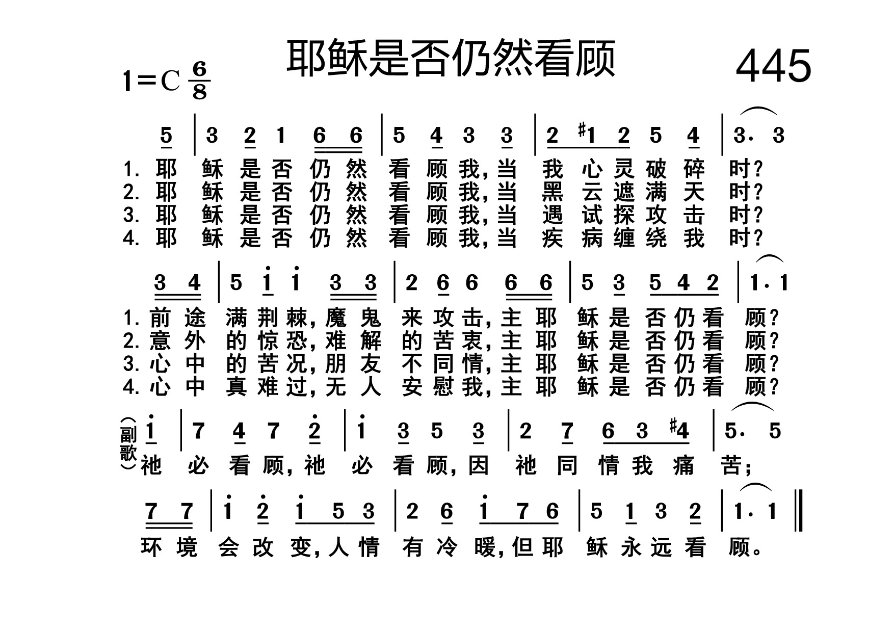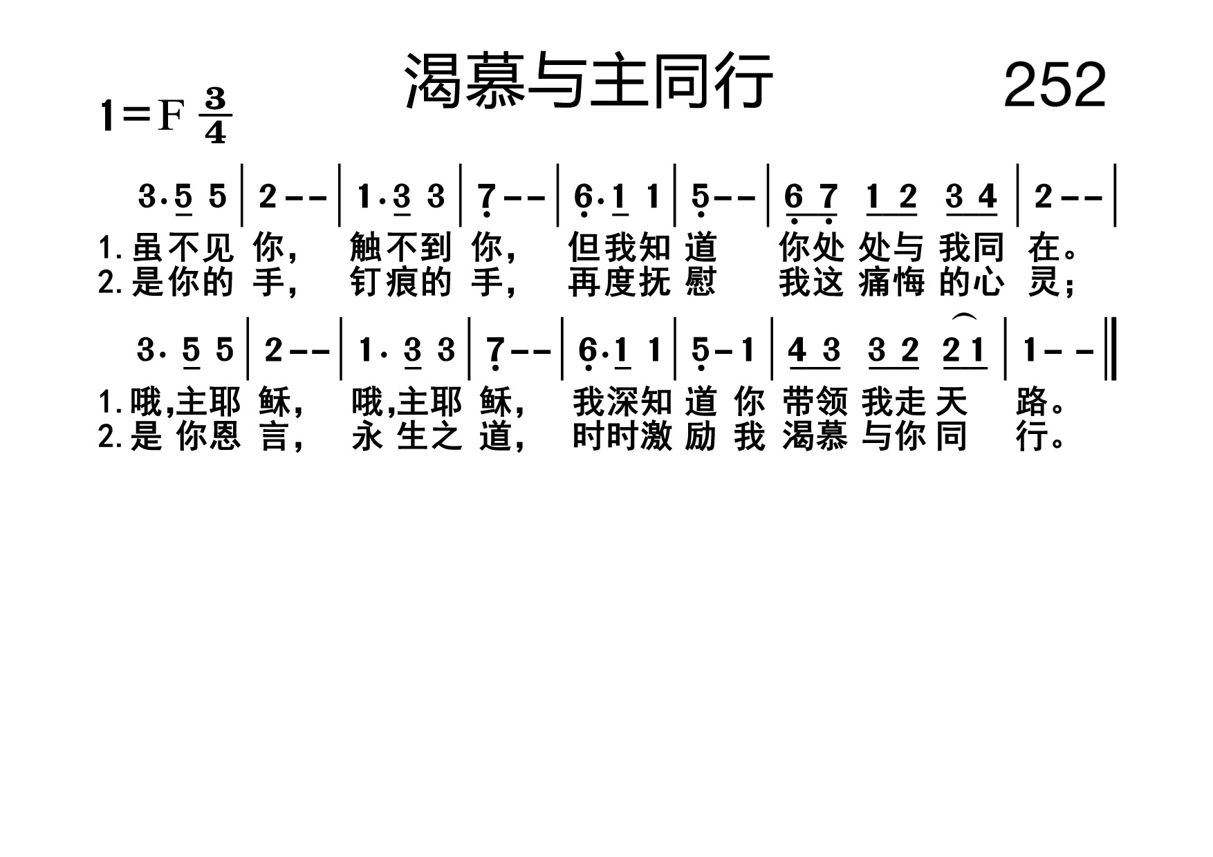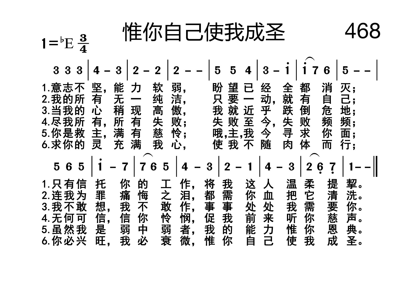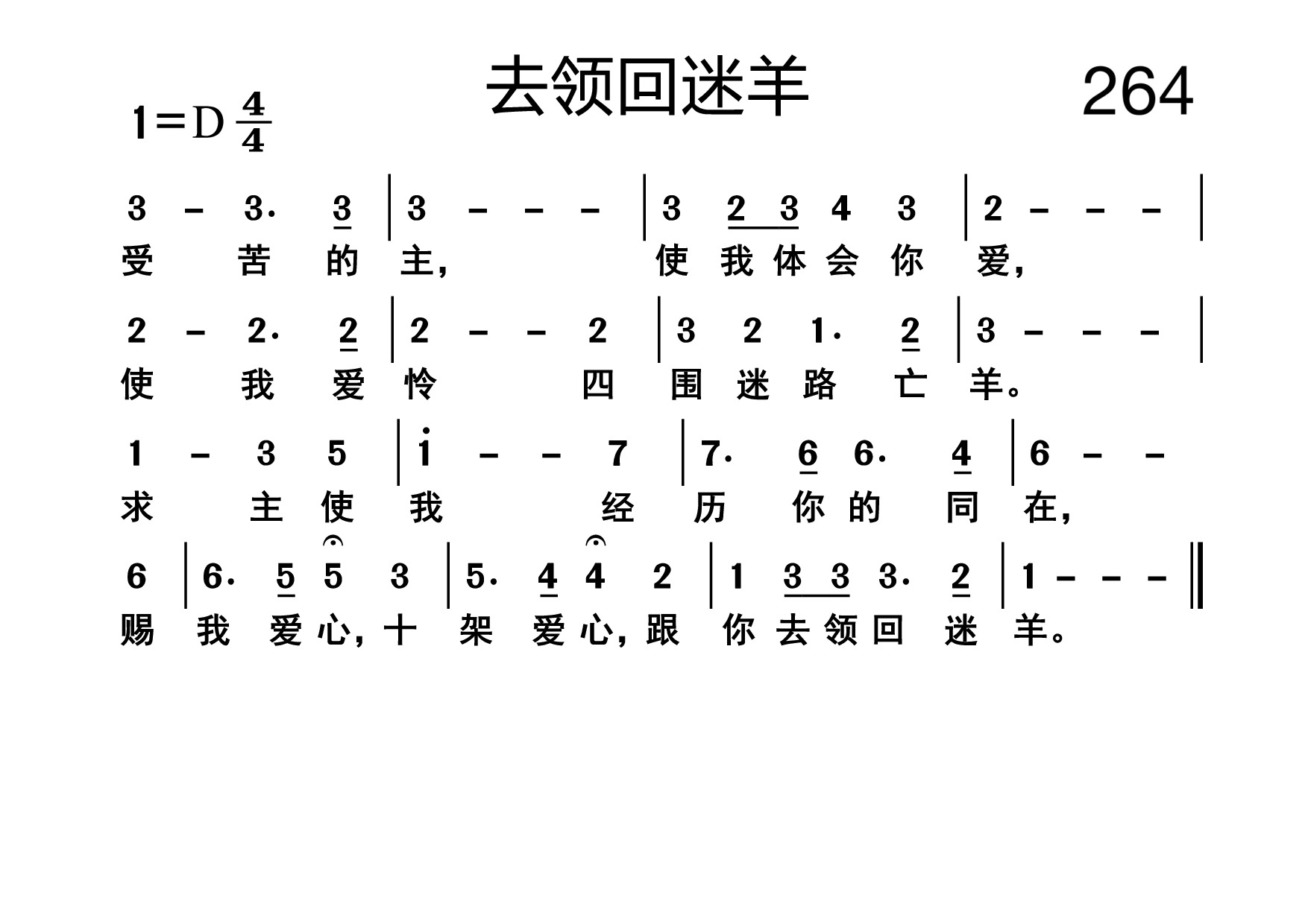 一 你怎没有伤痕?没有伤痕在你肋旁?你名反倒远播四方,你光反倒照射辉煌,你怎没有伤痕? 二 你怎没有伤痕?我是受迫挂在树上,四围尽是残忍、狂妄,我是受尽一切创伤,你怎没有伤痕? 三 怎能你无伤痕?仆人该与主人同样!本该与我同受创伤,而你却是完整无恙!怎能你无伤痕? 四 怎能你无伤痕?他们为我受人捆绑,枷锁、监禁,并且流放,或是舍身,喂狮广场,怎能你无伤痕? 五 你是没有伤痕!我受摧残,饮人锋芒,他们忍受忌恨、刀棒,你却平安,不缺宁康。你却没有伤痕! 六 你却没有伤痕!是否你向世俗依傍,你怕自己利益失丧,远远跟随,不甚明朗,所以没有伤痕? 七 你怎没有伤痕?没有疲倦、只有安享?能否有人忠心,受赏?能否有人跟隧羔羊,而他没有伤痕?