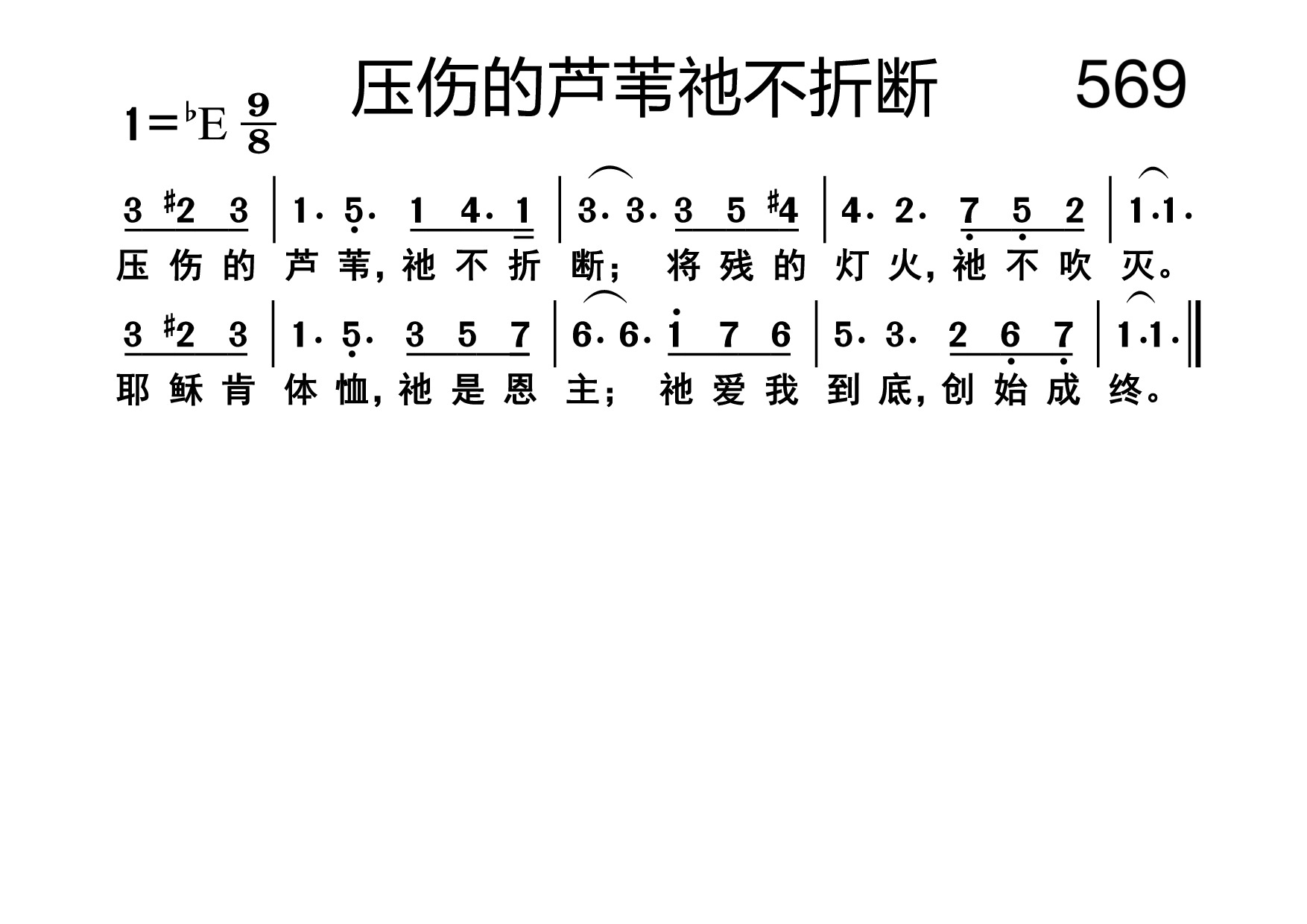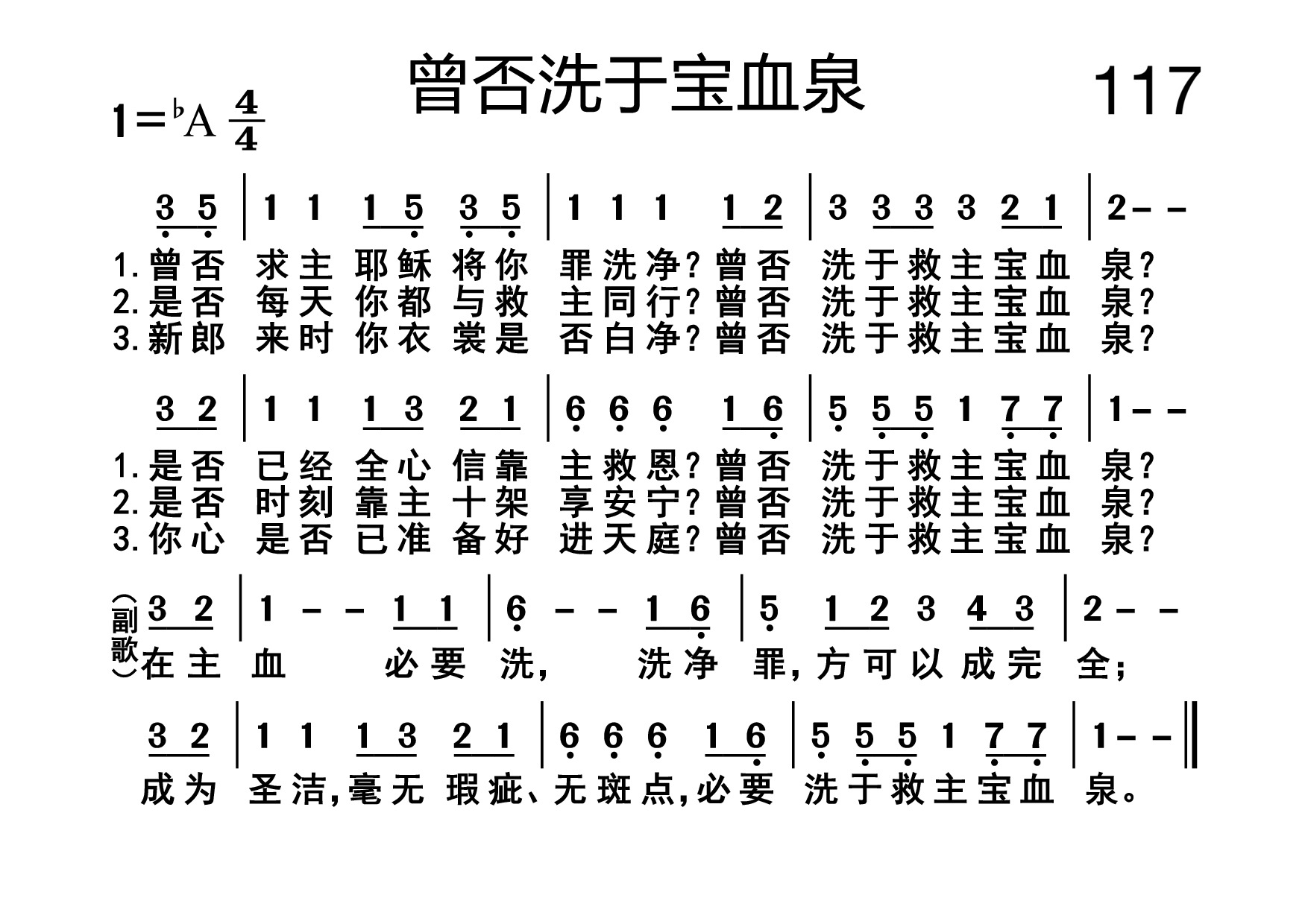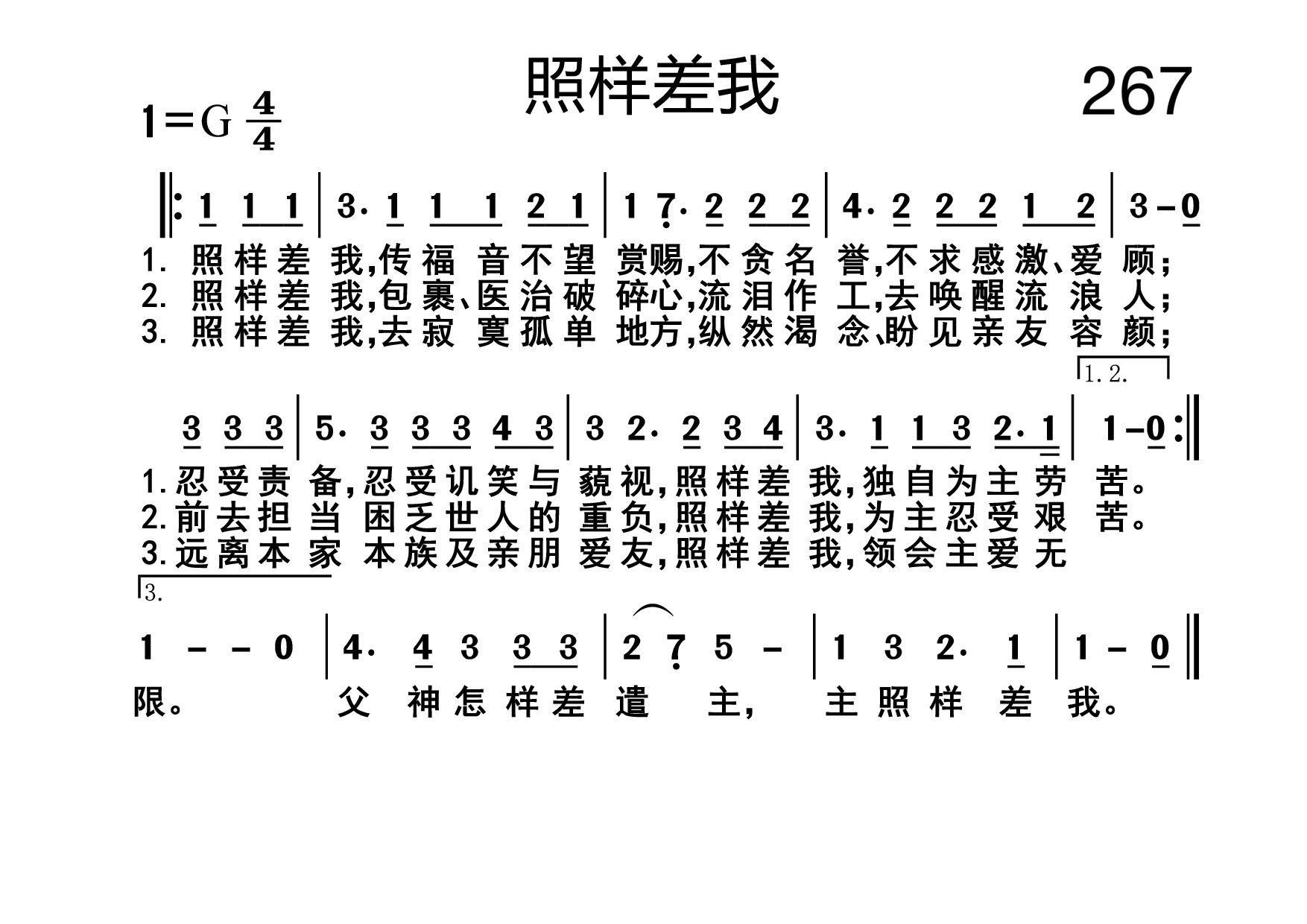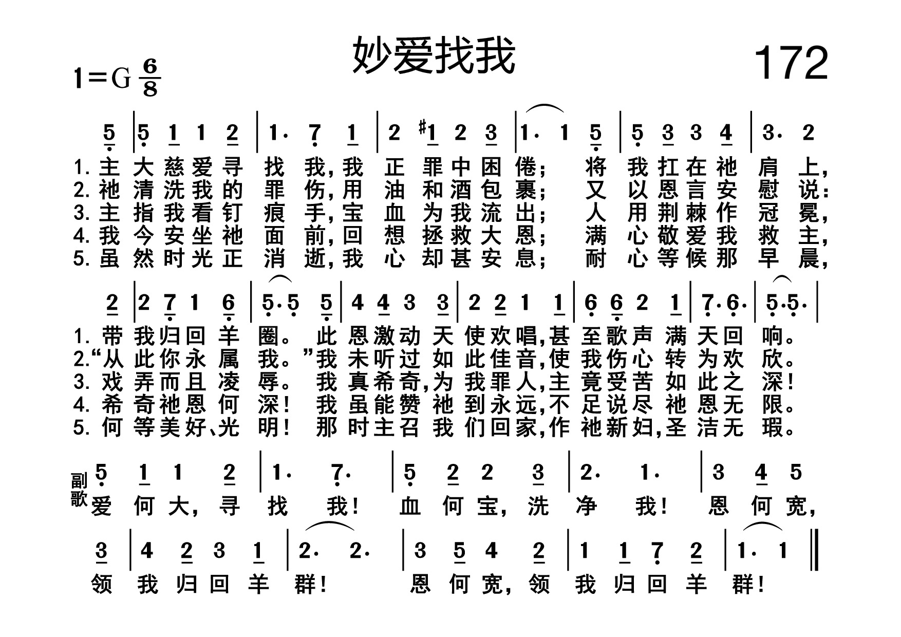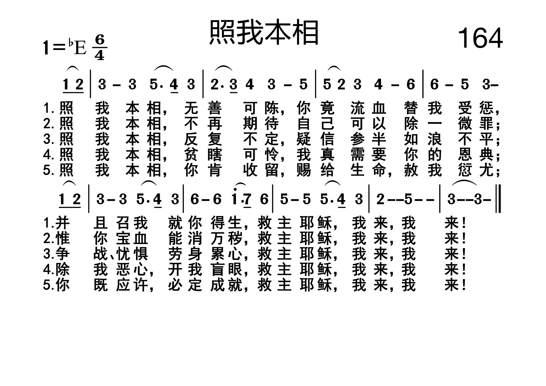 一 你怎没有伤痕?没有伤痕在你肋旁?你名反倒远播四方,你光反倒照射辉煌,你怎没有伤痕? 二 你怎没有伤痕?我是受迫挂在树上,四围尽是残忍、狂妄,我是受尽一切创伤,你怎没有伤痕? 三 怎能你无伤痕?仆人该与主人同样!本该与我同受创伤,而你却是完整无恙!怎能你无伤痕? 四 怎能你无伤痕?他们为我受人捆绑,枷锁、监禁,并且流放,或是舍身,喂狮广场,怎能你无伤痕? 五 你是没有伤痕!我受摧残,饮人锋芒,他们忍受忌恨、刀棒,你却平安,不缺宁康。你却没有伤痕! 六 你却没有伤痕!是否你向世俗依傍,你怕自己利益失丧,远远跟随,不甚明朗,所以没有伤痕? 七 你怎没有伤痕?没有疲倦、只有安享?能否有人忠心,受赏?能否有人跟隧羔羊,而他没有伤痕?