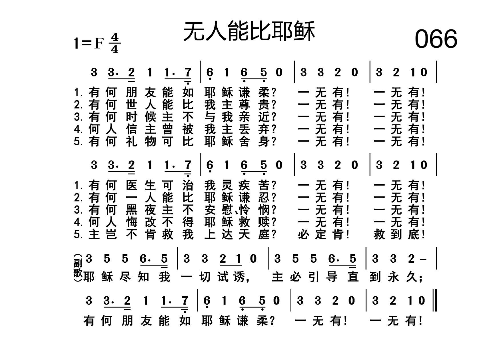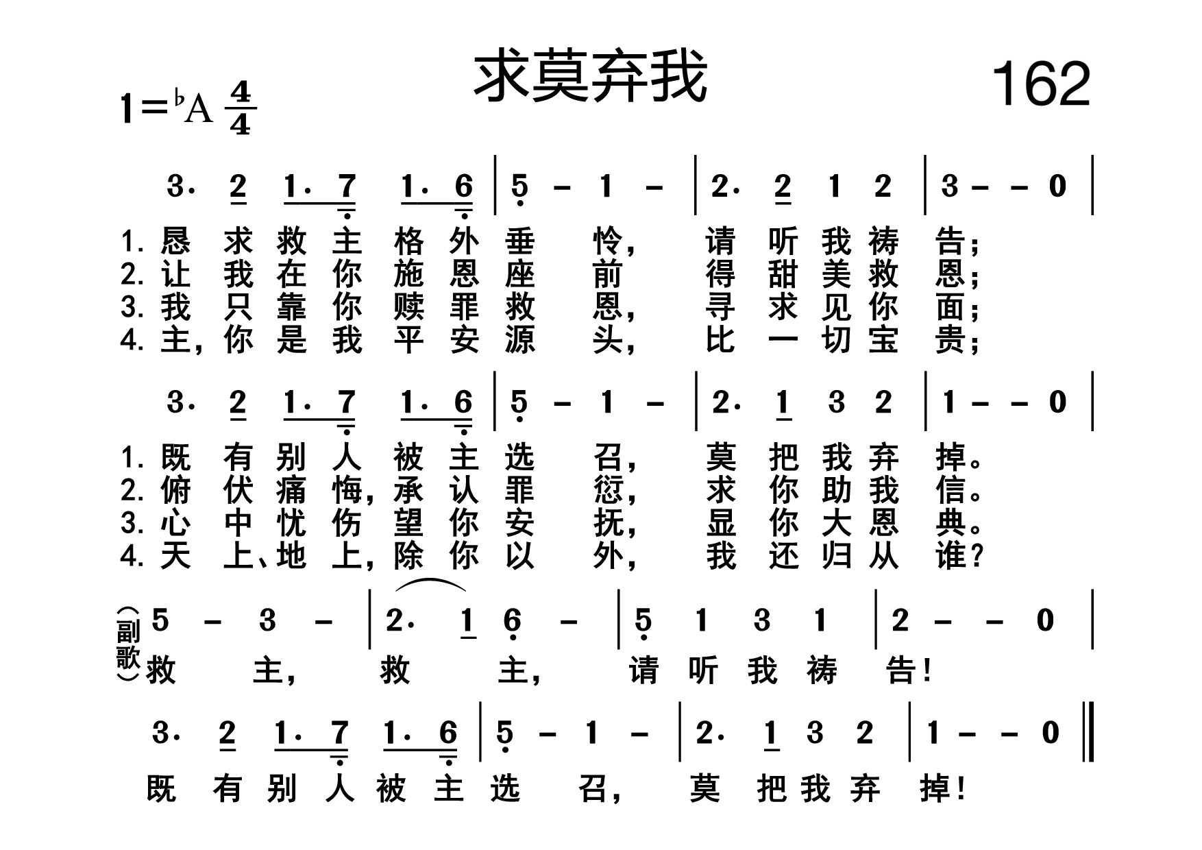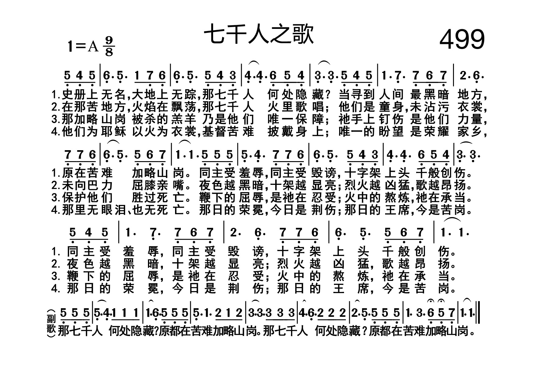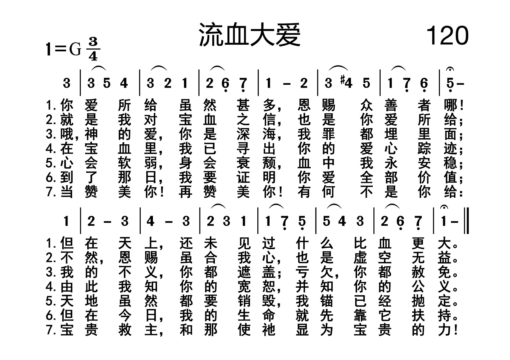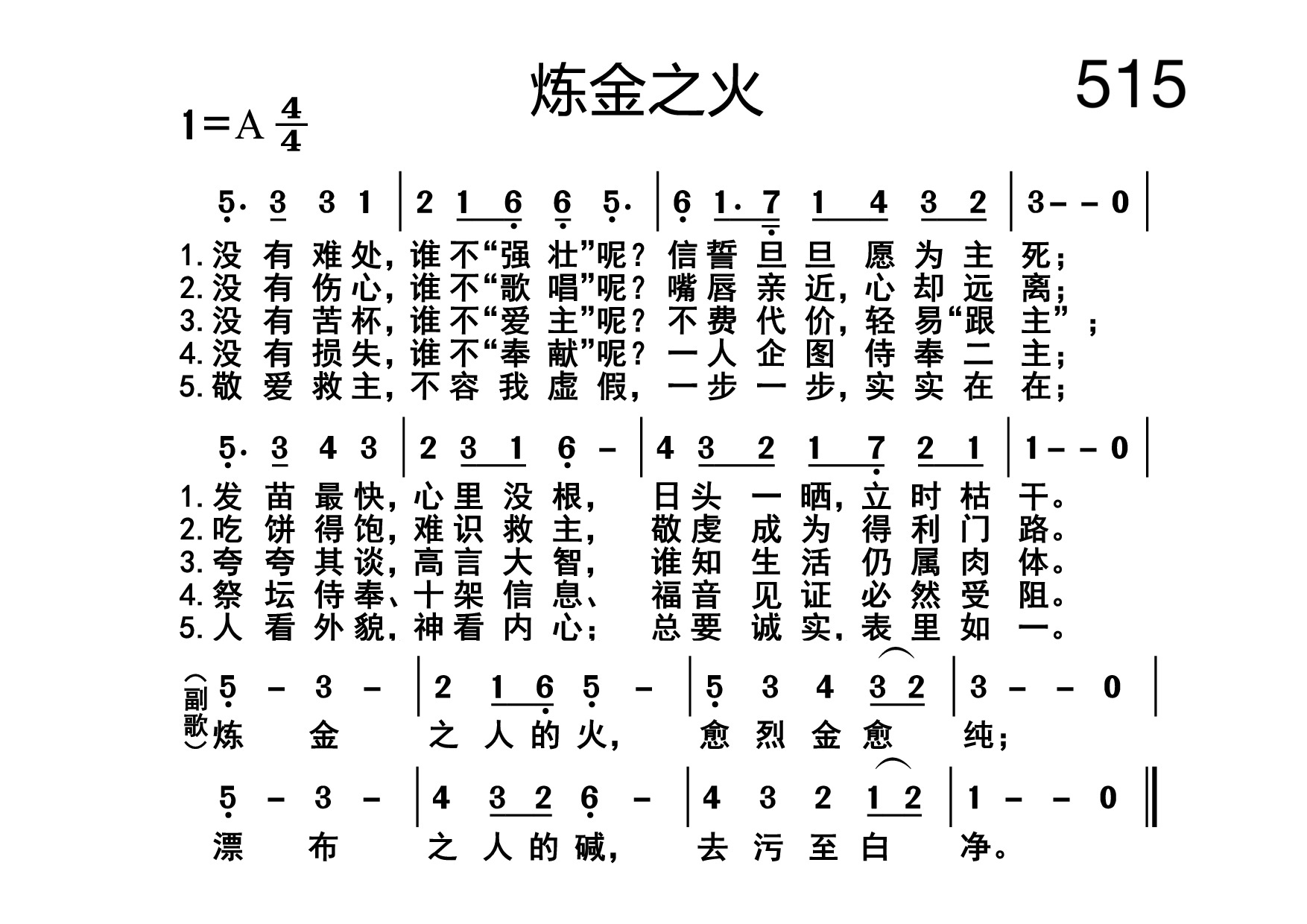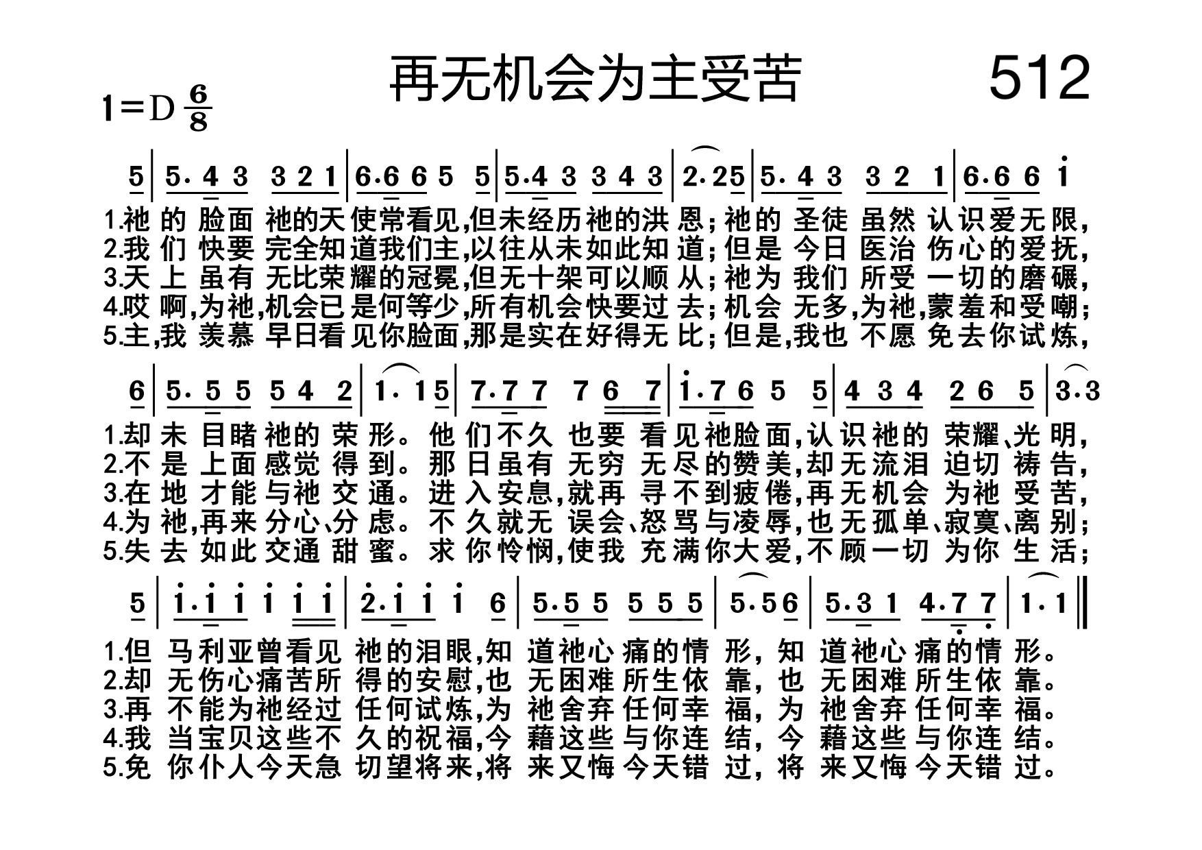 一 你怎没有伤痕?没有伤痕在你肋旁?你名反倒远播四方,你光反倒照射辉煌,你怎没有伤痕? 二 你怎没有伤痕?我是受迫挂在树上,四围尽是残忍、狂妄,我是受尽一切创伤,你怎没有伤痕? 三 怎能你无伤痕?仆人该与主人同样!本该与我同受创伤,而你却是完整无恙!怎能你无伤痕? 四 怎能你无伤痕?他们为我受人捆绑,枷锁、监禁,并且流放,或是舍身,喂狮广场,怎能你无伤痕? 五 你是没有伤痕!我受摧残,饮人锋芒,他们忍受忌恨、刀棒,你却平安,不缺宁康。你却没有伤痕! 六 你却没有伤痕!是否你向世俗依傍,你怕自己利益失丧,远远跟随,不甚明朗,所以没有伤痕? 七 你怎没有伤痕?没有疲倦、只有安享?能否有人忠心,受赏?能否有人跟隧羔羊,而他没有伤痕?