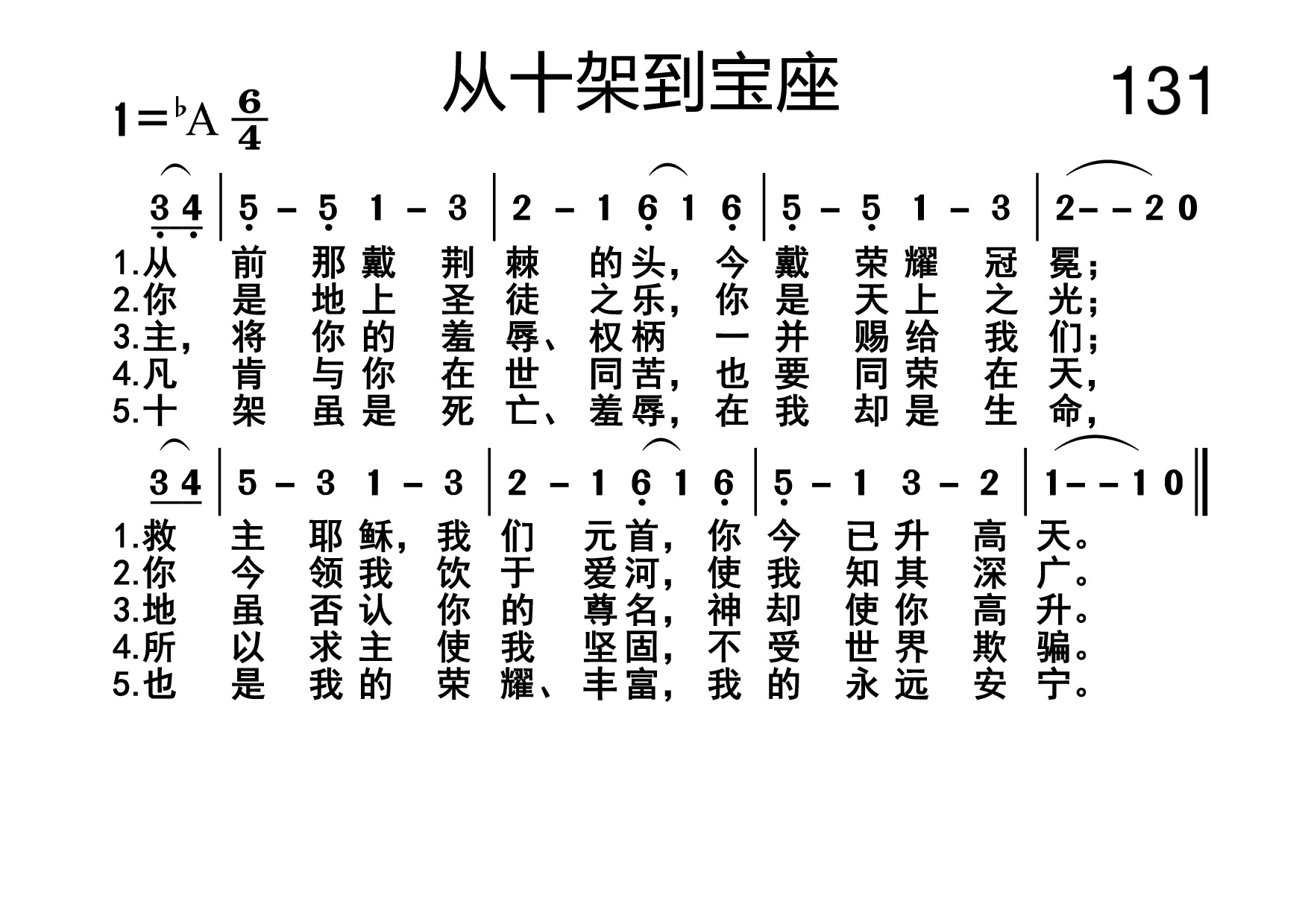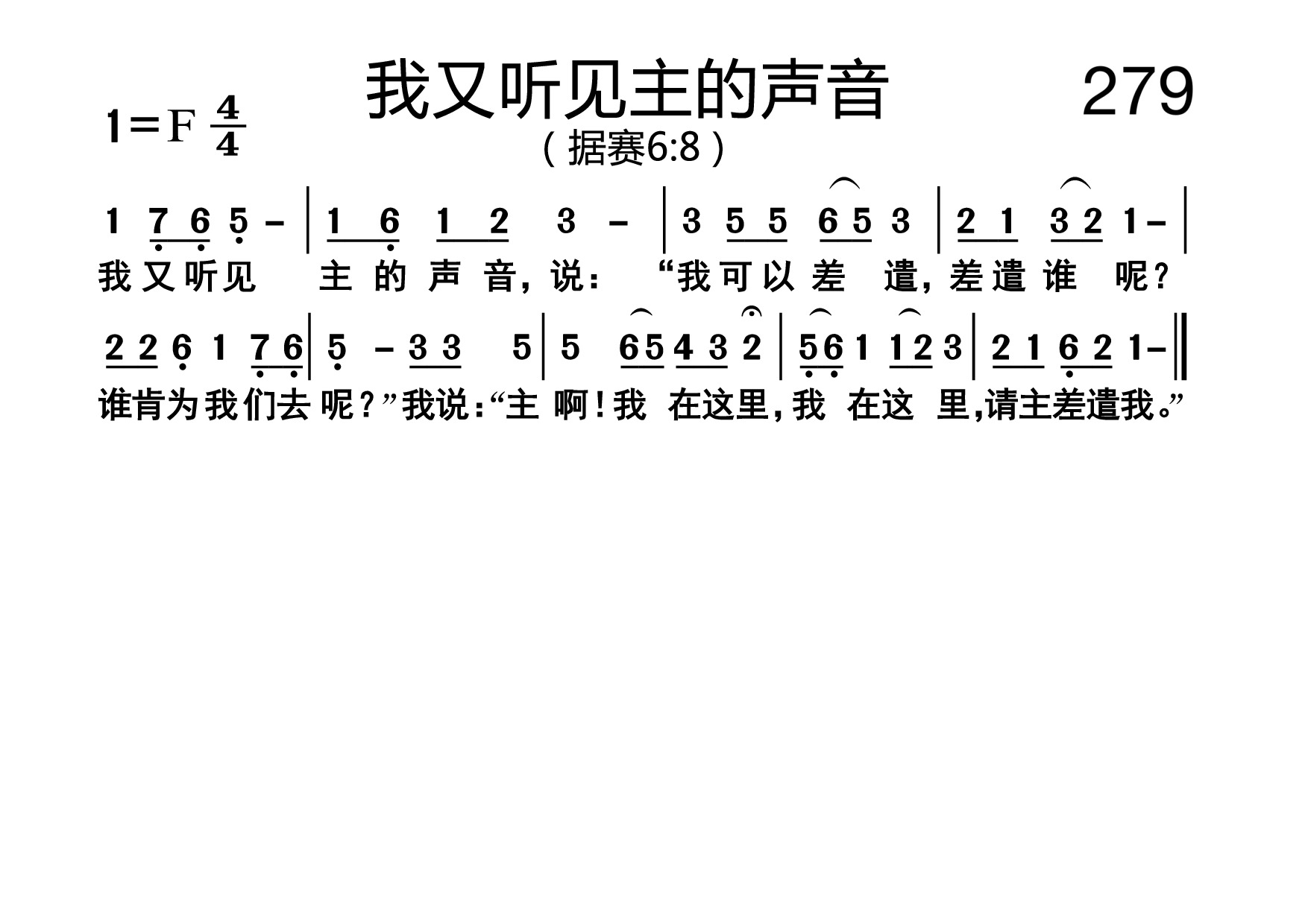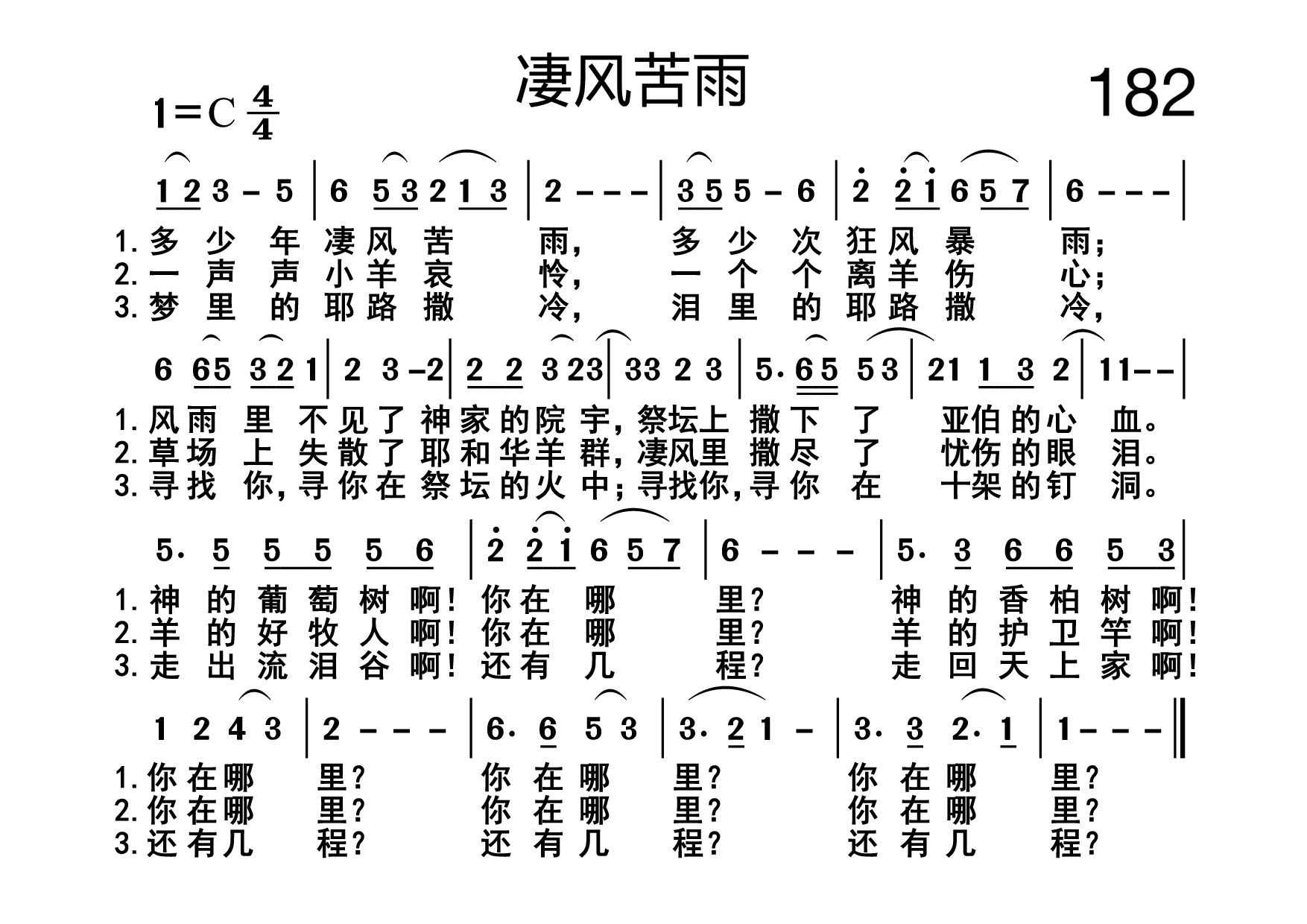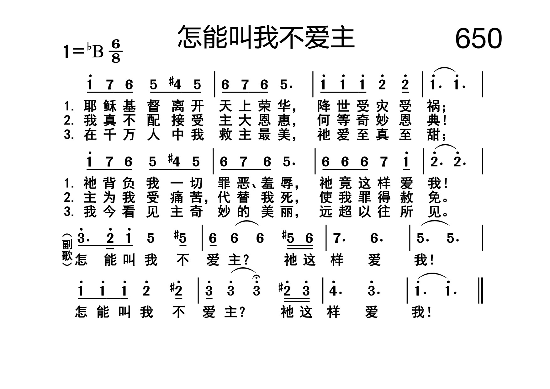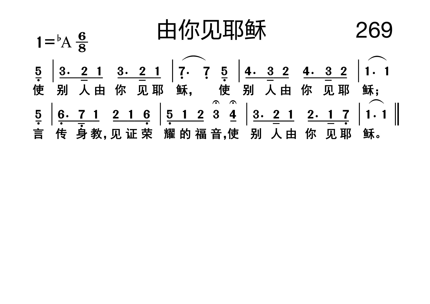一 你怎没有伤痕?没有伤痕在你肋旁?你名反倒远播四方,你光反倒照射辉煌,你怎没有伤痕? 二 你怎没有伤痕?我是受迫挂在树上,四围尽是残忍、狂妄,我是受尽一切创伤,你怎没有伤痕? 三 怎能你无伤痕?仆人该与主人同样!本该与我同受创伤,而你却是完整无恙!怎能你无伤痕? 四 怎能你无伤痕?他们为我受人捆绑,枷锁、监禁,并且流放,或是舍身,喂狮广场,怎能你无伤痕? 五 你是没有伤痕!我受摧残,饮人锋芒,他们忍受忌恨、刀棒,你却平安,不缺宁康。你却没有伤痕! 六 你却没有伤痕!是否你向世俗依傍,你怕自己利益失丧,远远跟随,不甚明朗,所以没有伤痕? 七 你怎没有伤痕?没有疲倦、只有安享?能否有人忠心,受赏?能否有人跟隧羔羊,而他没有伤痕?