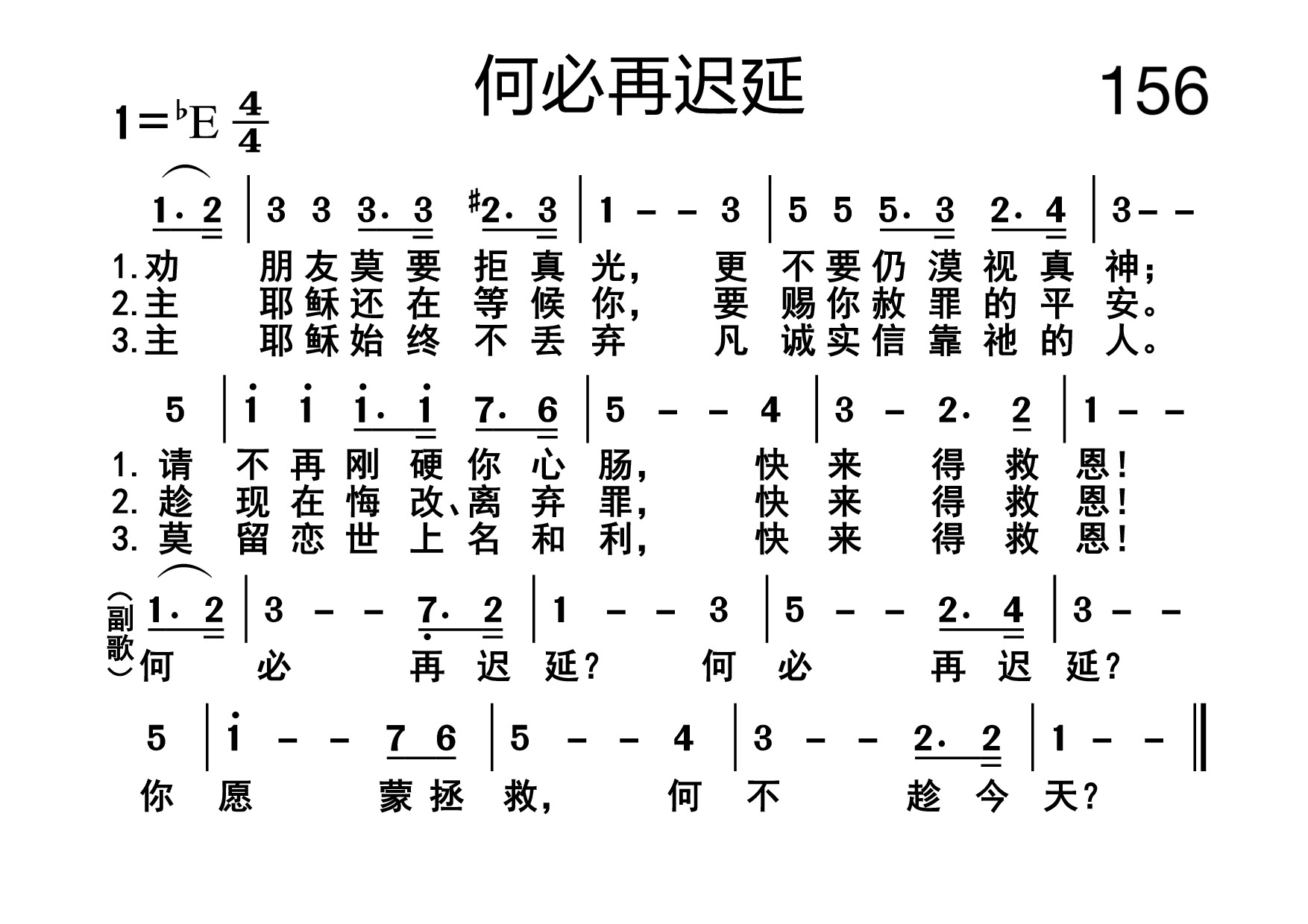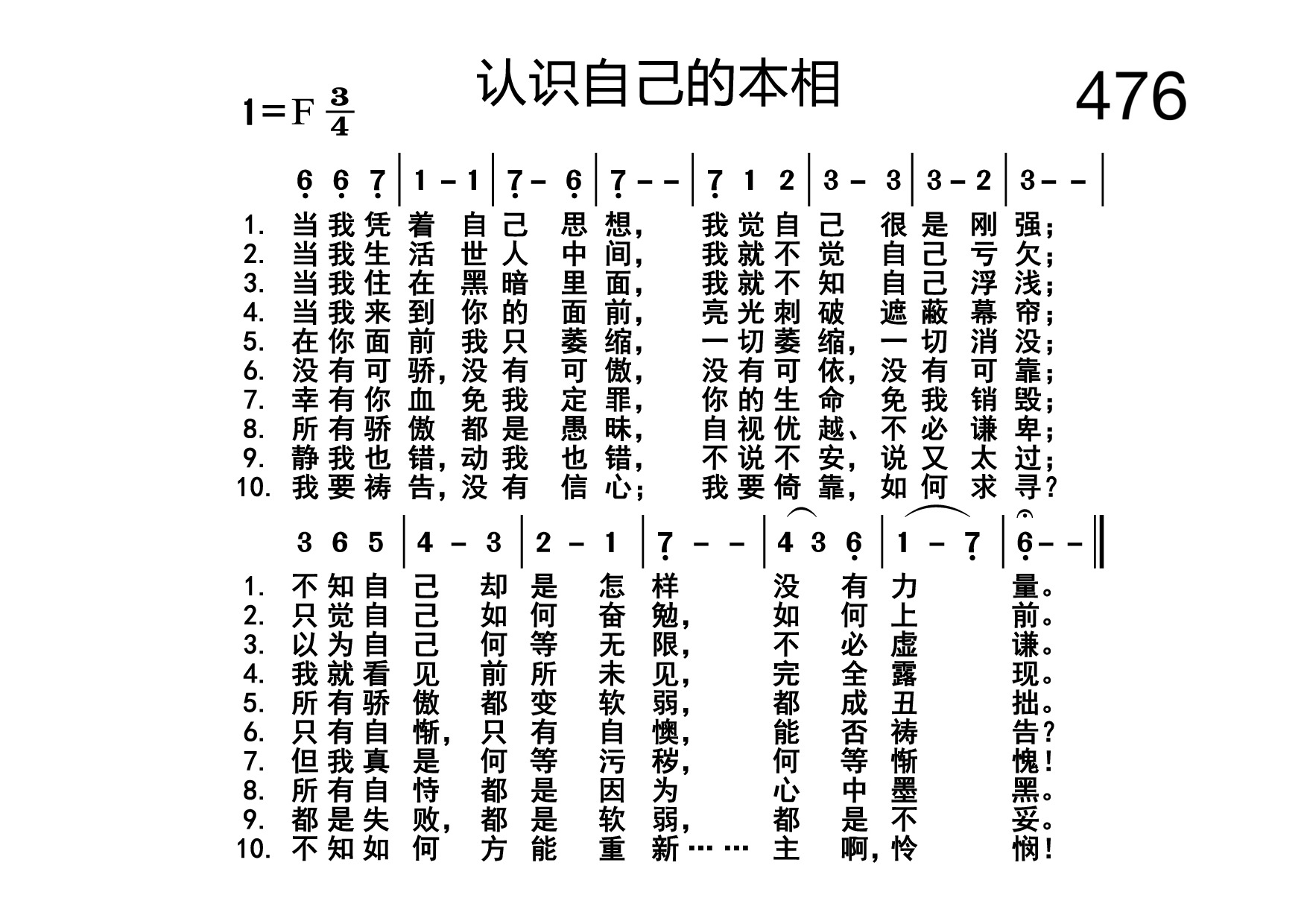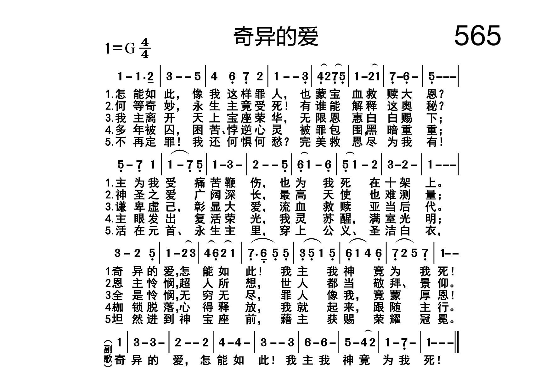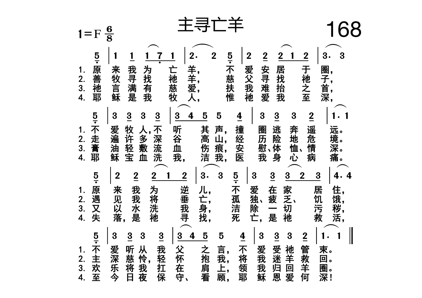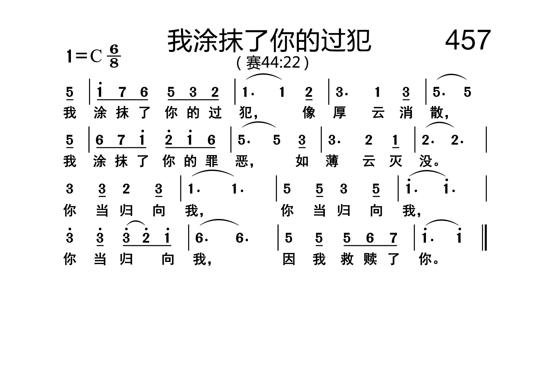 一 你怎没有伤痕?没有伤痕在你肋旁?你名反倒远播四方,你光反倒照射辉煌,你怎没有伤痕? 二 你怎没有伤痕?我是受迫挂在树上,四围尽是残忍、狂妄,我是受尽一切创伤,你怎没有伤痕? 三 怎能你无伤痕?仆人该与主人同样!本该与我同受创伤,而你却是完整无恙!怎能你无伤痕? 四 怎能你无伤痕?他们为我受人捆绑,枷锁、监禁,并且流放,或是舍身,喂狮广场,怎能你无伤痕? 五 你是没有伤痕!我受摧残,饮人锋芒,他们忍受忌恨、刀棒,你却平安,不缺宁康。你却没有伤痕! 六 你却没有伤痕!是否你向世俗依傍,你怕自己利益失丧,远远跟随,不甚明朗,所以没有伤痕? 七 你怎没有伤痕?没有疲倦、只有安享?能否有人忠心,受赏?能否有人跟隧羔羊,而他没有伤痕?