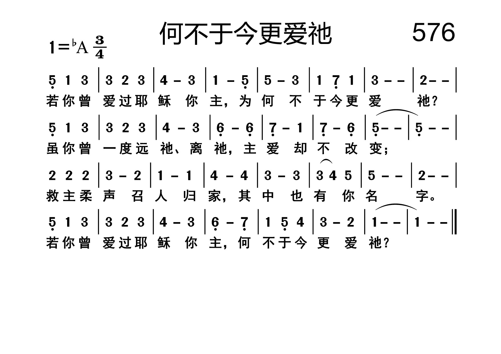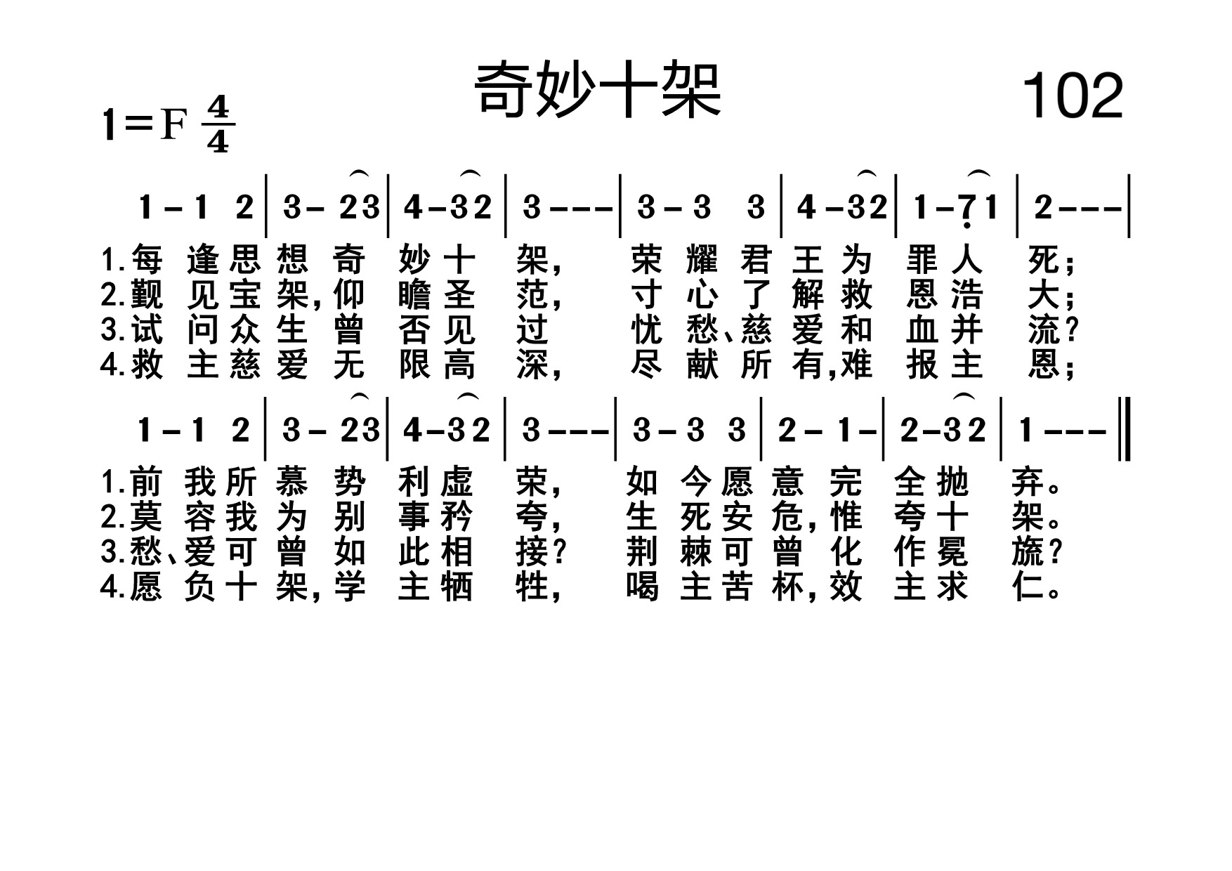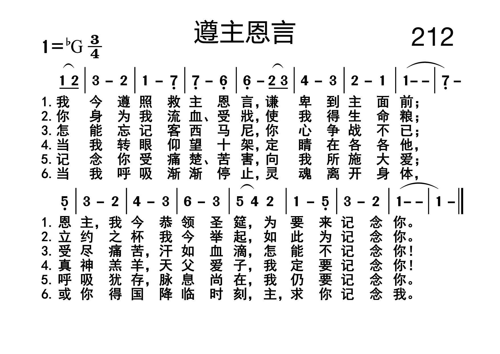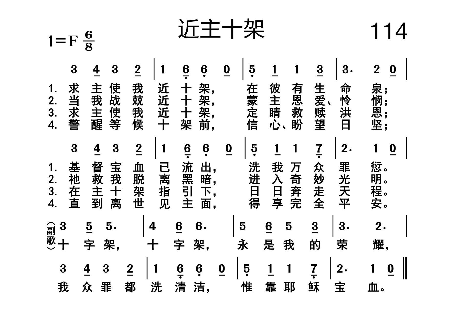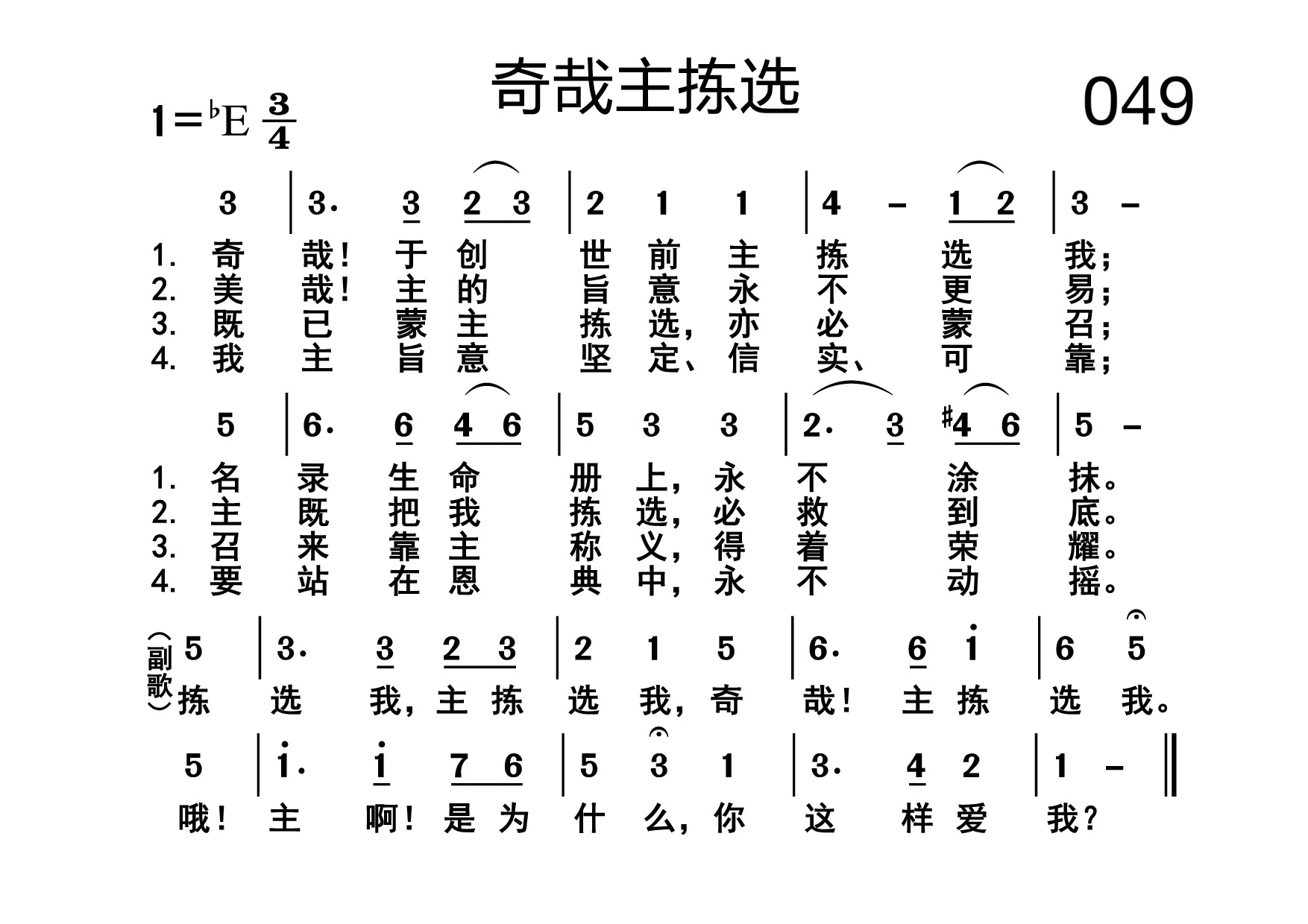 一 你怎没有伤痕?没有伤痕在你肋旁?你名反倒远播四方,你光反倒照射辉煌,你怎没有伤痕? 二 你怎没有伤痕?我是受迫挂在树上,四围尽是残忍、狂妄,我是受尽一切创伤,你怎没有伤痕? 三 怎能你无伤痕?仆人该与主人同样!本该与我同受创伤,而你却是完整无恙!怎能你无伤痕? 四 怎能你无伤痕?他们为我受人捆绑,枷锁、监禁,并且流放,或是舍身,喂狮广场,怎能你无伤痕? 五 你是没有伤痕!我受摧残,饮人锋芒,他们忍受忌恨、刀棒,你却平安,不缺宁康。你却没有伤痕! 六 你却没有伤痕!是否你向世俗依傍,你怕自己利益失丧,远远跟随,不甚明朗,所以没有伤痕? 七 你怎没有伤痕?没有疲倦、只有安享?能否有人忠心,受赏?能否有人跟隧羔羊,而他没有伤痕?