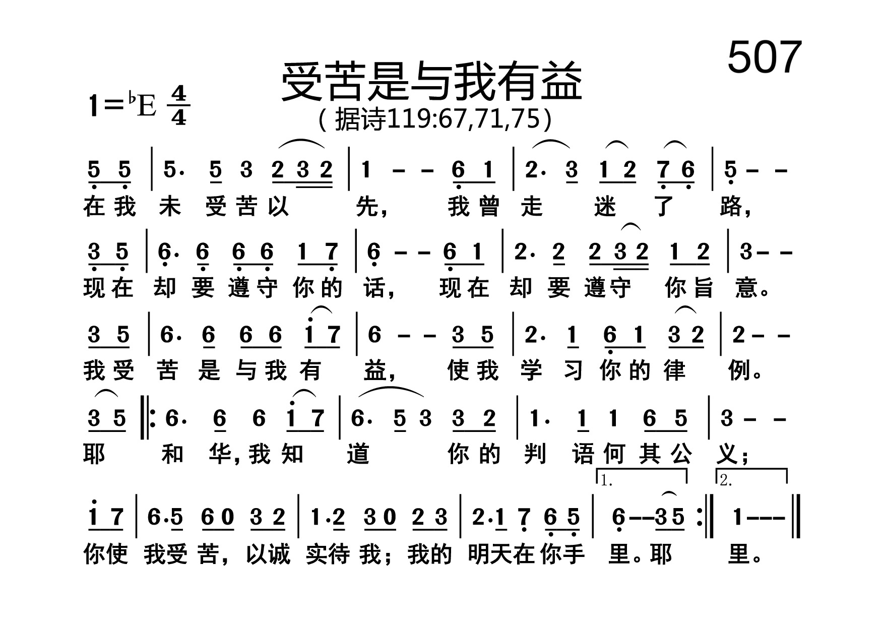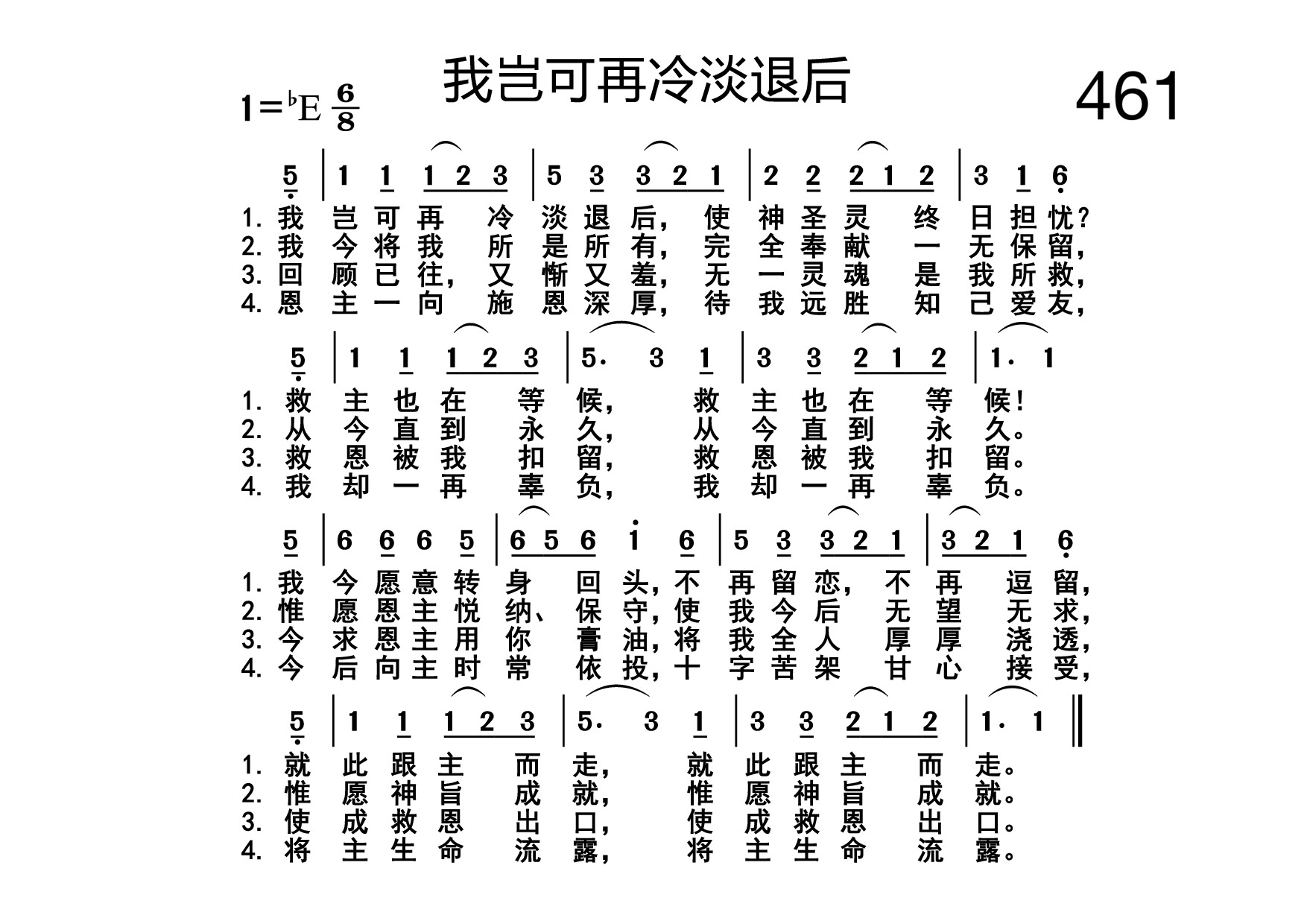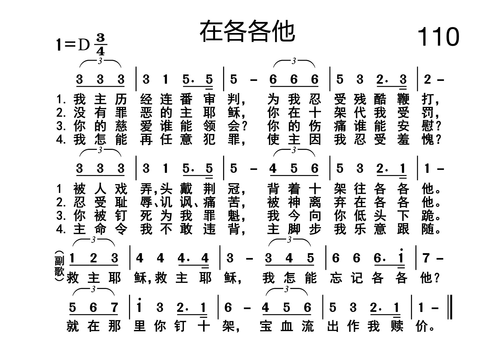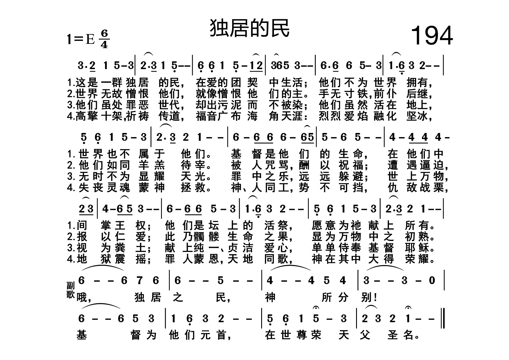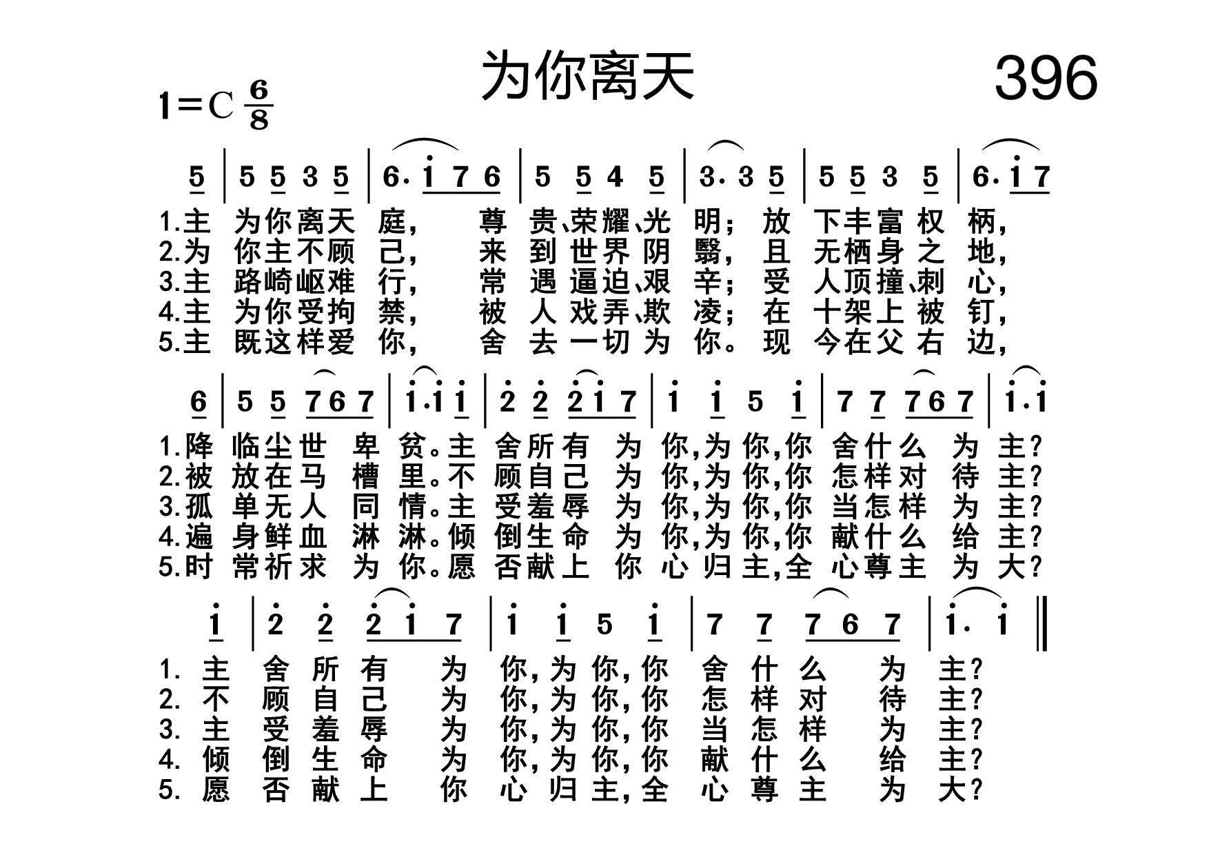 一 你怎没有伤痕?没有伤痕在你肋旁?你名反倒远播四方,你光反倒照射辉煌,你怎没有伤痕? 二 你怎没有伤痕?我是受迫挂在树上,四围尽是残忍、狂妄,我是受尽一切创伤,你怎没有伤痕? 三 怎能你无伤痕?仆人该与主人同样!本该与我同受创伤,而你却是完整无恙!怎能你无伤痕? 四 怎能你无伤痕?他们为我受人捆绑,枷锁、监禁,并且流放,或是舍身,喂狮广场,怎能你无伤痕? 五 你是没有伤痕!我受摧残,饮人锋芒,他们忍受忌恨、刀棒,你却平安,不缺宁康。你却没有伤痕! 六 你却没有伤痕!是否你向世俗依傍,你怕自己利益失丧,远远跟随,不甚明朗,所以没有伤痕? 七 你怎没有伤痕?没有疲倦、只有安享?能否有人忠心,受赏?能否有人跟隧羔羊,而他没有伤痕?