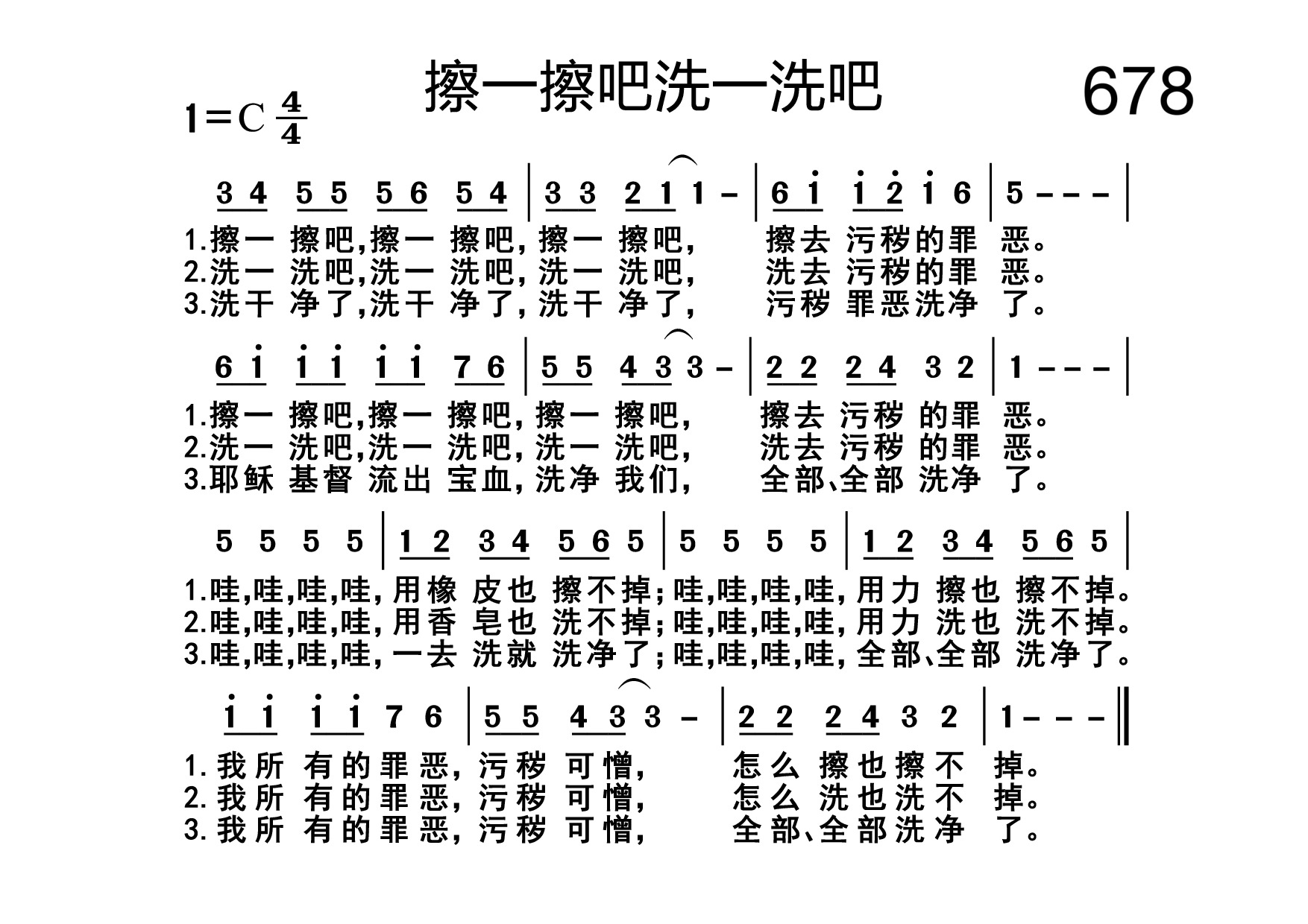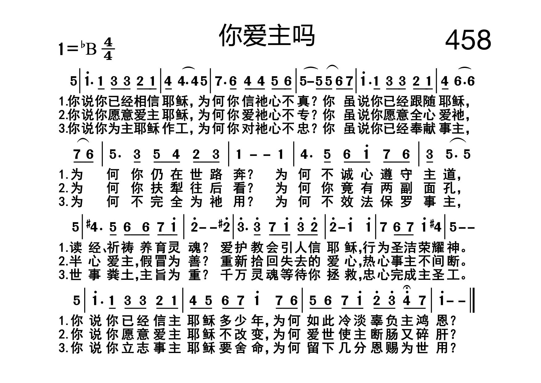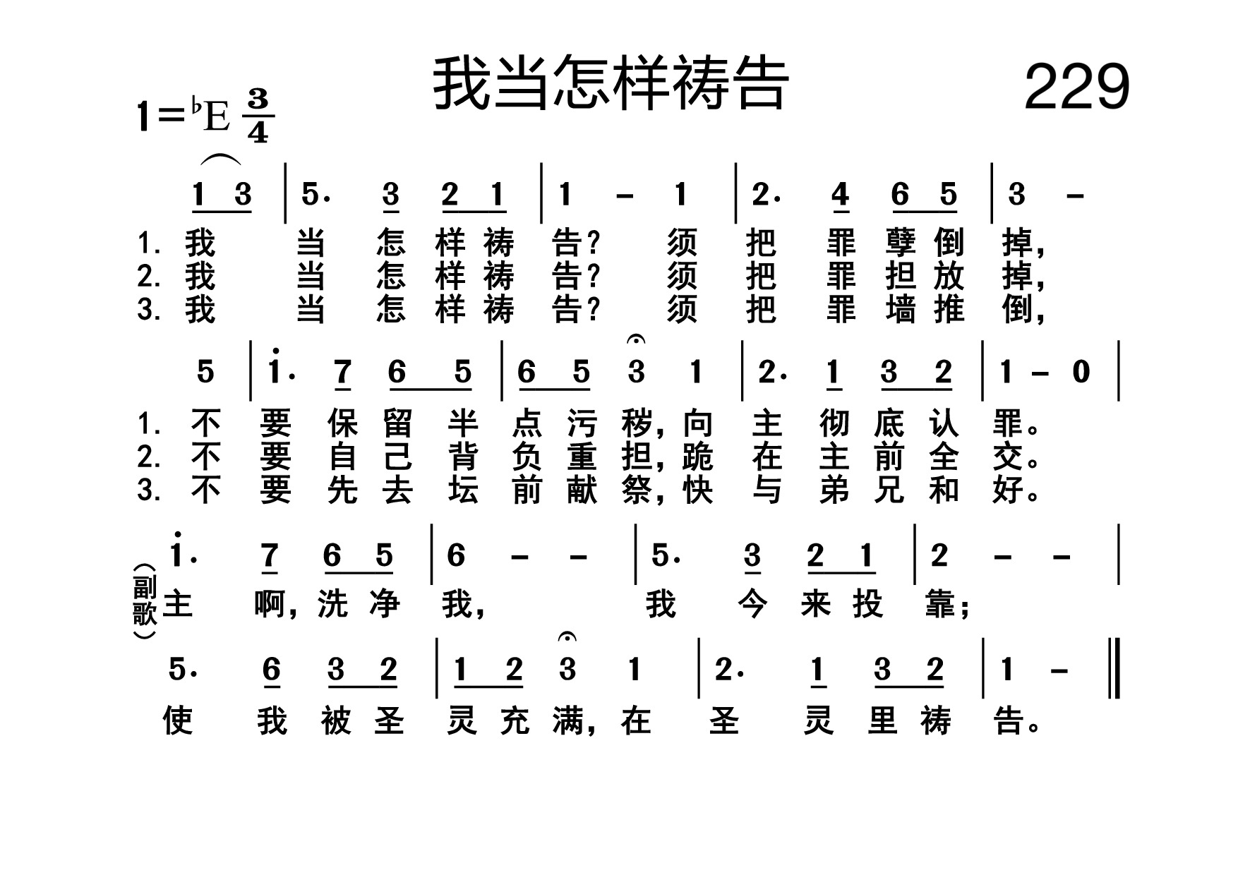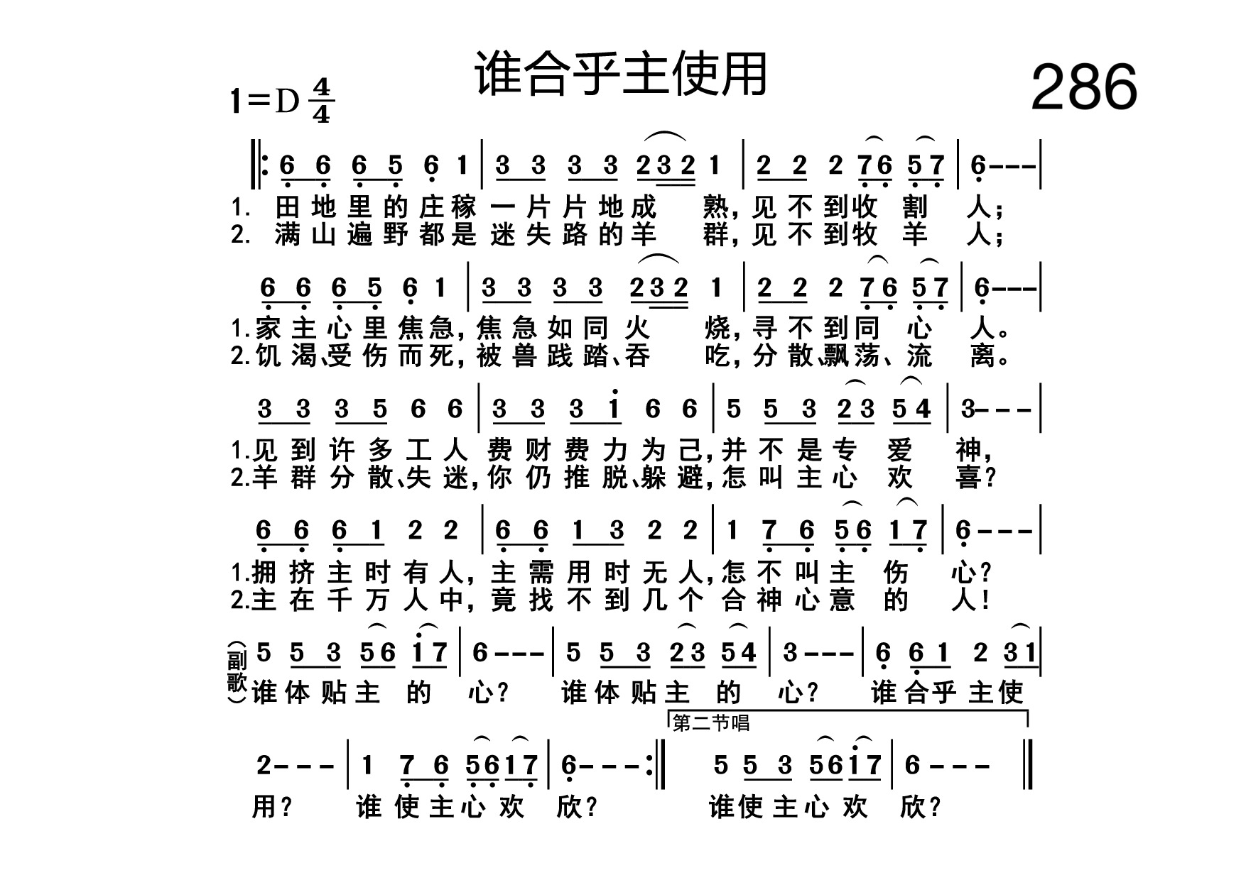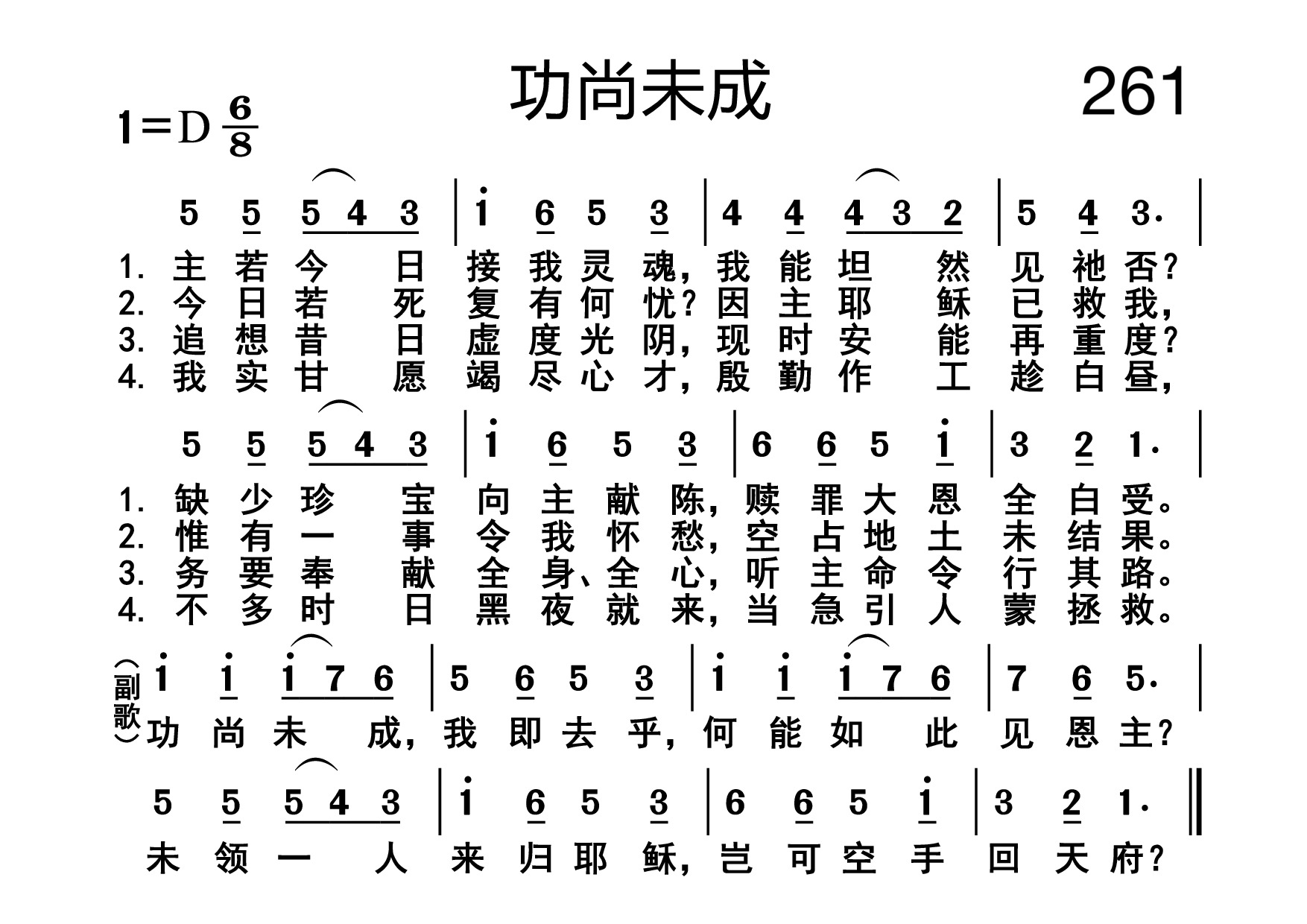 一 你怎没有伤痕?没有伤痕在你肋旁?你名反倒远播四方,你光反倒照射辉煌,你怎没有伤痕? 二 你怎没有伤痕?我是受迫挂在树上,四围尽是残忍、狂妄,我是受尽一切创伤,你怎没有伤痕? 三 怎能你无伤痕?仆人该与主人同样!本该与我同受创伤,而你却是完整无恙!怎能你无伤痕? 四 怎能你无伤痕?他们为我受人捆绑,枷锁、监禁,并且流放,或是舍身,喂狮广场,怎能你无伤痕? 五 你是没有伤痕!我受摧残,饮人锋芒,他们忍受忌恨、刀棒,你却平安,不缺宁康。你却没有伤痕! 六 你却没有伤痕!是否你向世俗依傍,你怕自己利益失丧,远远跟随,不甚明朗,所以没有伤痕? 七 你怎没有伤痕?没有疲倦、只有安享?能否有人忠心,受赏?能否有人跟隧羔羊,而他没有伤痕?