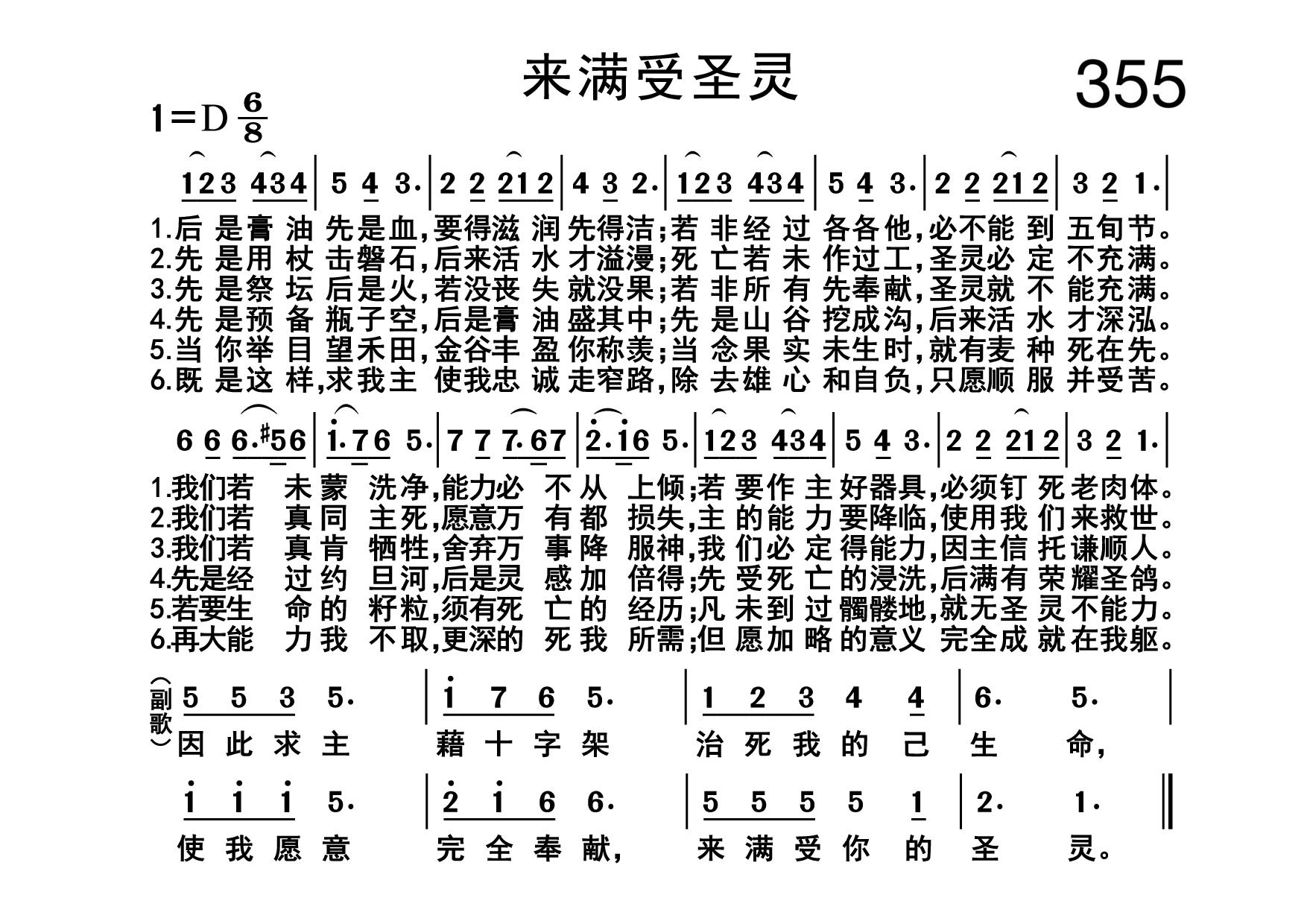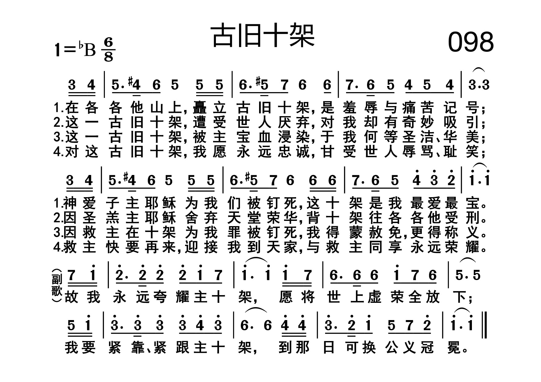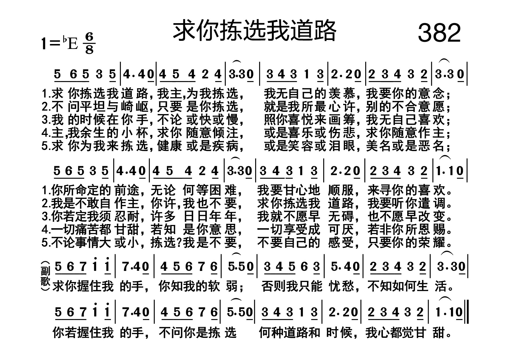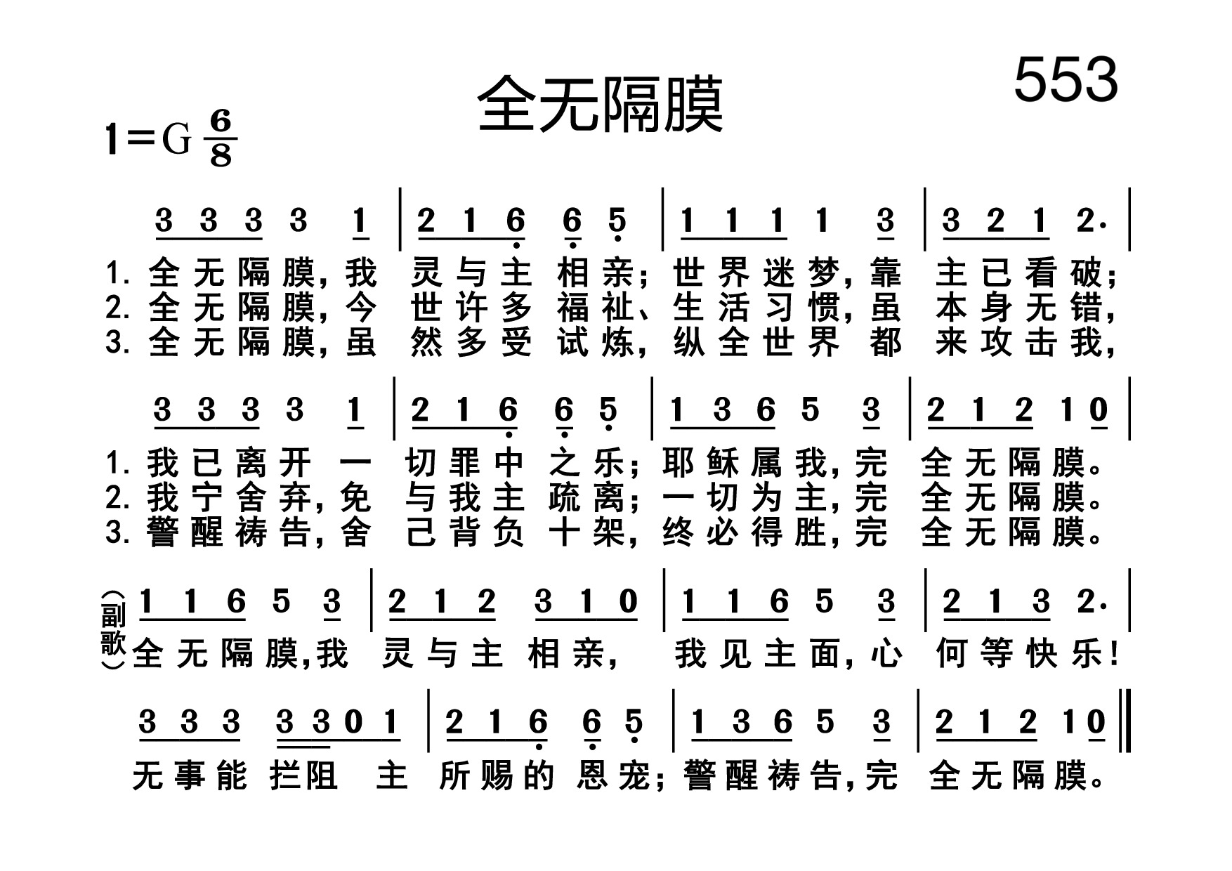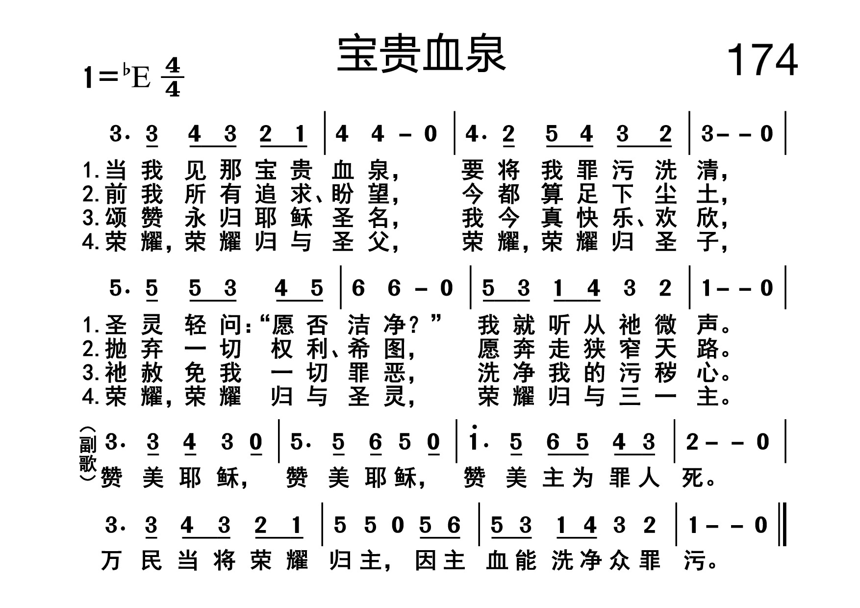 一 你怎没有伤痕?没有伤痕在你肋旁?你名反倒远播四方,你光反倒照射辉煌,你怎没有伤痕? 二 你怎没有伤痕?我是受迫挂在树上,四围尽是残忍、狂妄,我是受尽一切创伤,你怎没有伤痕? 三 怎能你无伤痕?仆人该与主人同样!本该与我同受创伤,而你却是完整无恙!怎能你无伤痕? 四 怎能你无伤痕?他们为我受人捆绑,枷锁、监禁,并且流放,或是舍身,喂狮广场,怎能你无伤痕? 五 你是没有伤痕!我受摧残,饮人锋芒,他们忍受忌恨、刀棒,你却平安,不缺宁康。你却没有伤痕! 六 你却没有伤痕!是否你向世俗依傍,你怕自己利益失丧,远远跟随,不甚明朗,所以没有伤痕? 七 你怎没有伤痕?没有疲倦、只有安享?能否有人忠心,受赏?能否有人跟隧羔羊,而他没有伤痕?