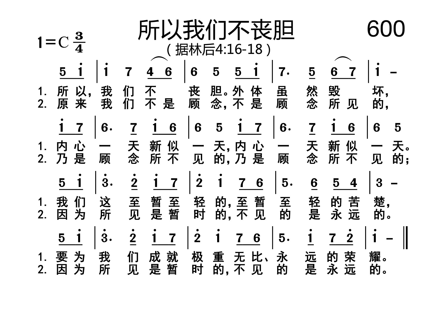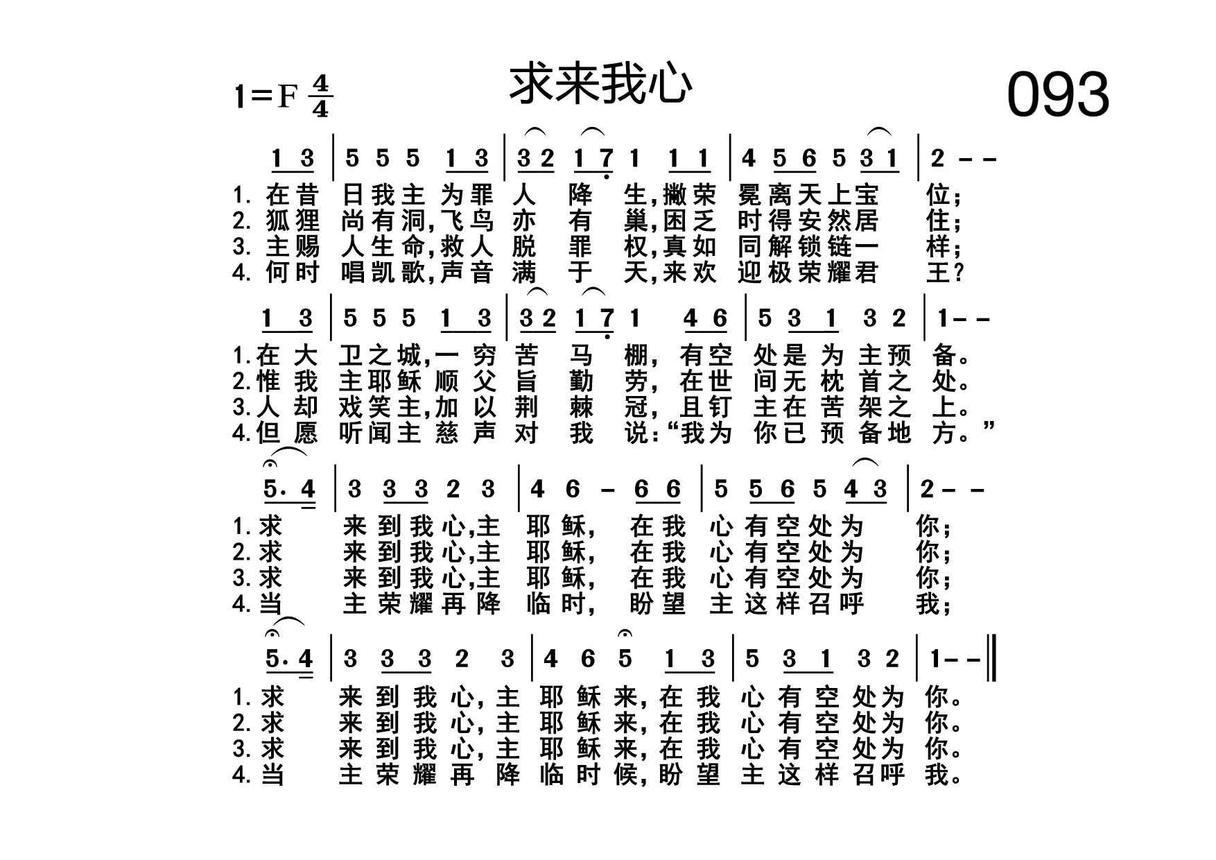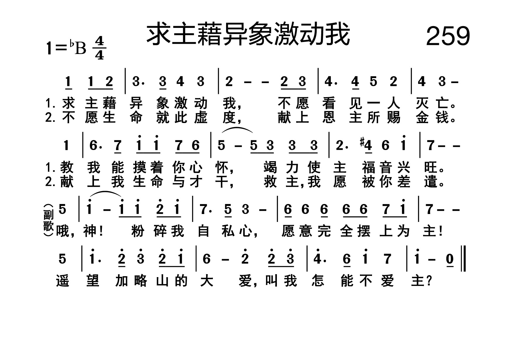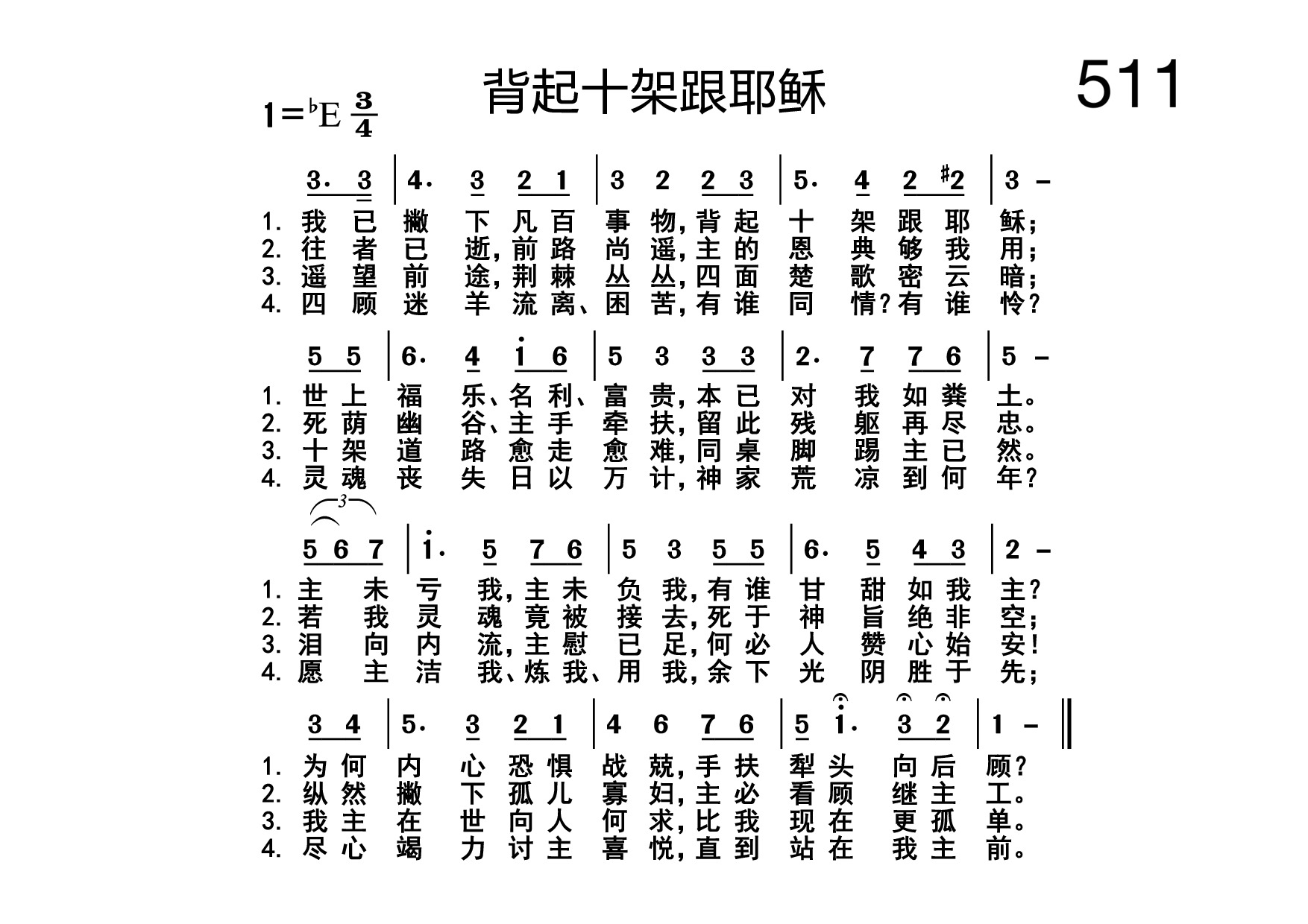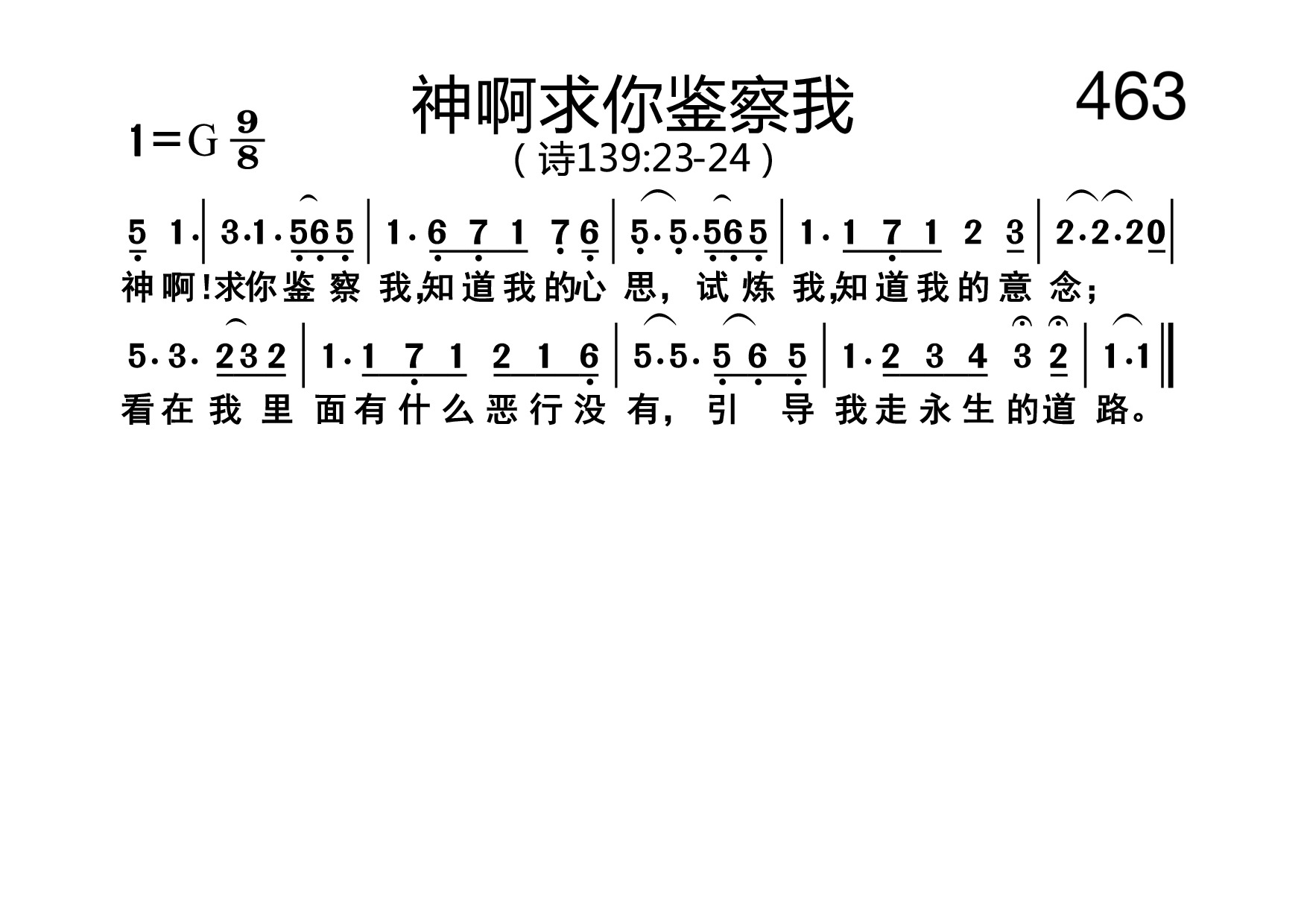 一 你怎没有伤痕?没有伤痕在你肋旁?你名反倒远播四方,你光反倒照射辉煌,你怎没有伤痕? 二 你怎没有伤痕?我是受迫挂在树上,四围尽是残忍、狂妄,我是受尽一切创伤,你怎没有伤痕? 三 怎能你无伤痕?仆人该与主人同样!本该与我同受创伤,而你却是完整无恙!怎能你无伤痕? 四 怎能你无伤痕?他们为我受人捆绑,枷锁、监禁,并且流放,或是舍身,喂狮广场,怎能你无伤痕? 五 你是没有伤痕!我受摧残,饮人锋芒,他们忍受忌恨、刀棒,你却平安,不缺宁康。你却没有伤痕! 六 你却没有伤痕!是否你向世俗依傍,你怕自己利益失丧,远远跟随,不甚明朗,所以没有伤痕? 七 你怎没有伤痕?没有疲倦、只有安享?能否有人忠心,受赏?能否有人跟隧羔羊,而他没有伤痕?