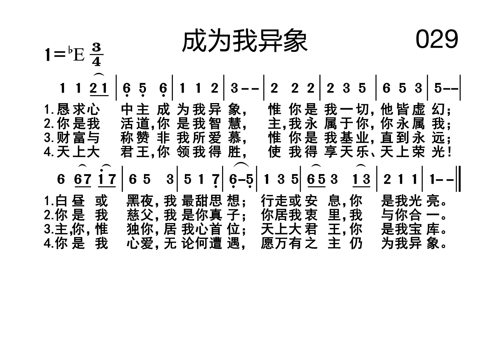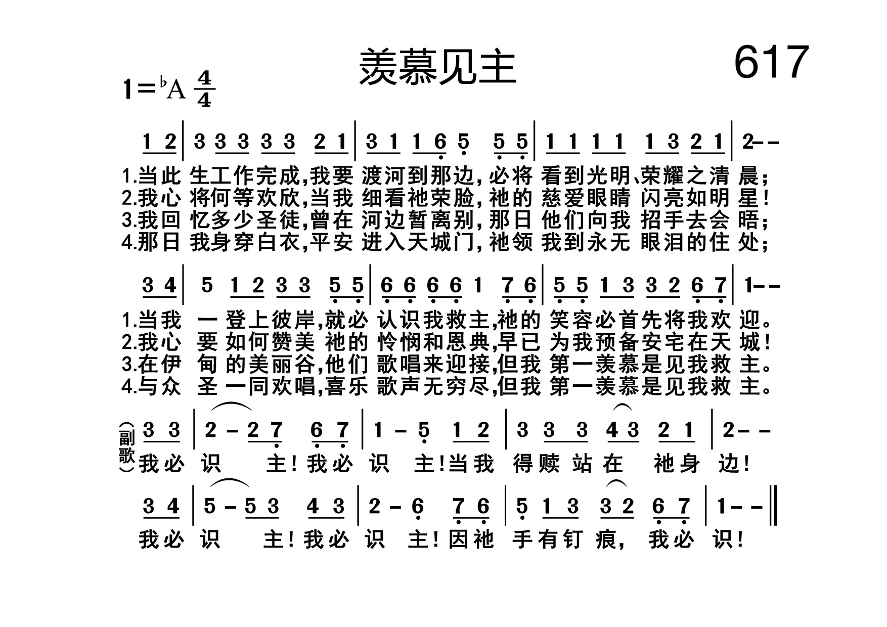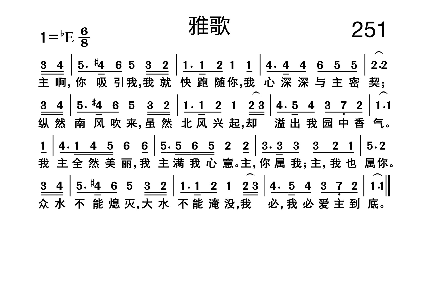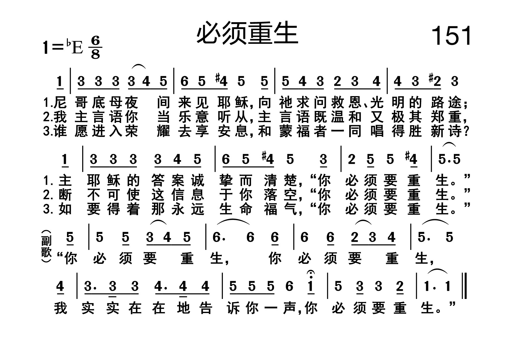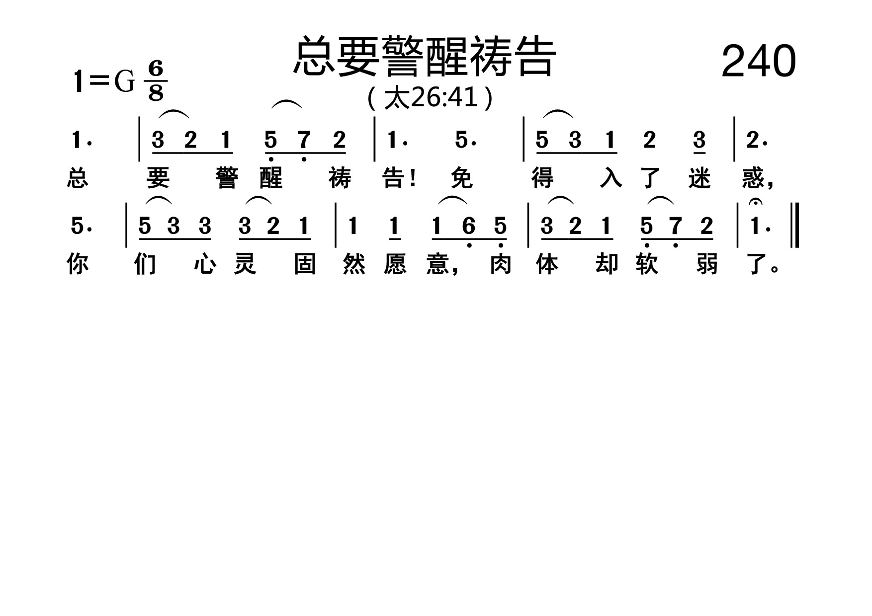 一 你怎没有伤痕?没有伤痕在你肋旁?你名反倒远播四方,你光反倒照射辉煌,你怎没有伤痕? 二 你怎没有伤痕?我是受迫挂在树上,四围尽是残忍、狂妄,我是受尽一切创伤,你怎没有伤痕? 三 怎能你无伤痕?仆人该与主人同样!本该与我同受创伤,而你却是完整无恙!怎能你无伤痕? 四 怎能你无伤痕?他们为我受人捆绑,枷锁、监禁,并且流放,或是舍身,喂狮广场,怎能你无伤痕? 五 你是没有伤痕!我受摧残,饮人锋芒,他们忍受忌恨、刀棒,你却平安,不缺宁康。你却没有伤痕! 六 你却没有伤痕!是否你向世俗依傍,你怕自己利益失丧,远远跟随,不甚明朗,所以没有伤痕? 七 你怎没有伤痕?没有疲倦、只有安享?能否有人忠心,受赏?能否有人跟隧羔羊,而他没有伤痕?