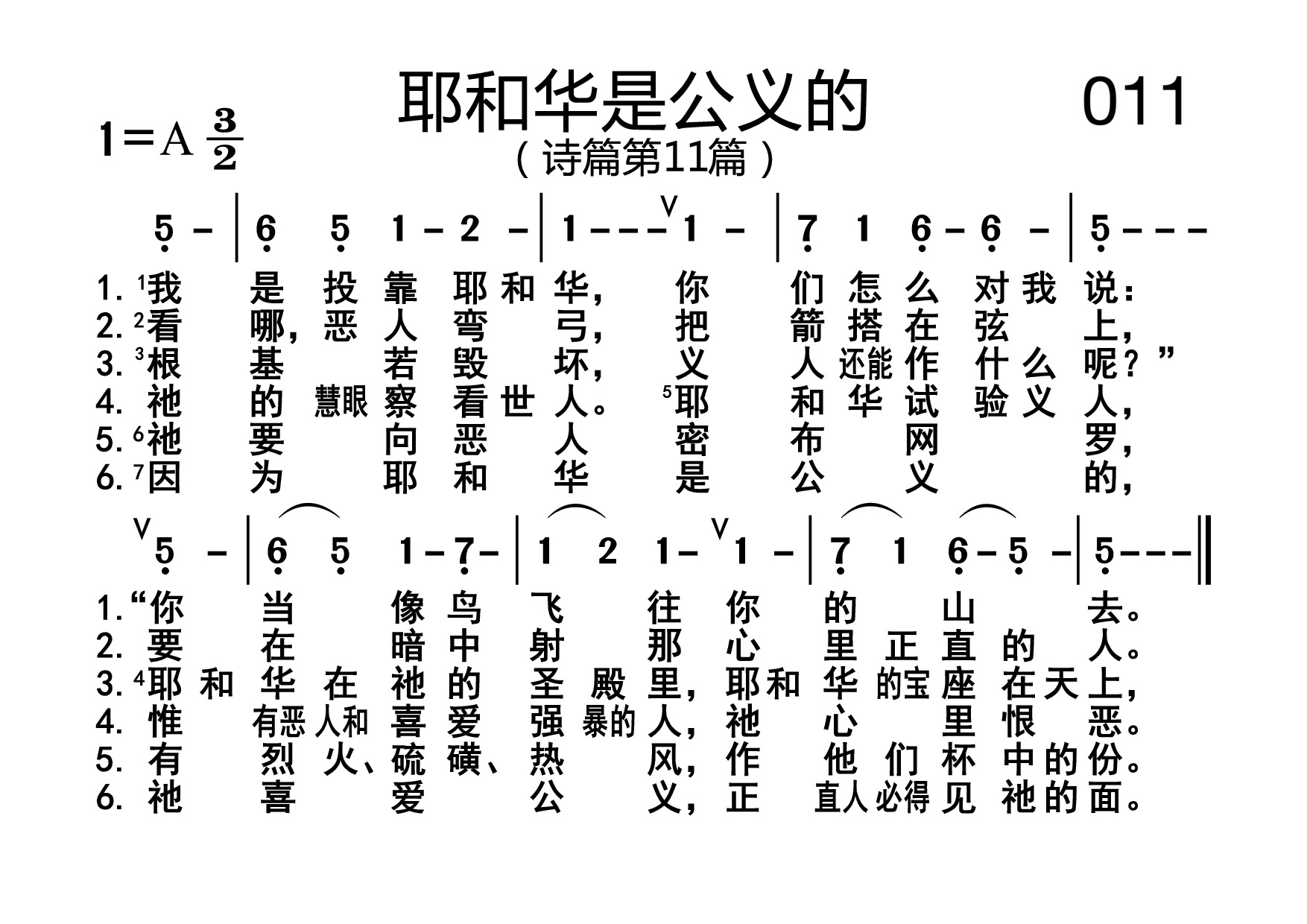 我是投靠耶和华,你们怎么对我说:“你当像鸟飞往你的山去;看哪,恶人弯弓,把箭搭在弦上,要在暗中射那心里正直的人。根基若毁坏,义人还能作什么呢?”耶和华在他的圣殿里,耶和华的宝座在天上,他的慧眼察看世人。耶和华试验义人,惟有恶人和喜爱强暴的人,他心里恨恶。他要向恶人密布网罗,有烈火、硫磺、热风作他们杯中的份。因为耶和华是公义的,他喜爱公义,正直人必得见他的面。