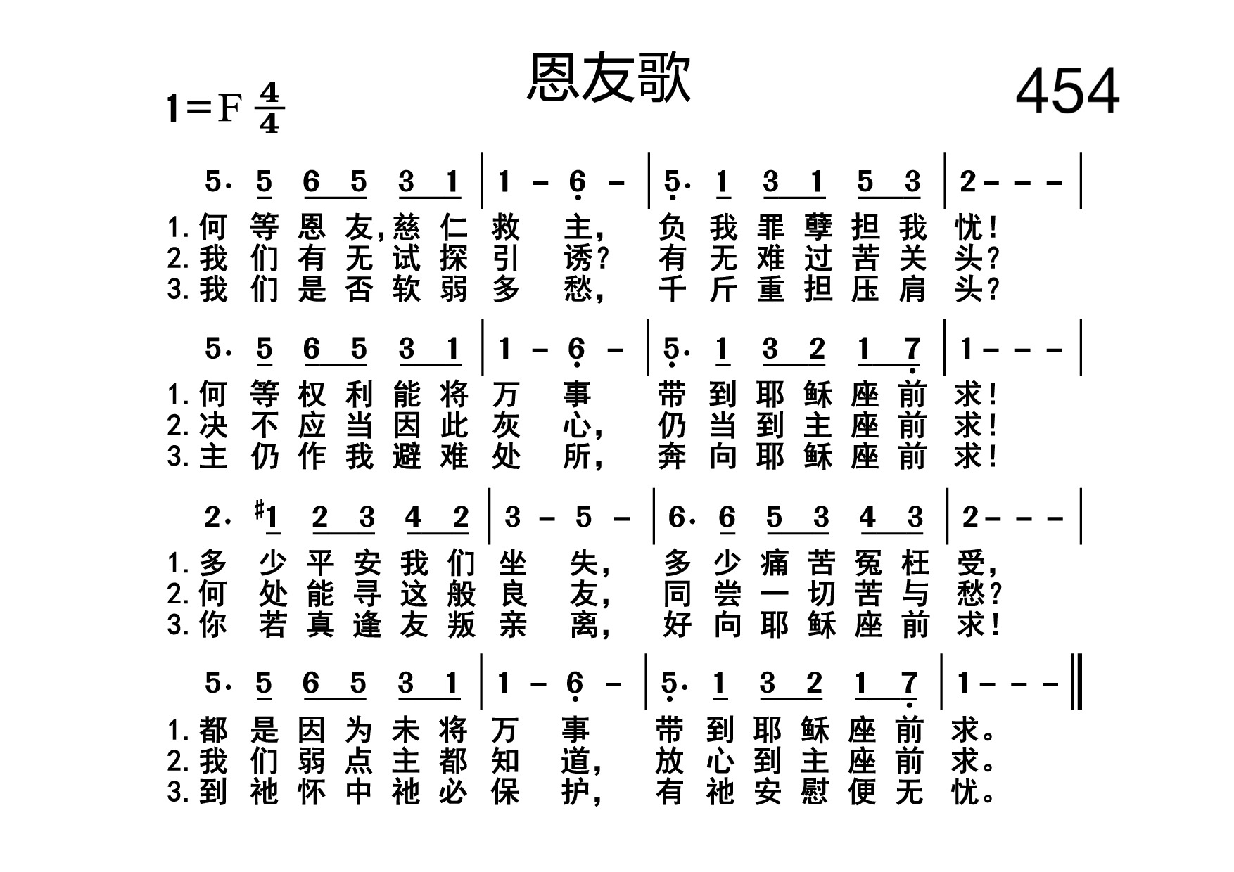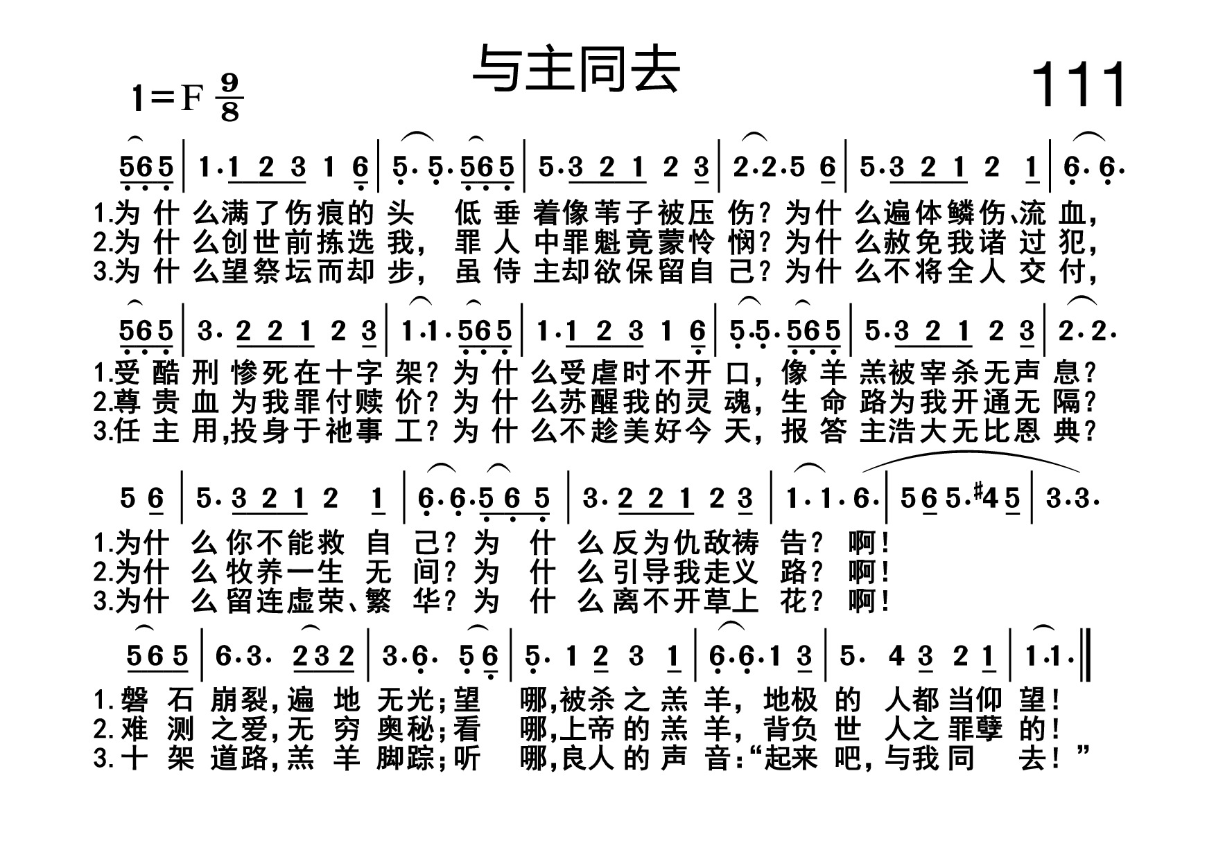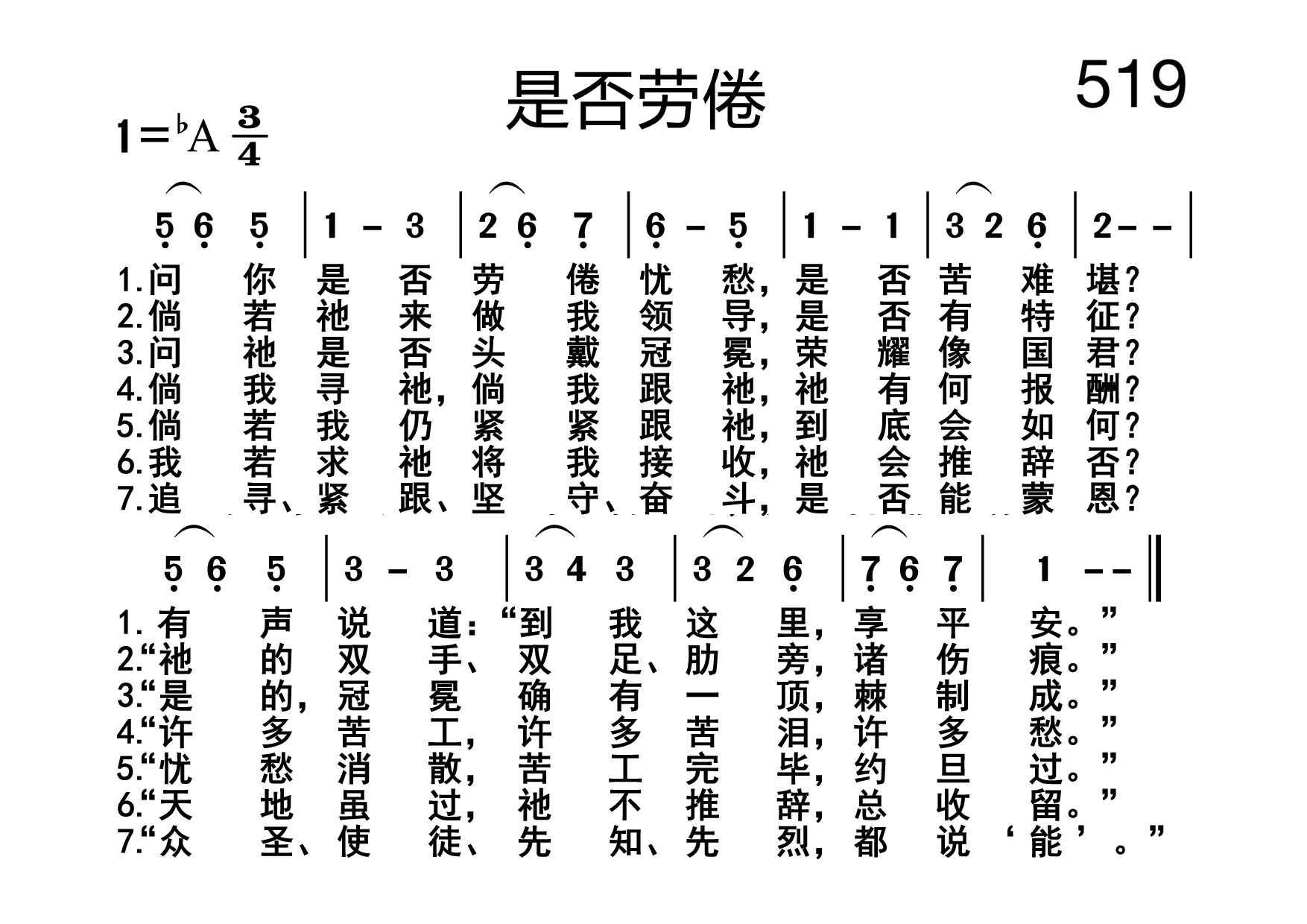 问你是否劳倦忧愁是否苦难堪 有声说道到我这里 享平安倘若他来做我领导是否有特征他的双手双足肋旁诸伤痕问他是否头戴冠冕荣耀象国君是的 冠冕确有一顶棘制成倘我寻他 倘我跟他他有何报酬 许多苦工许多苦泪 许多愁倘若我仍紧紧跟他到底会如何 忧愁消散苦工完毕 约但过我若归依 求他接收他会推辞否 天地虽过他不推辞 总收留追寻紧跟珍存奋争是否能蒙恩众圣使徒先知先烈都说能