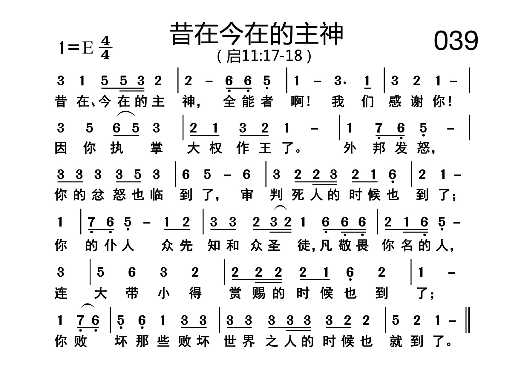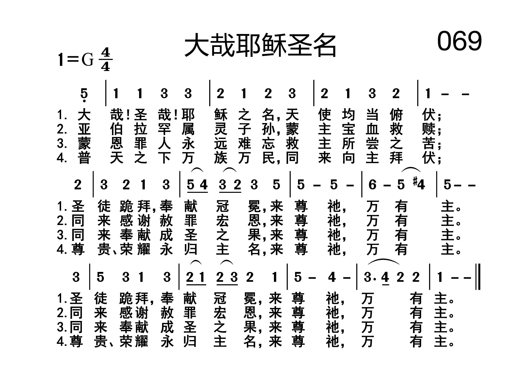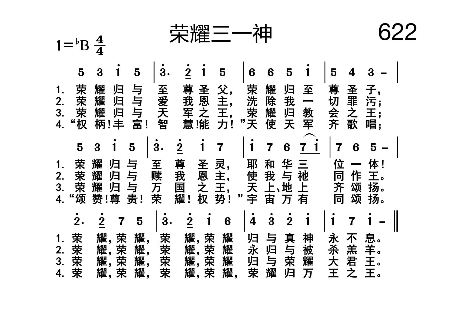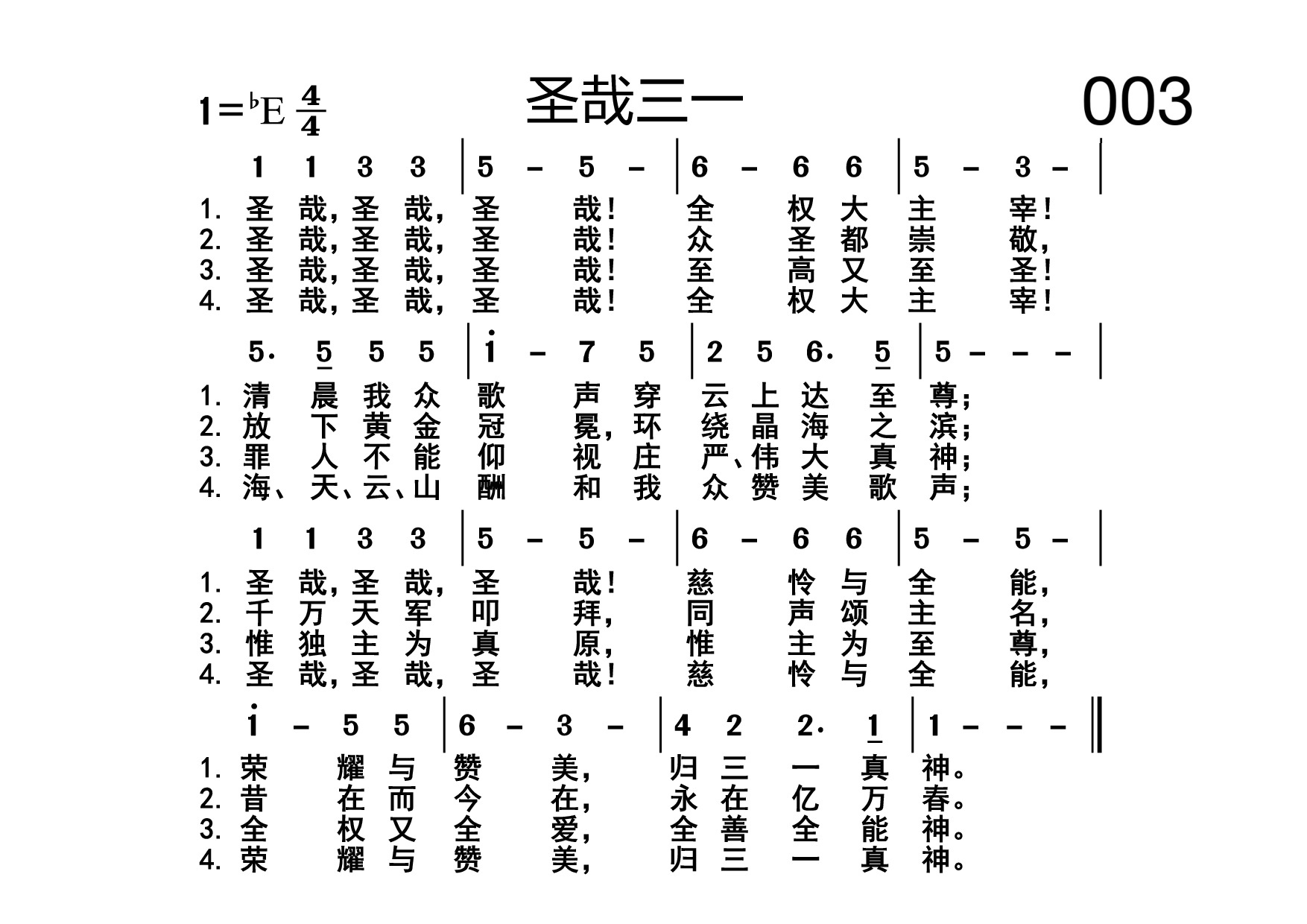 圣哉,圣哉,圣哉!全能大主宰!清晨我众歌声,穿云上达至尊;圣哉,圣哉,圣哉!慈悲与全能,荣耀与赞美,归三一真神。圣哉,圣哉,圣哉!众圣都崇敬,放下黄金冠冕,环绕晶海之滨;千万天军叩拜,同声颂主名,昔在而今在,永在亿万春。圣哉,圣哉,圣哉!黑暗蔽圣明,罪人焉能瞻望真神威严荣光;惟独主为真源,惟主为至尊,全权又全爱,全善全能神。圣哉,圣哉,圣哉!全能大主宰!海天云山酬和吾众赞美歌声;圣哉,圣哉,圣哉!慈悲与全能,荣耀与赞美,归三一真神。