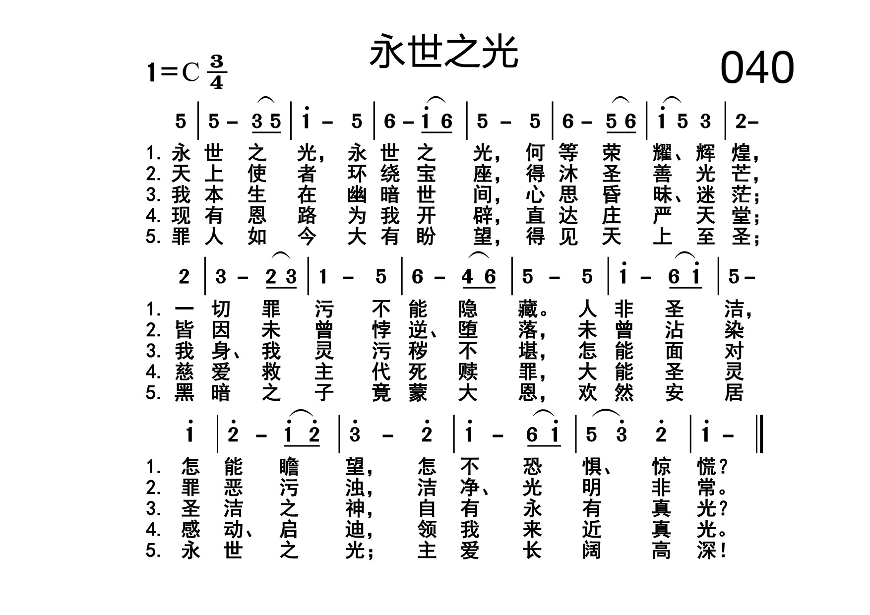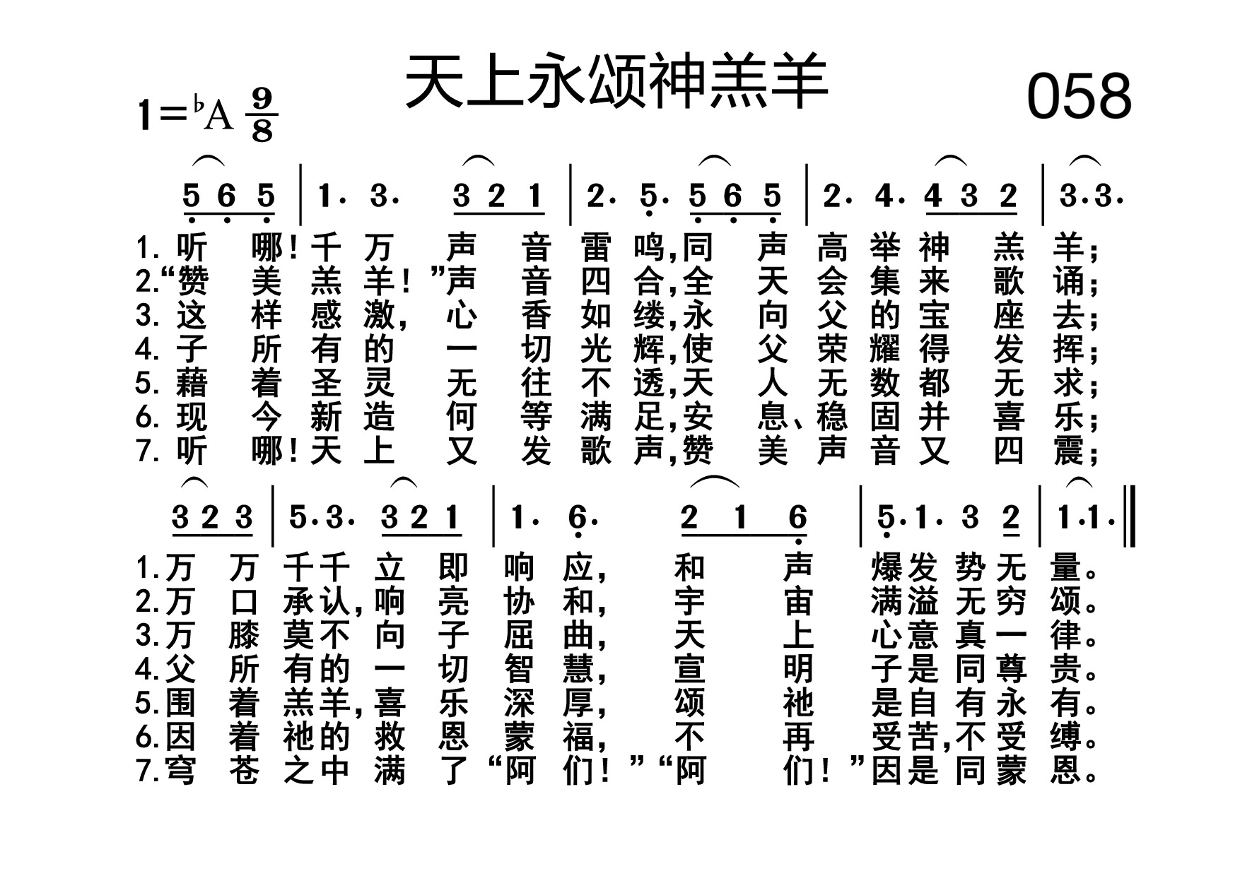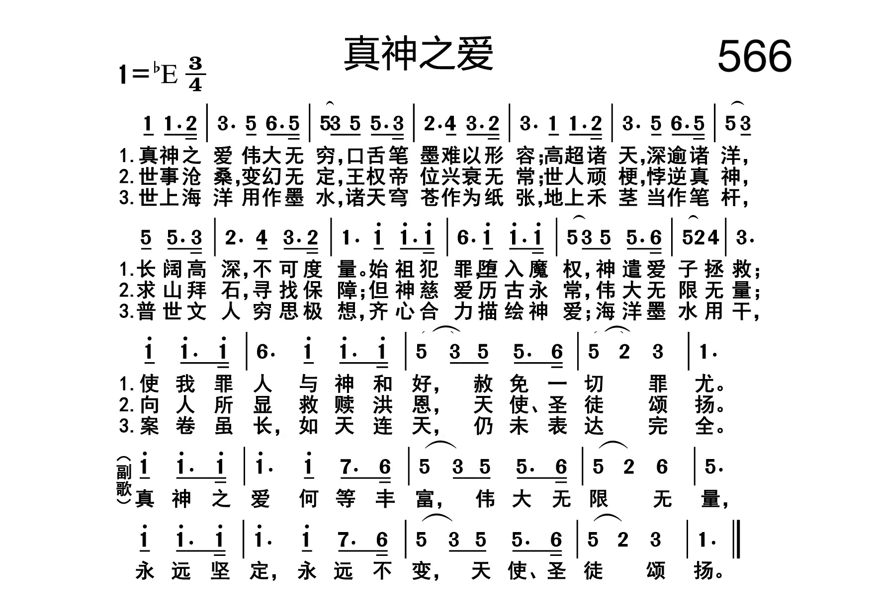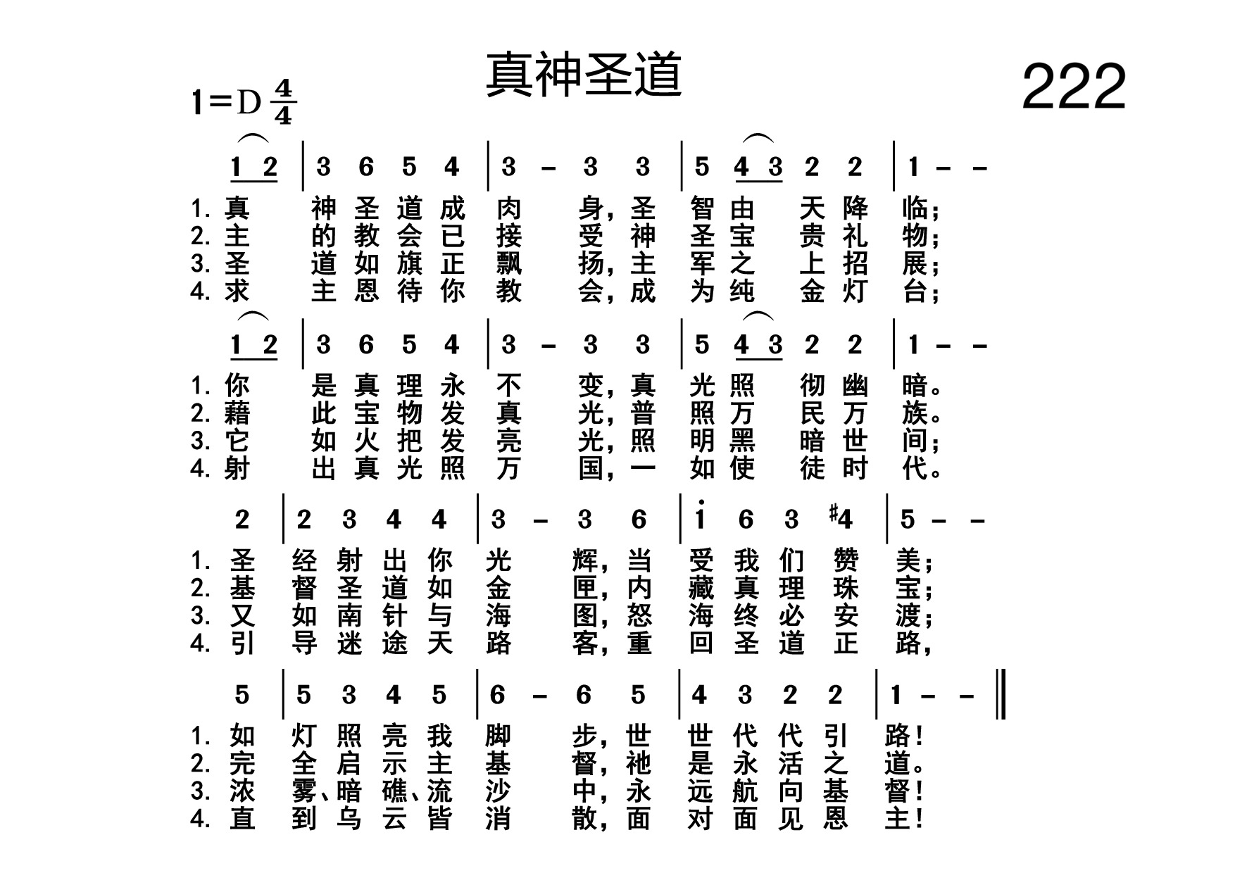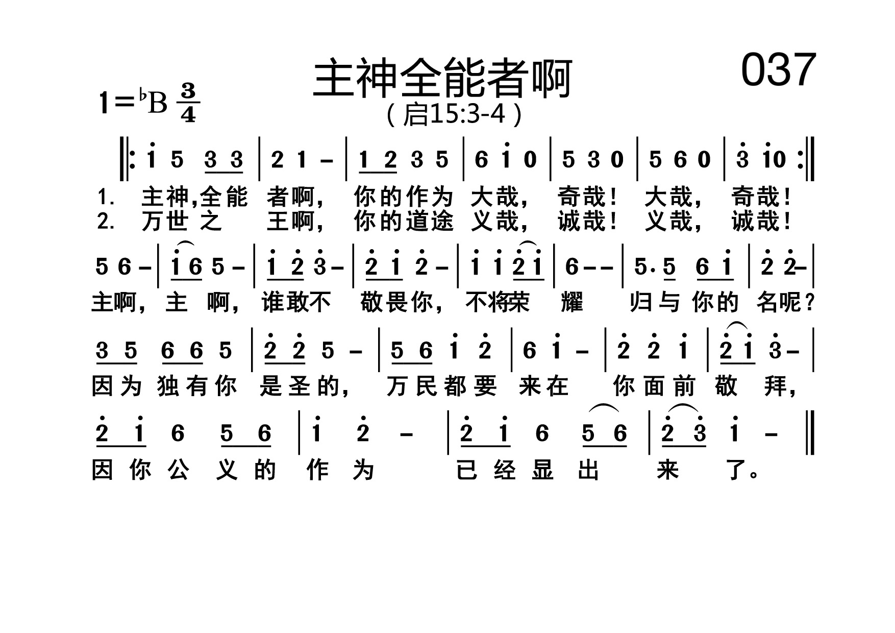 圣哉,圣哉,圣哉!全能大主宰!清晨我众歌声,穿云上达至尊;圣哉,圣哉,圣哉!慈悲与全能,荣耀与赞美,归三一真神。圣哉,圣哉,圣哉!众圣都崇敬,放下黄金冠冕,环绕晶海之滨;千万天军叩拜,同声颂主名,昔在而今在,永在亿万春。圣哉,圣哉,圣哉!黑暗蔽圣明,罪人焉能瞻望真神威严荣光;惟独主为真源,惟主为至尊,全权又全爱,全善全能神。圣哉,圣哉,圣哉!全能大主宰!海天云山酬和吾众赞美歌声;圣哉,圣哉,圣哉!慈悲与全能,荣耀与赞美,归三一真神。