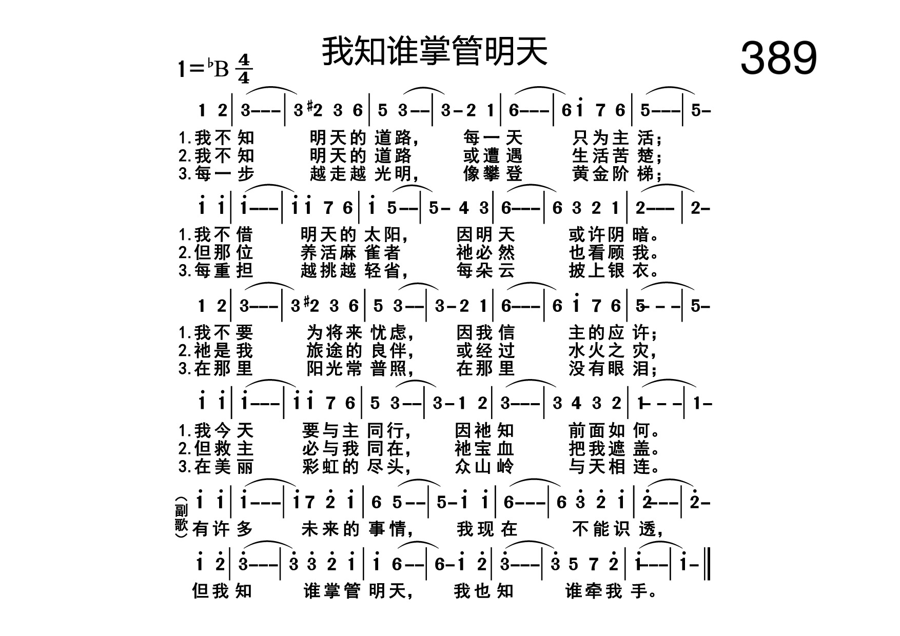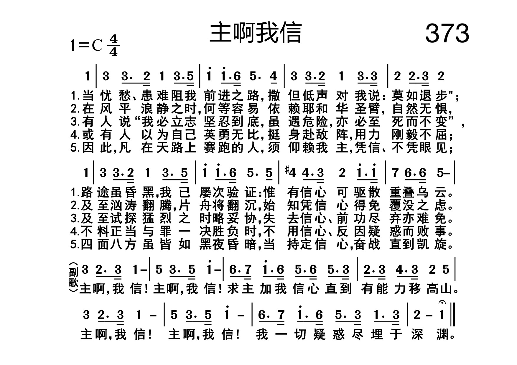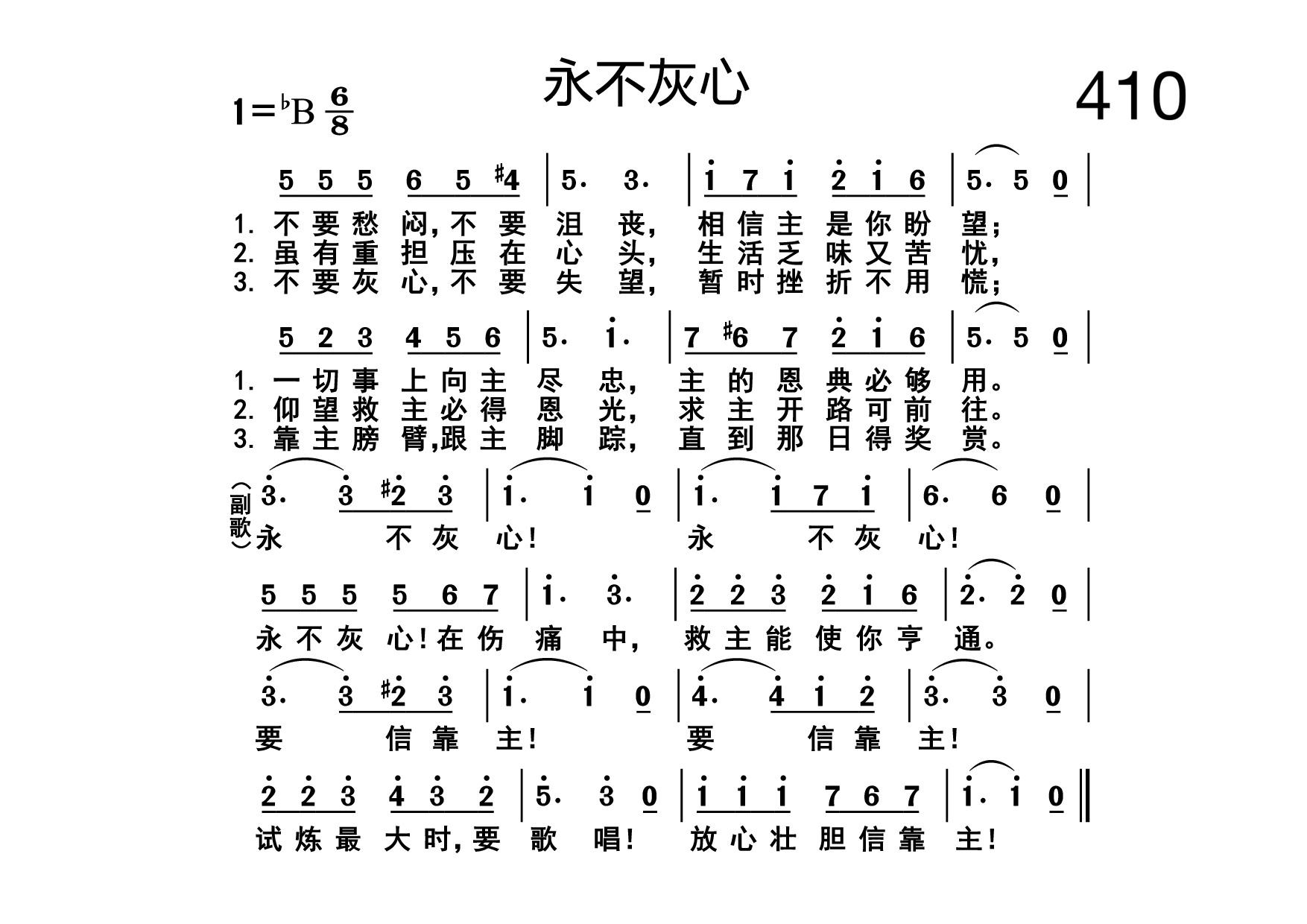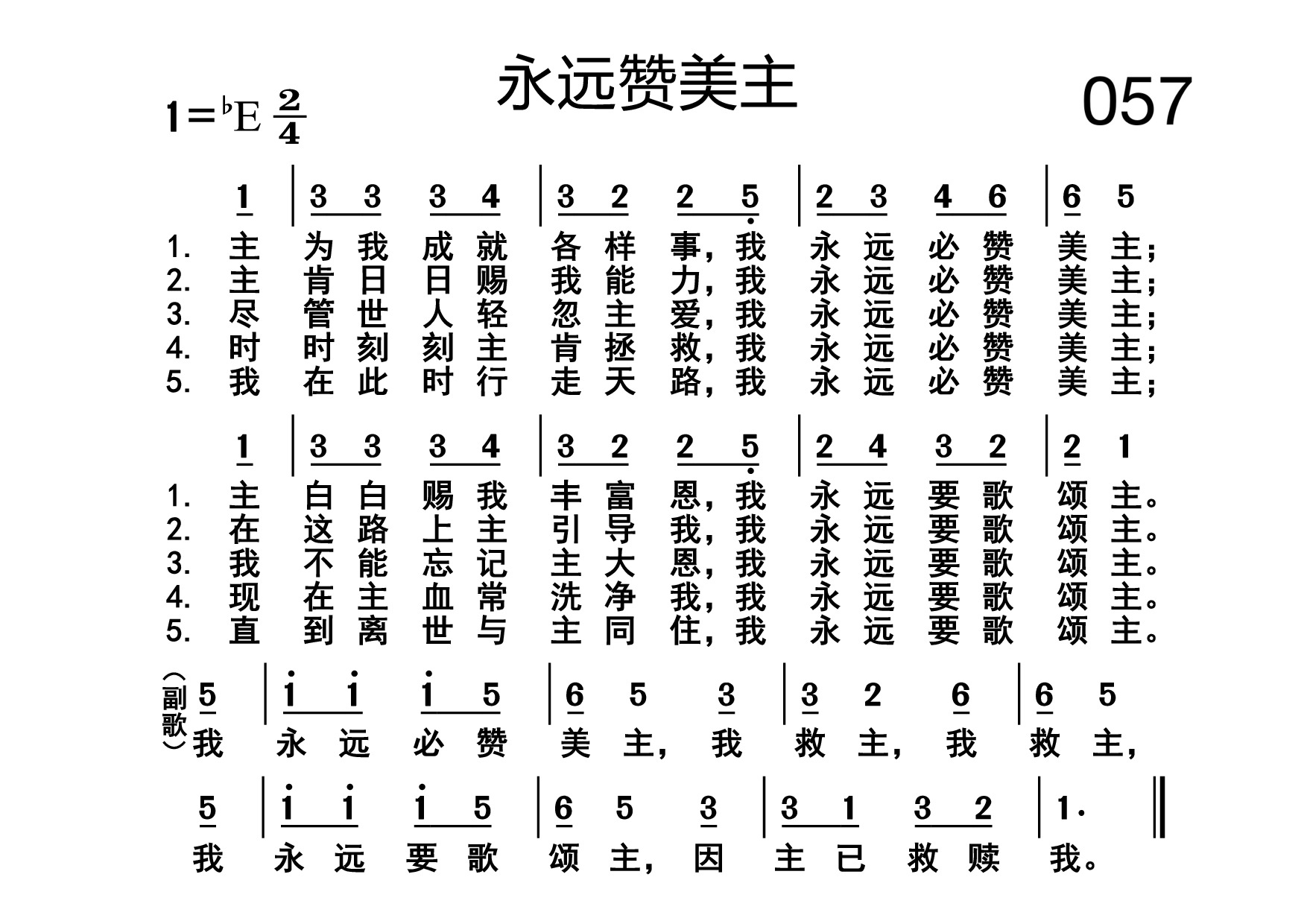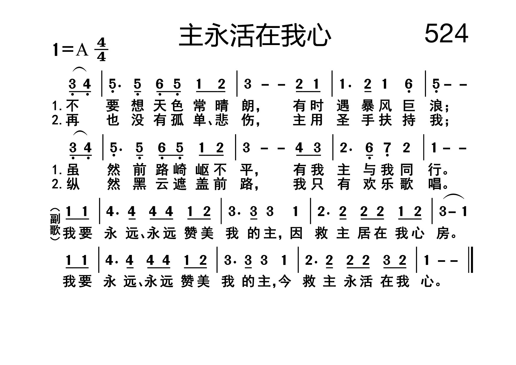 不要想天色常晴朗,有时遇暴风巨浪;虽然前路崎岖不平,有我主与我同行。我要永远永远赞美我的主,因救主居在我心房。我要永远永远赞美我的主,今救主永活在我心。再也没有孤单悲伤,主用圣手扶持我;纵然黑云遮盖前路,我也要欢乐歌唱。