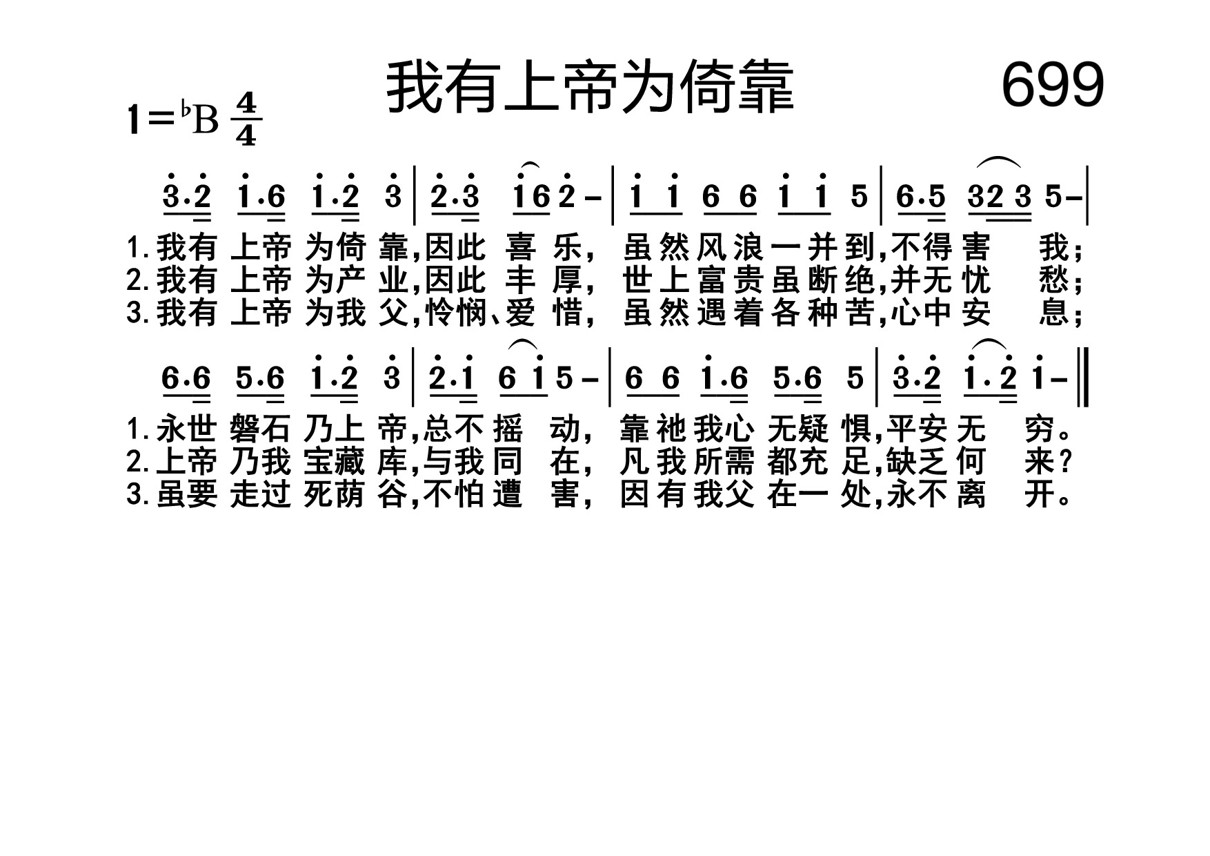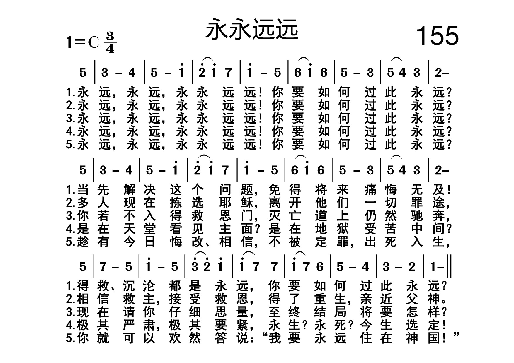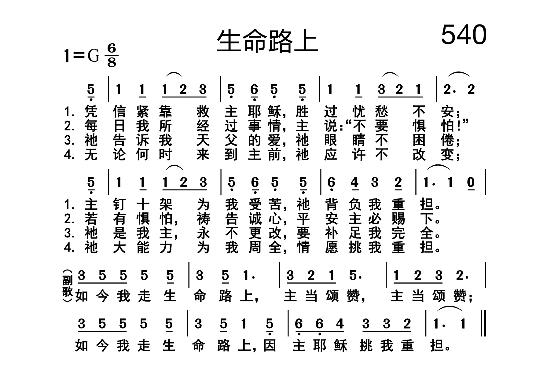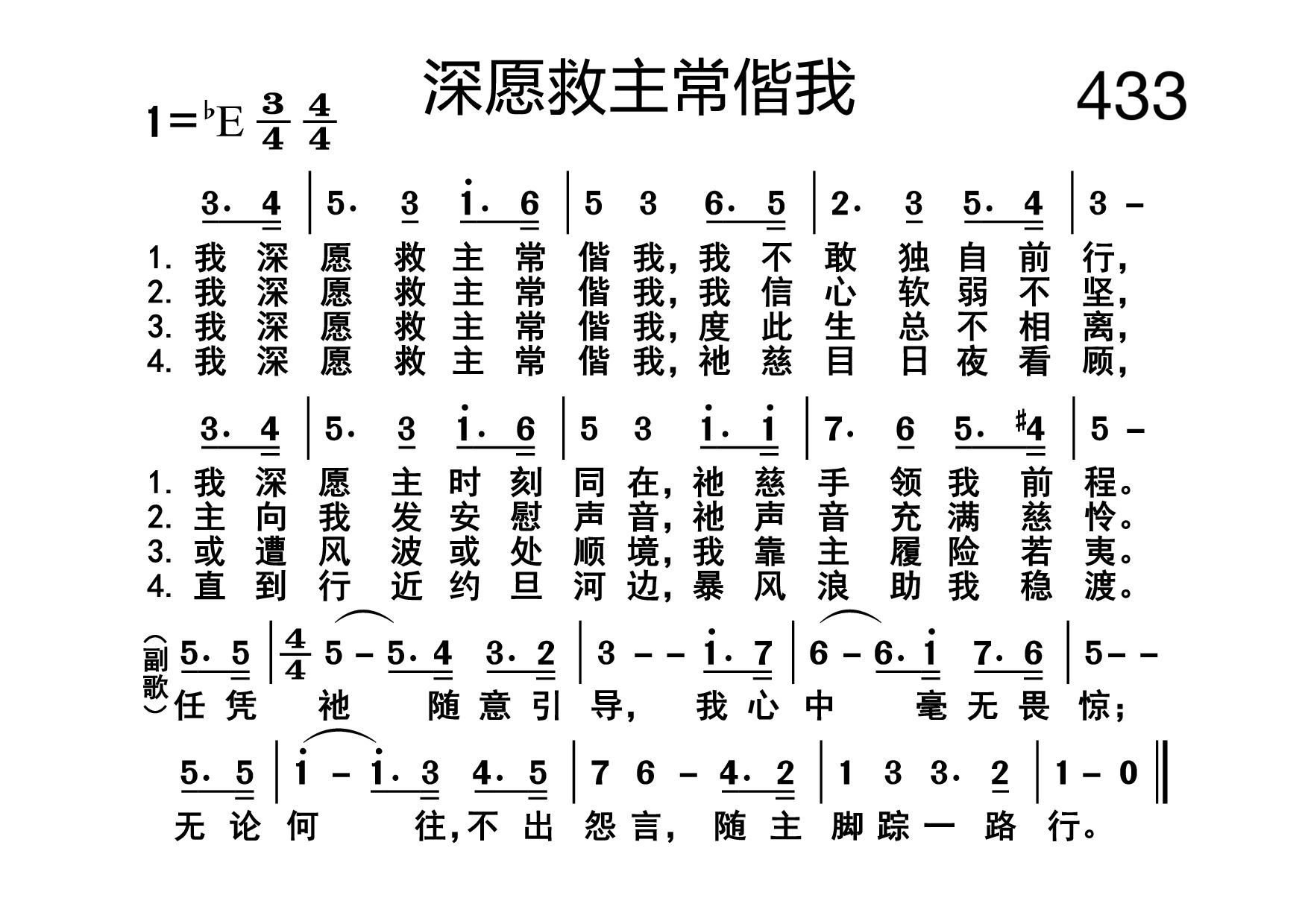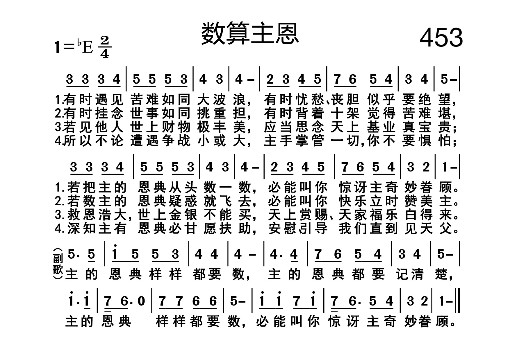 不要想天色常晴朗,有时遇暴风巨浪;虽然前路崎岖不平,有我主与我同行。我要永远永远赞美我的主,因救主居在我心房。我要永远永远赞美我的主,今救主永活在我心。再也没有孤单悲伤,主用圣手扶持我;纵然黑云遮盖前路,我也要欢乐歌唱。