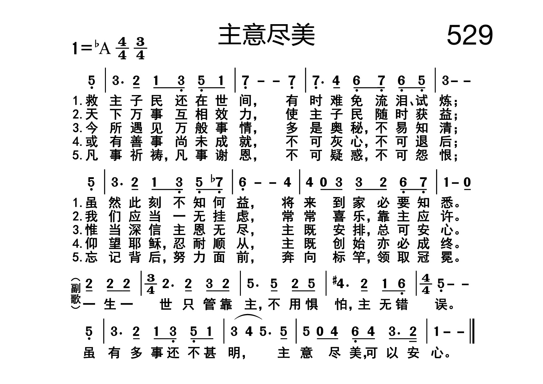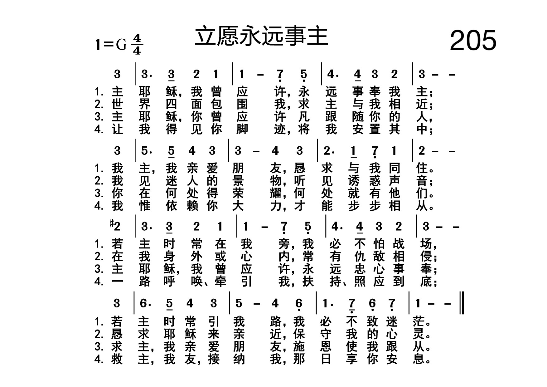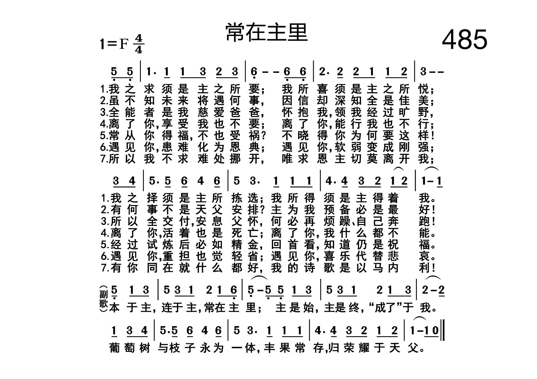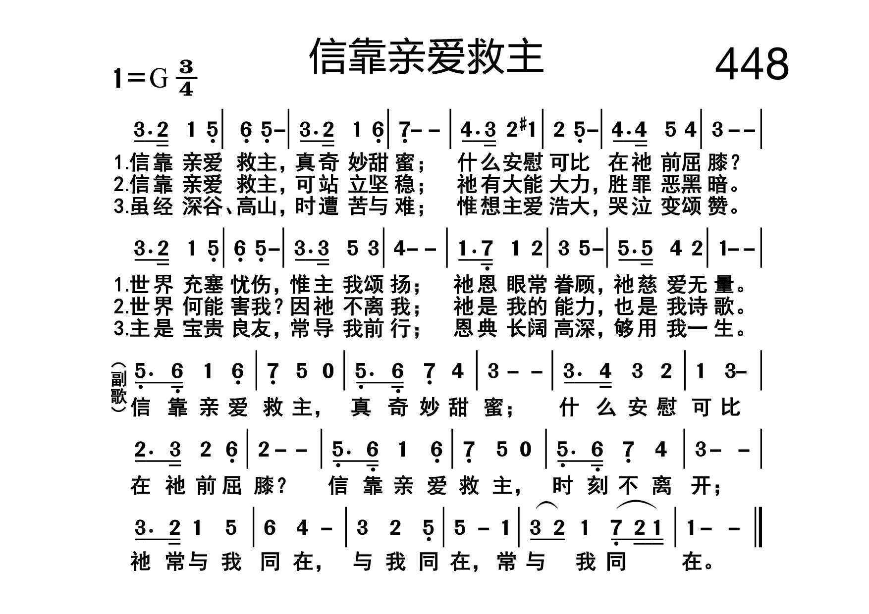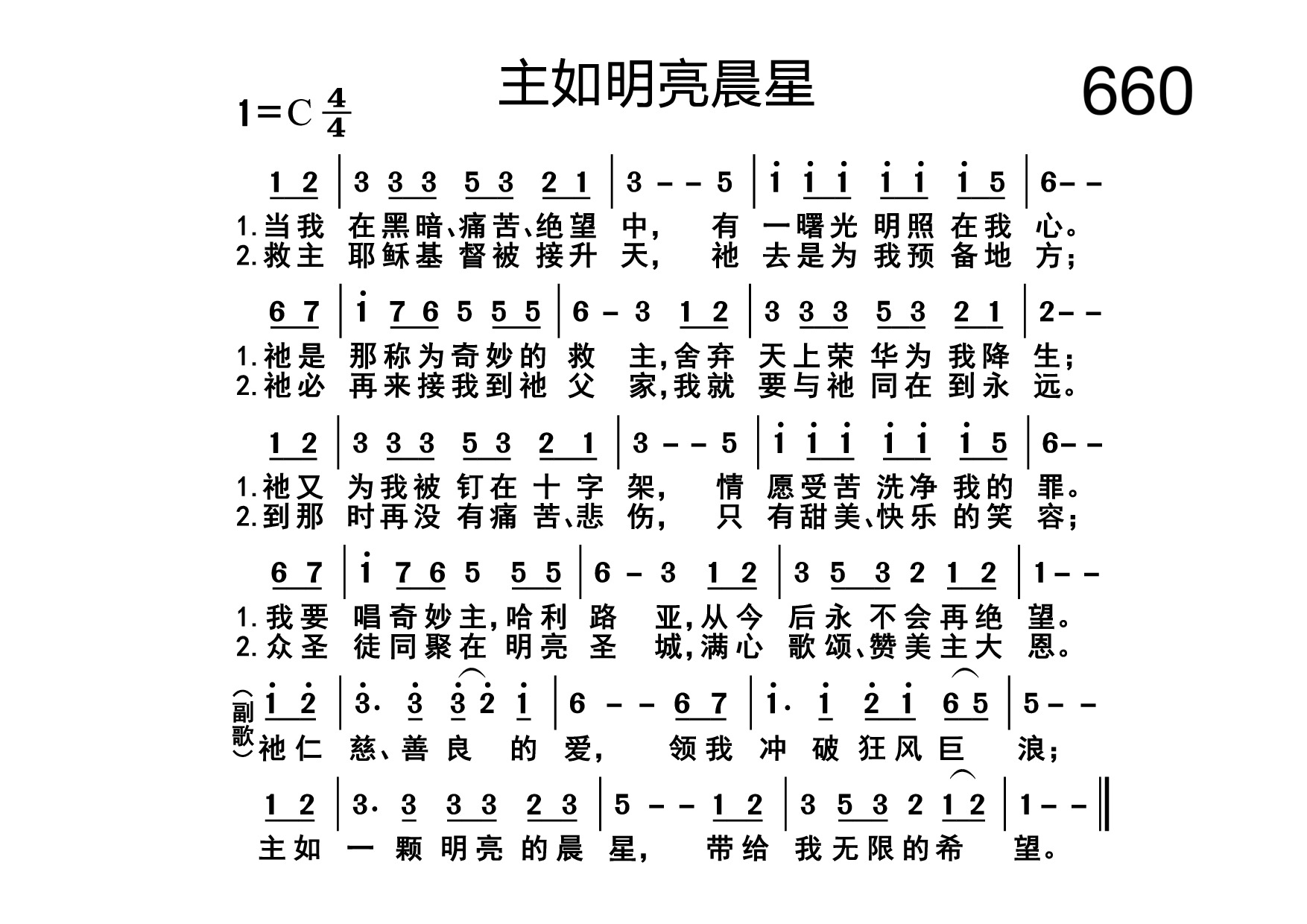 不要想天色常晴朗,有时遇暴风巨浪;虽然前路崎岖不平,有我主与我同行。我要永远永远赞美我的主,因救主居在我心房。我要永远永远赞美我的主,今救主永活在我心。再也没有孤单悲伤,主用圣手扶持我;纵然黑云遮盖前路,我也要欢乐歌唱。