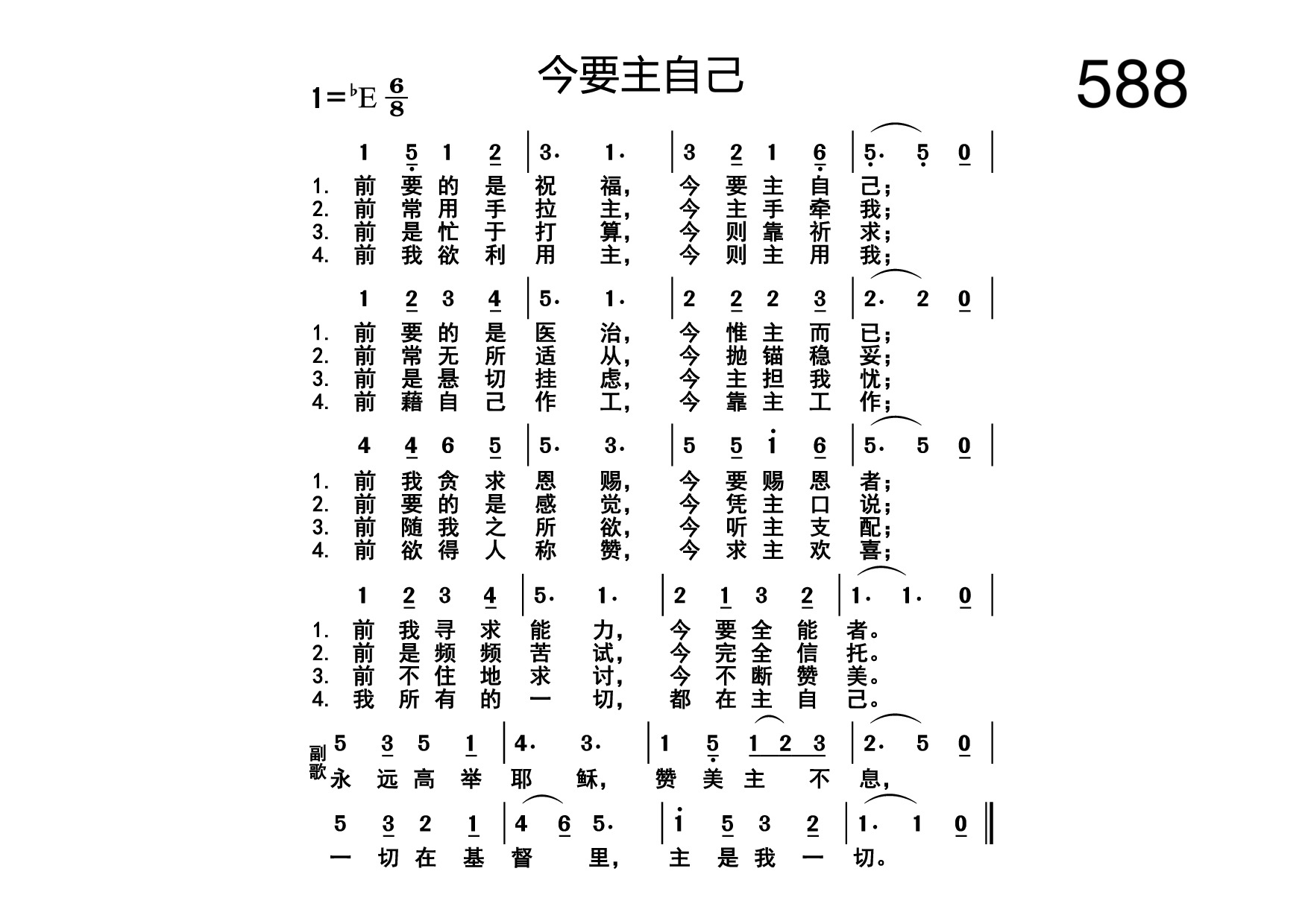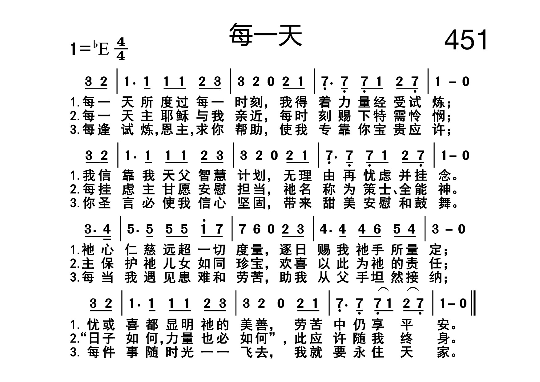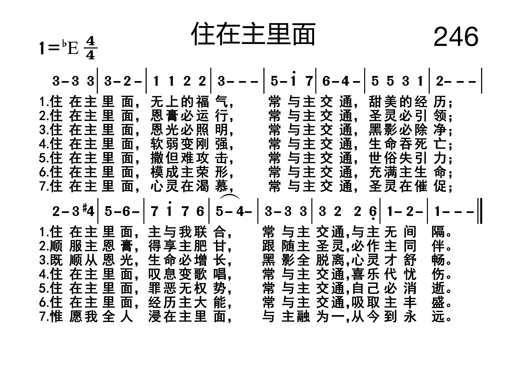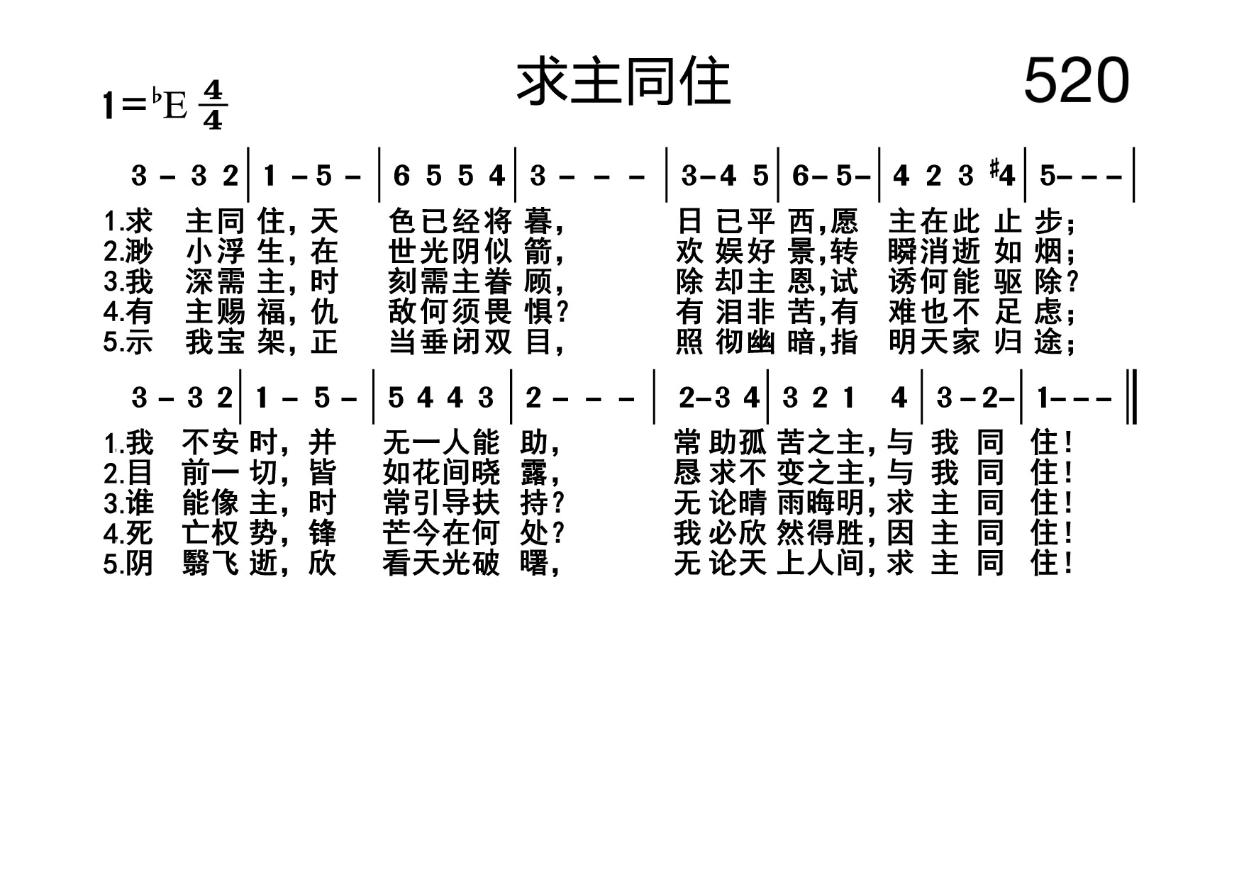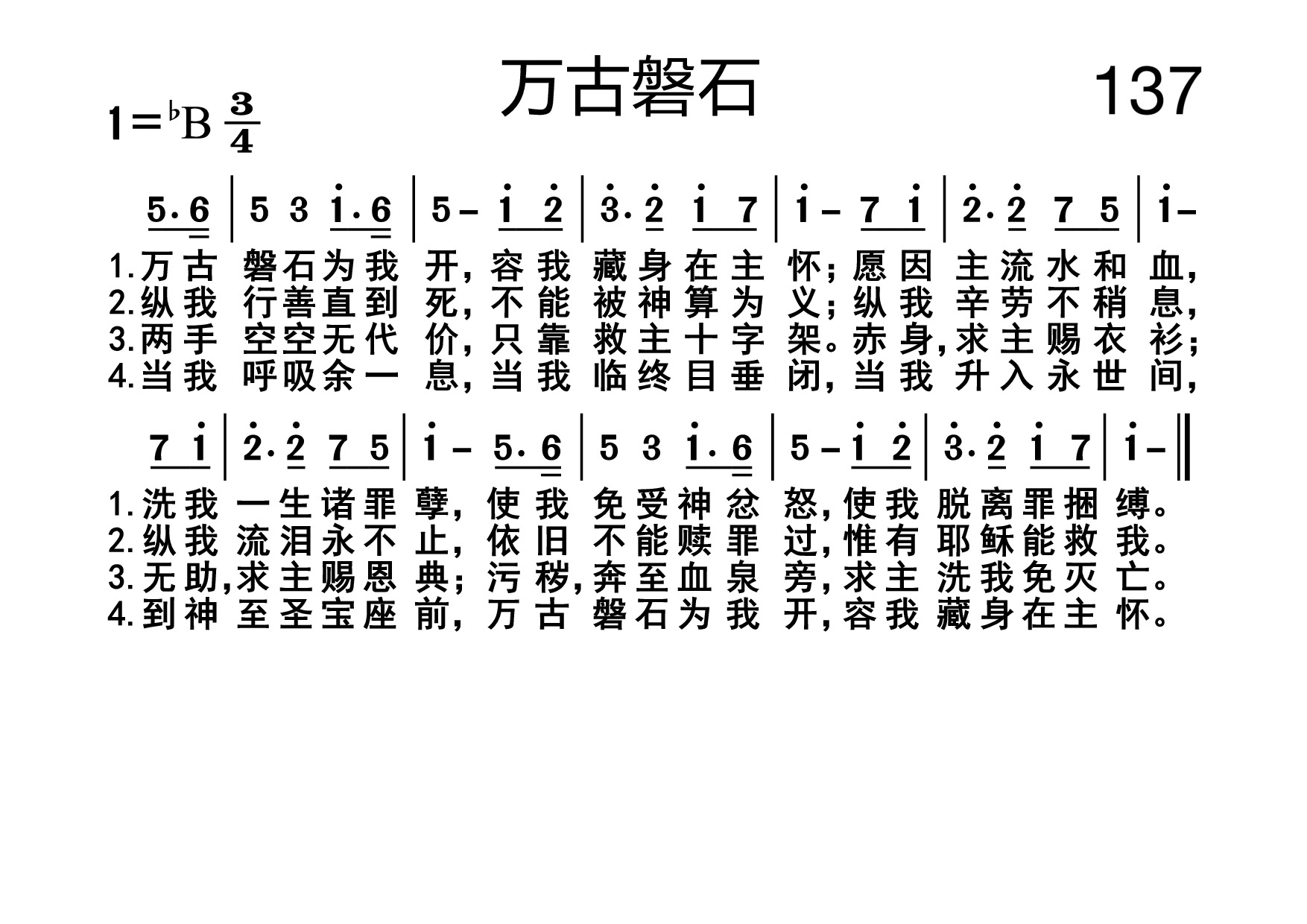 不要想天色常晴朗,有时遇暴风巨浪;虽然前路崎岖不平,有我主与我同行。我要永远永远赞美我的主,因救主居在我心房。我要永远永远赞美我的主,今救主永活在我心。再也没有孤单悲伤,主用圣手扶持我;纵然黑云遮盖前路,我也要欢乐歌唱。