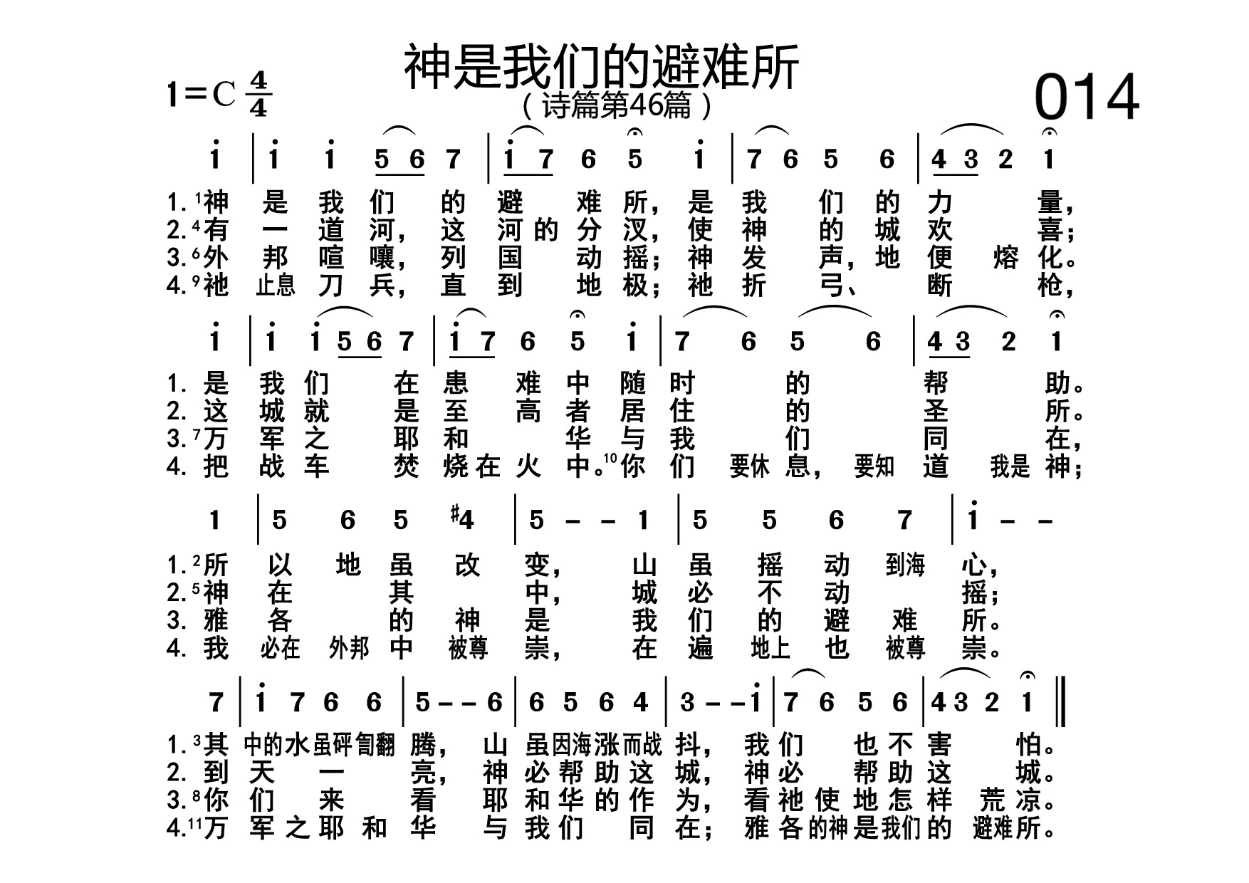神是我们的避难所是我们的力量是我们在患难中随时的帮助所以地虽改变山虽摇动到海心其中的水虽匉訇翻腾山虽因海涨而战抖我们也不害怕有一道河这河的分汊使神的城欢喜这城就是至高者居住的圣所神在其中城必不动摇到天一亮神必帮助这城神必帮助这城外邦喧嚷列国动摇神发声地便熔化万军之耶和华与我们同在雅各的神是我们的避难所你们来看耶和华的作为看他使地怎样荒凉他止息刀兵直到地极他折弓断枪把战车焚烧在火中你们要休息要知道我是神我必在外邦中被尊崇在遍地上也被尊崇万军之耶和华与我们同在雅各的神是我们的避难所