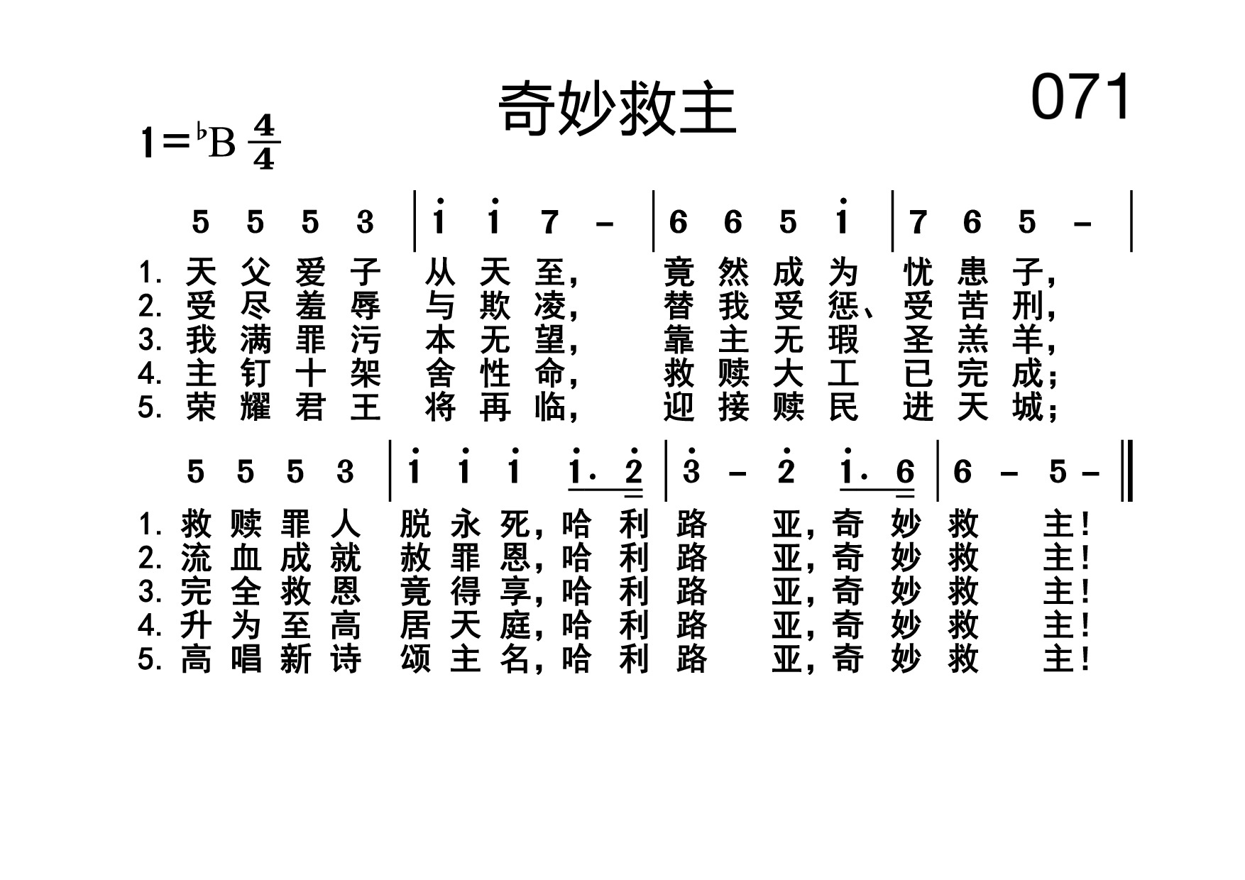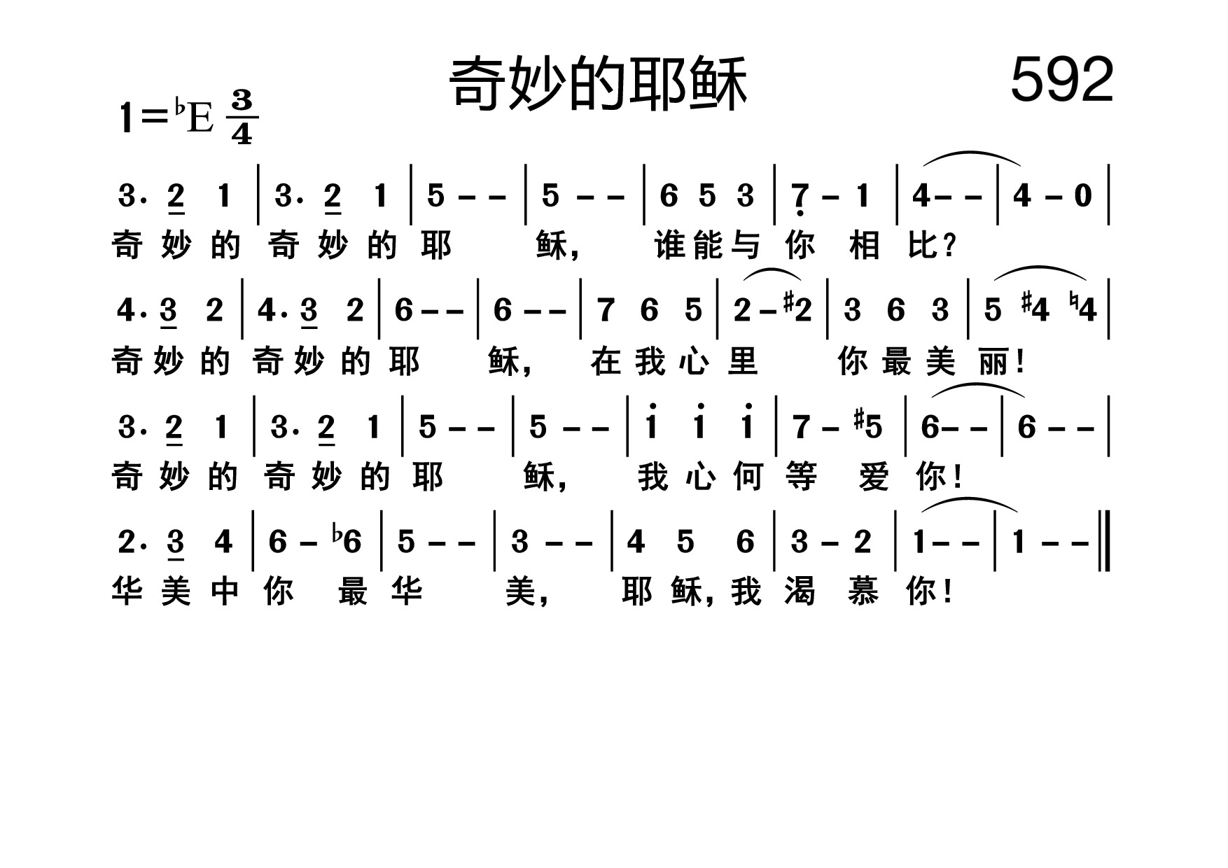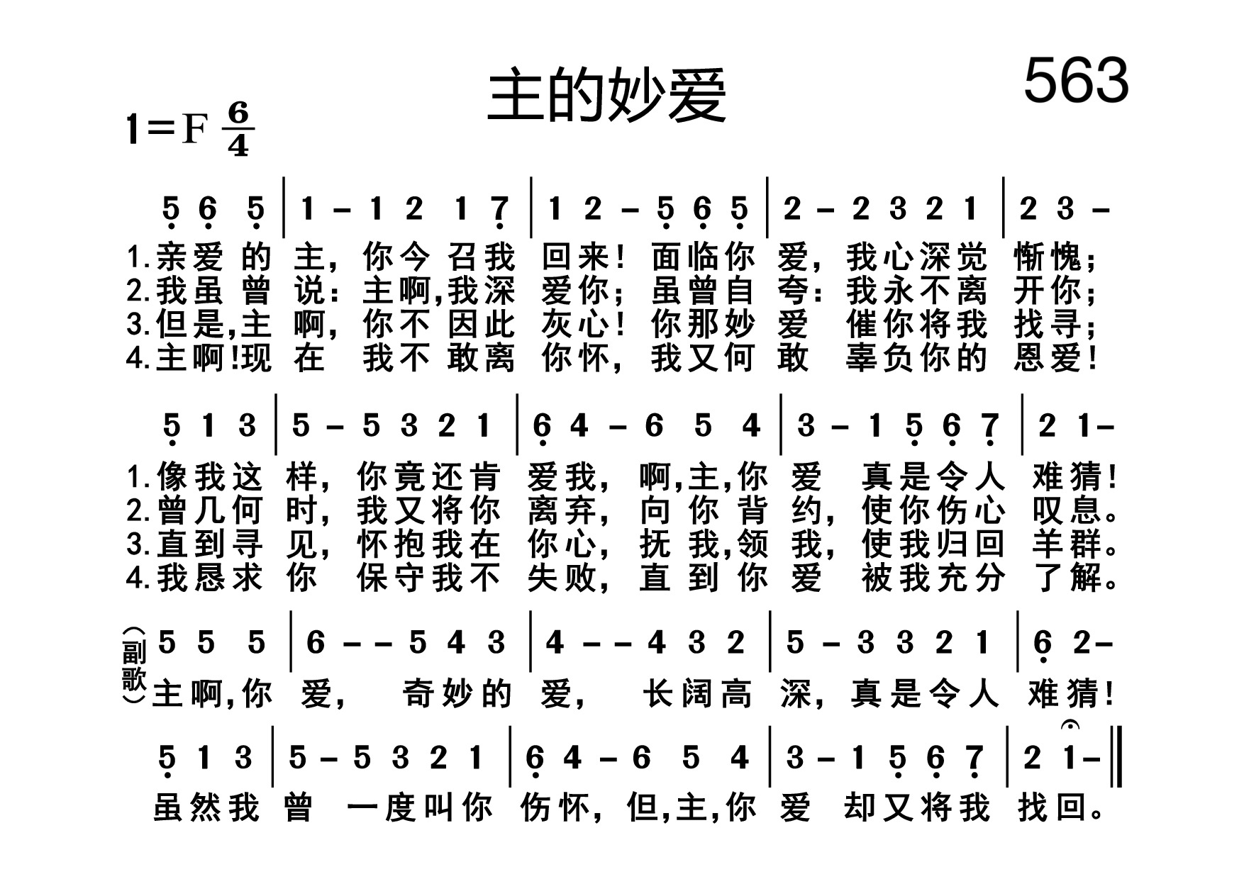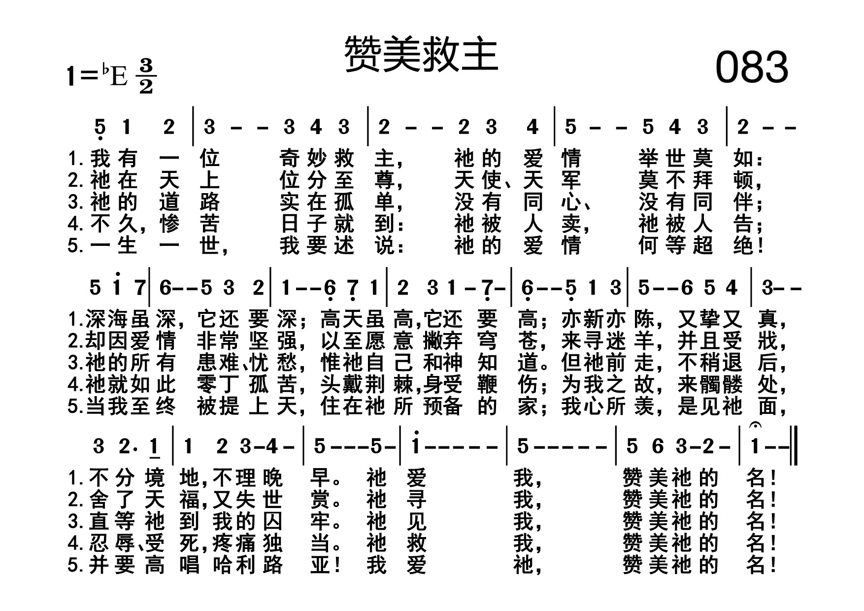 我有一位奇妙救主,祂的爱情举世莫如深海虽深,他还要深,高天虽高,他还要高亦新亦陈、又挚又真,不分境地、不理晚早祂爱我,赞美祂的名祂在天上位分至尊,天使天军无不拜顿却因情爱非常坚强,以至愿意撇弃穹苍来寻迷羊,并且受戕,舍了天福,又失世赏祂寻我,赞美祂的名祂的道路实在孤单,没有同心没有同伴祂的所有患难忧愁,惟祂自己和神知道但祂前走不稍退后,直等祂到我的囚牢祂见我,赞美祂的名不久,悲惨日子就到:祂被人卖,祂被人告祂就如此零丁孤苦,头戴荆冕,身受鞭伤为我之故,来髑髅处,忍辱受死,疼痛独当祂救我,赞美祂的名一生一世,我要述说, 祂的爱情何等超绝当我至终被提上天, 住在祂所预备的家我心所羡, 是见祂面,我要高唱哈利路亚我爱祂,赞美祂的名