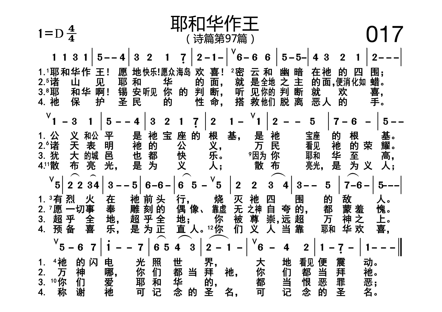 耶和华作王愿地快乐愿众海岛欢喜密云和幽暗在他的四围公义和公平是他宝座的根基有烈火在他前头行烧灭他四围的敌人他的闪电光照世界大地看见便震动诸山见耶和华的面就是全地之主的面便消化如蜡诸天表明他的公义万民看见他的荣耀愿一切事奉雕刻的偶像靠虚无之神自夸的都蒙羞愧万神哪你们都当拜他耶和华阿锡安听见你的判断就欢喜犹大的城邑也都快乐因为你耶和华至高超乎全地你被尊崇远超万神之上你们爱耶和华的都当恨恶罪恶他保护圣民的性命搭救他们脱离恶人的手脱离恶人的手散布亮光是为义人预备喜乐是为正直人你们义人当靠耶和华欢喜称谢他可记念的圣名
