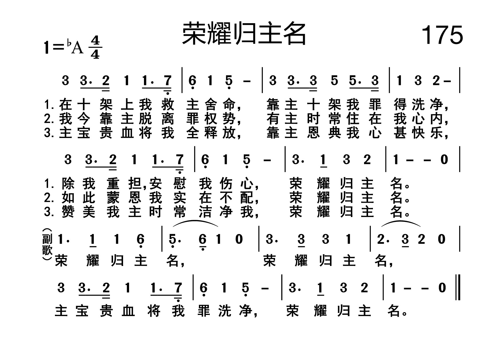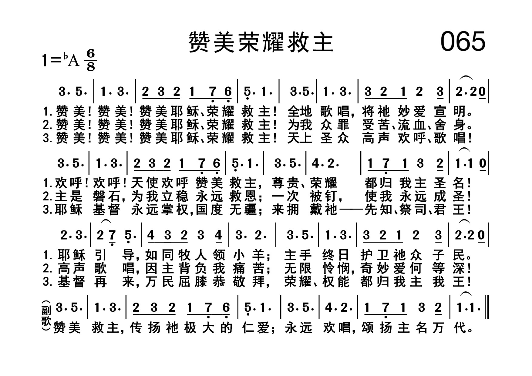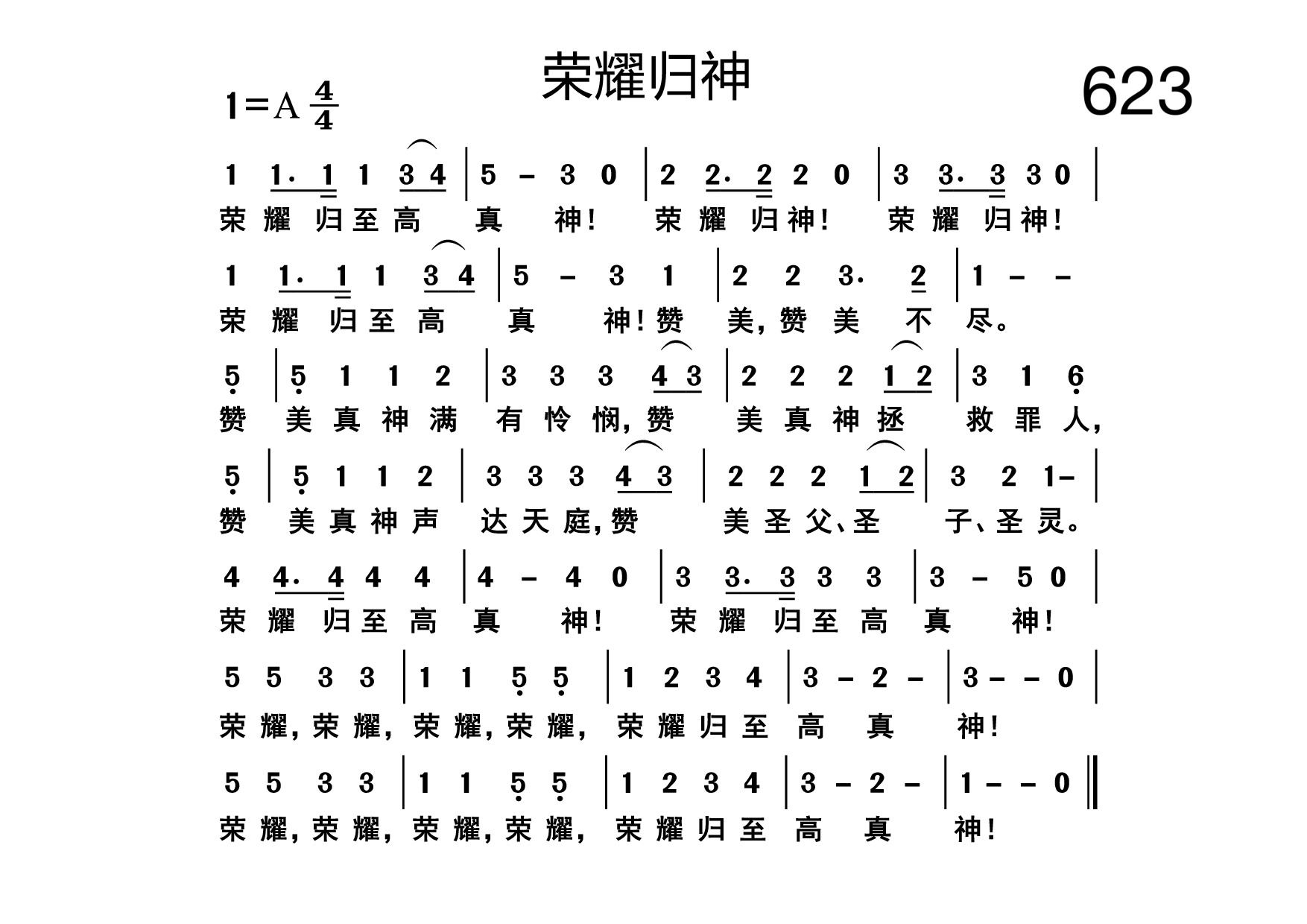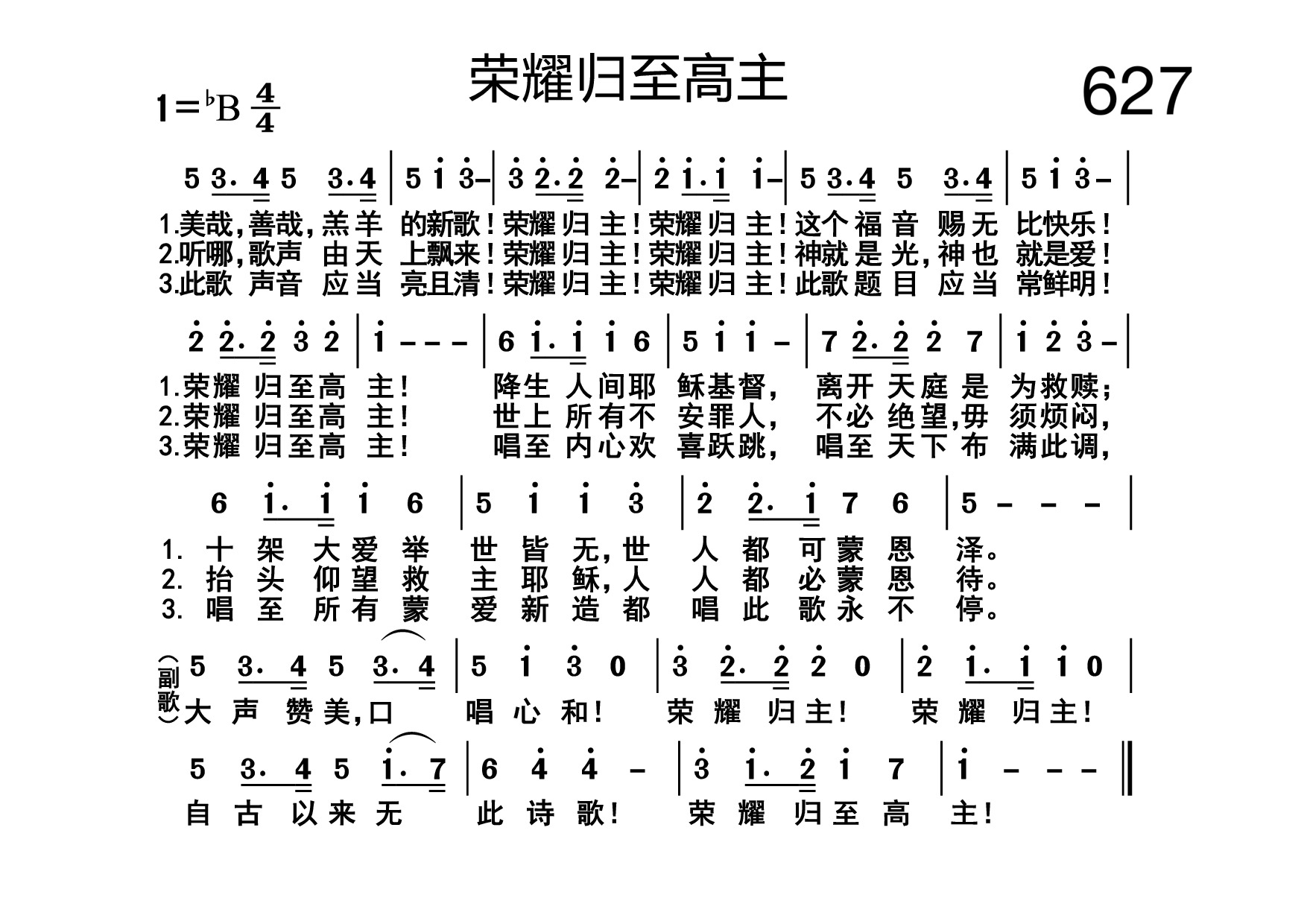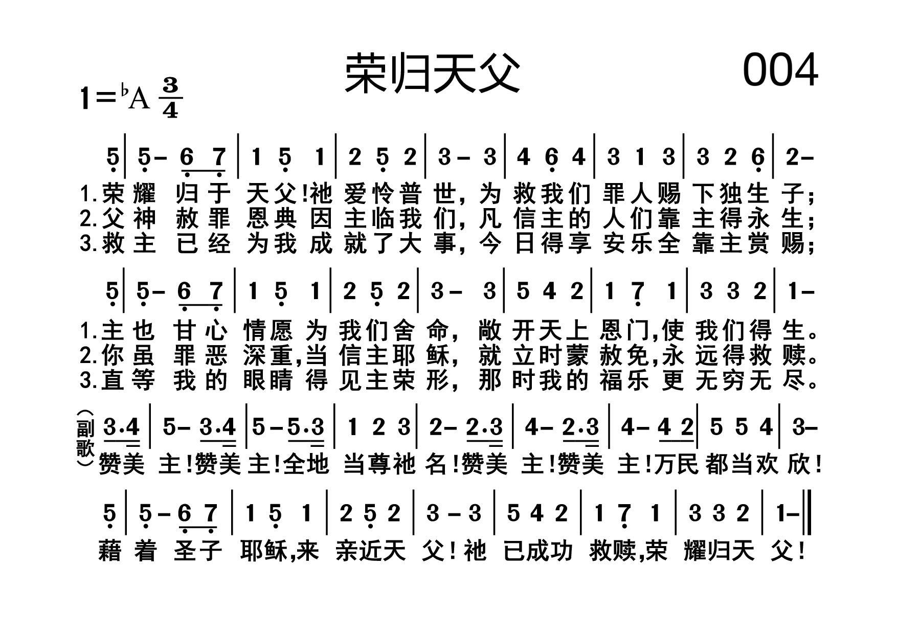 荣耀归于天父 他爱怜普世为救我们罪人 赐下独生子主也甘心情愿 为我们舍命敞开天上恩门 使我们得生赞美主 赞美主 全地当尊他名赞美主 赞美主 万民都当欢欣藉着圣子耶稣 得亲近天父他已成功救赎 荣耀归天父父神赦罪恩典 因主临我们凡信主的人们 靠主得永生你虽罪恶深重 当信主耶稣就立时蒙赦免 永远得救赎赞美主 赞美主 全地当尊他名赞美主 赞美主 万民都当欢欣藉着圣子耶稣 得亲近天父他已成功救赎 荣耀归天父救主已经为我 成就了大事今日得享安乐 全靠主赏赐直等我的眼睛 得见主荣形那时我的福乐 更无穷无尽赞美主 赞美主 全地当尊他名赞美主 赞美主 万民都当欢欣藉着圣子耶稣 得亲近天父他已成功救赎 荣耀归天父