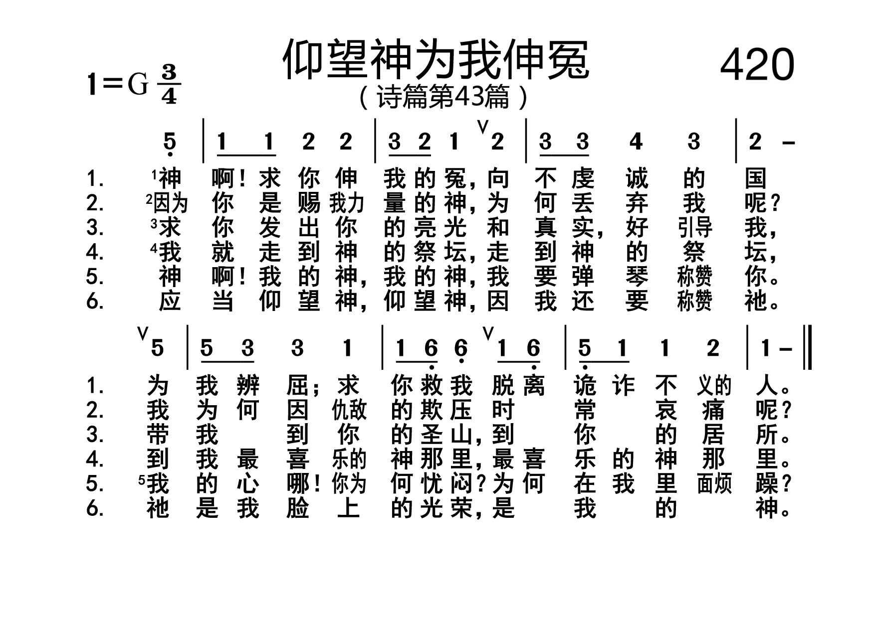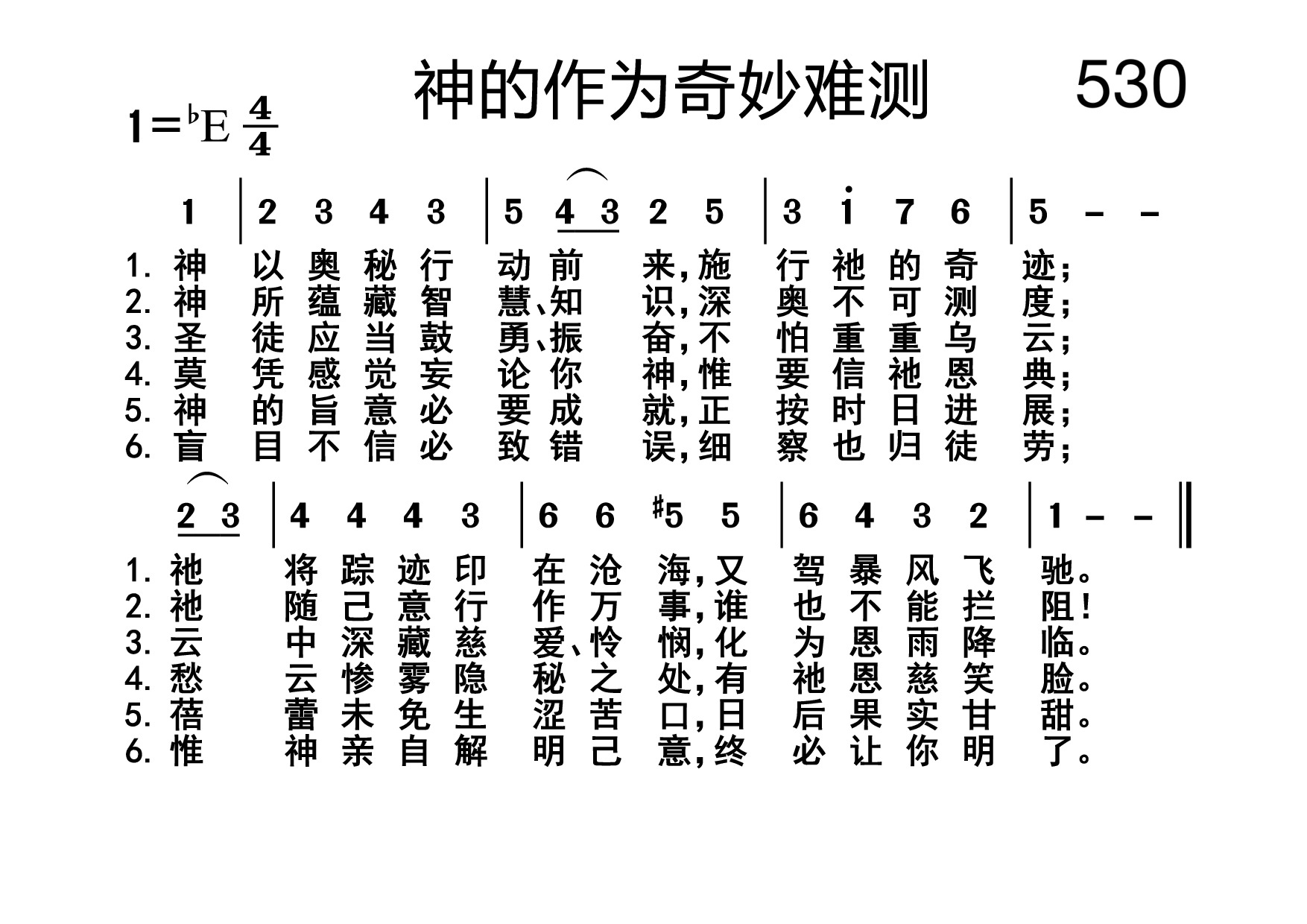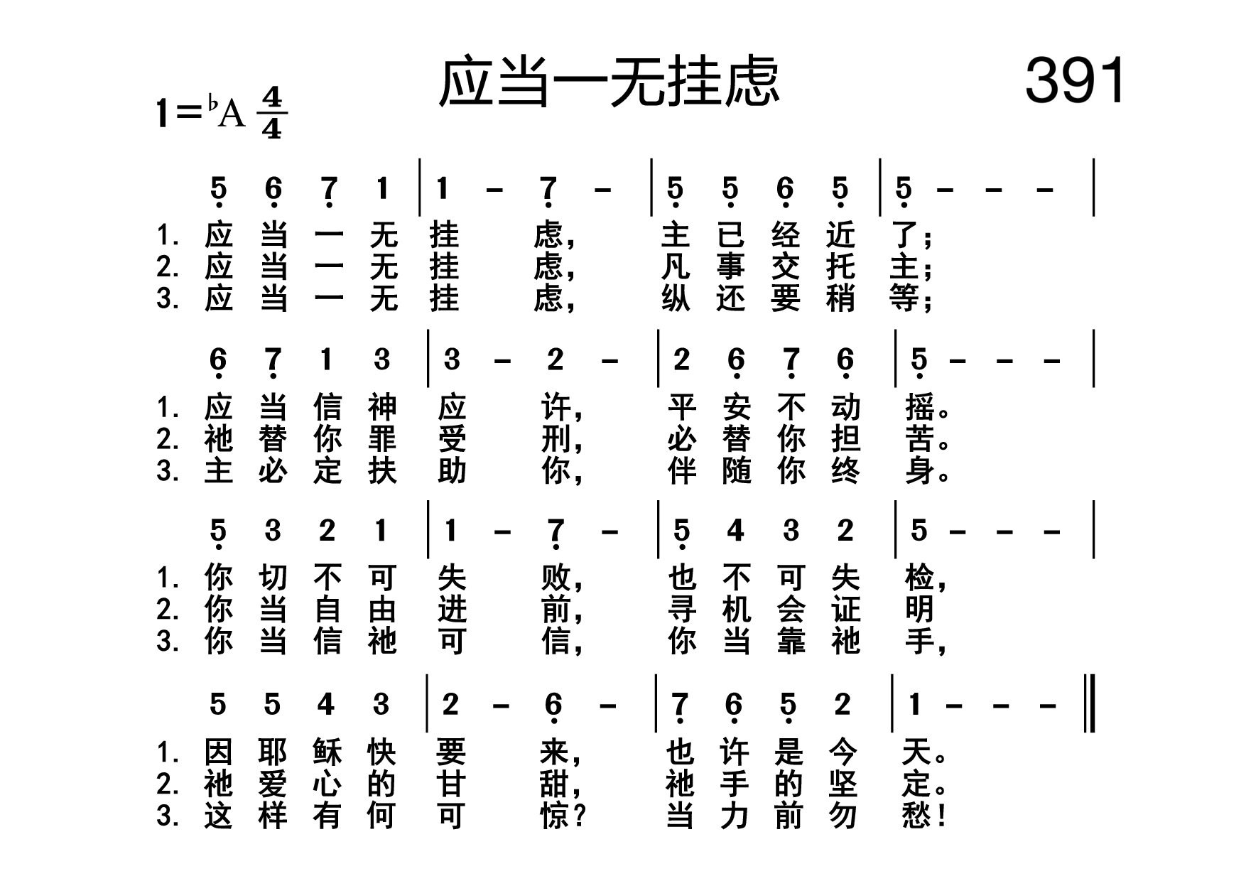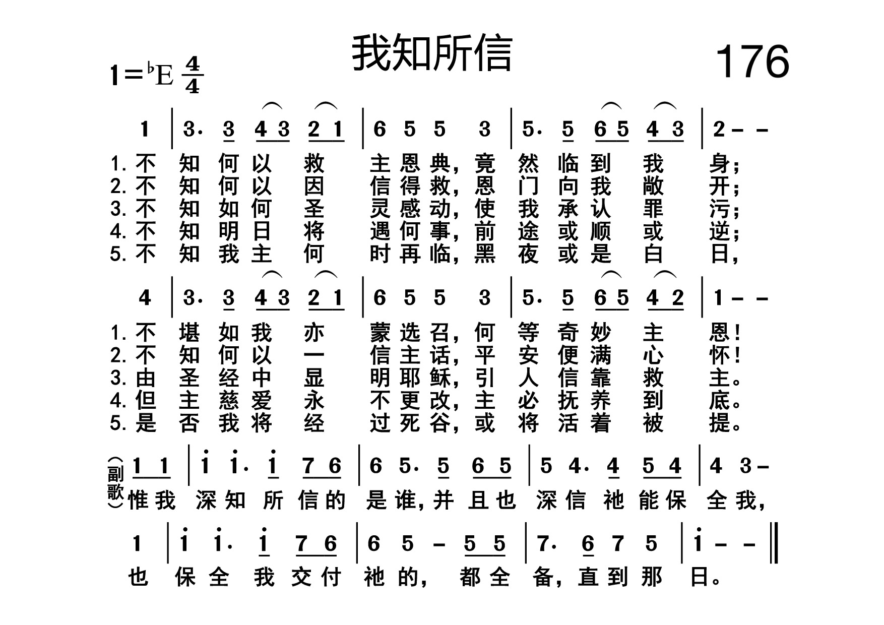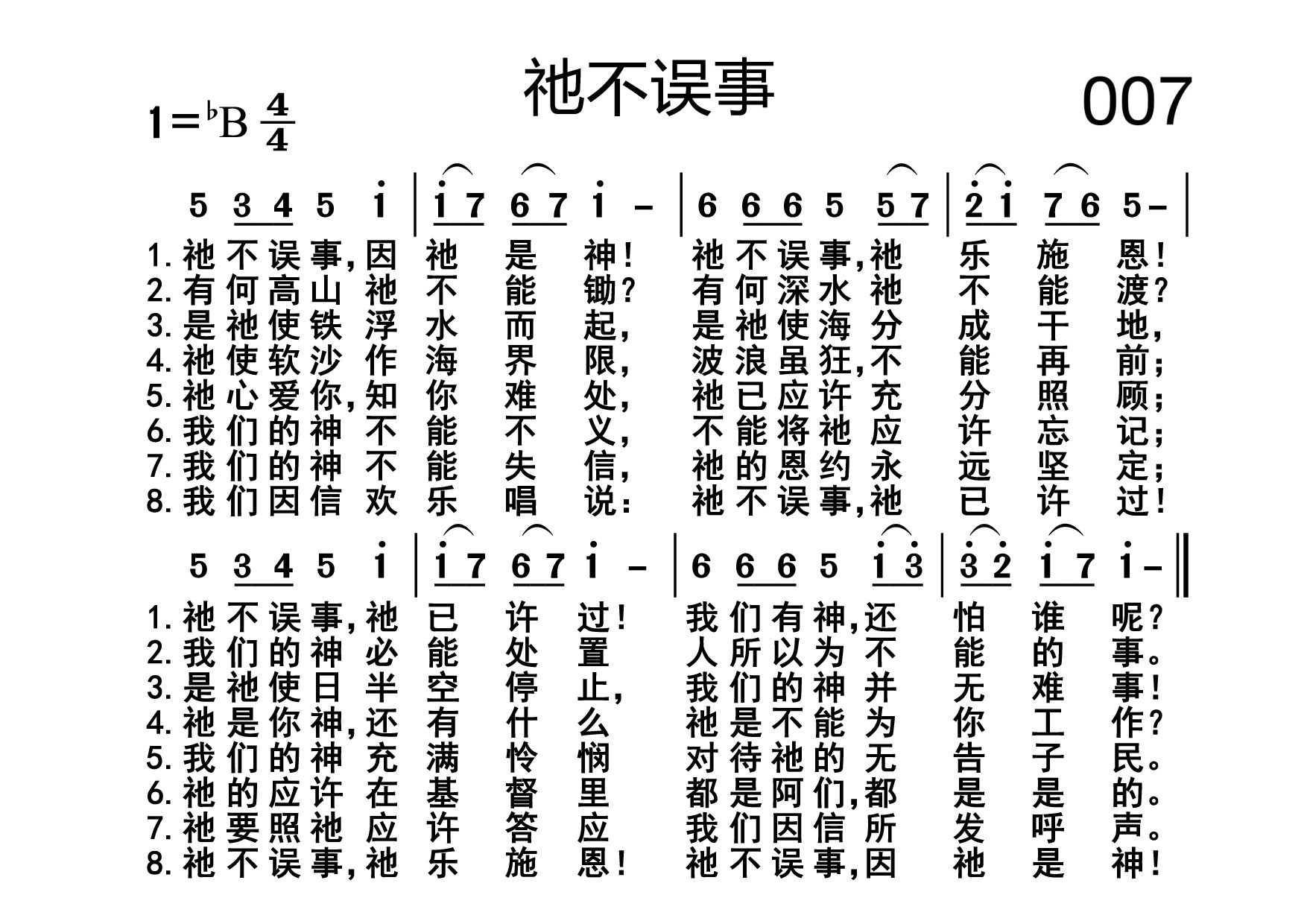祂不误事,因祂是神;祂不误事,祂乐施恩;祂不误事,祂已许过;我们有神,还怕谁何?有何高山祢不能锄,有何深水祢不能渡;我们的神专门处置人所以为不能的事。是祂使铁浮水而起,是祂使海分成干地,是祂使日半空停止,我们的神并无难事!祂使软沙作海界限,波浪虽狂不能再前;祂是你神,还有什么祂是不能为你工作?祂心爱你,知你难处,所以应许祂要照顾;我们的神充满怜悯,对待祂的无告子民。我们的神不能不义,不能将祂应许忘记;祂的应许在基督里,都是阿们,都是是的。我们的神不能失信,祂的恩约永远坚定;祂要照祂应许,答应我们因信所发呼声。我们因信欢乐唱说:祂不误我,祂已许过!祂不误我,祂乐施恩!祂不误我,因祂是神!