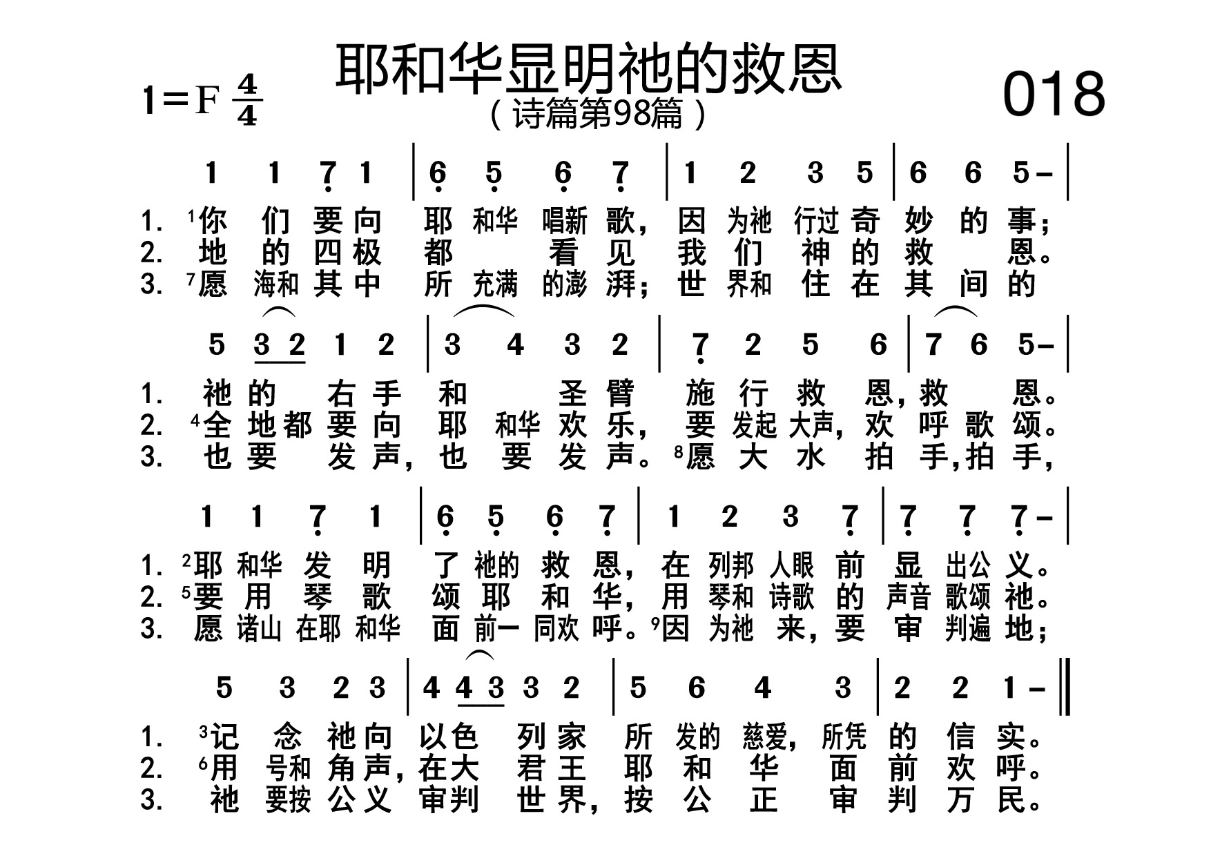 你们要向耶和华唱新歌因为他行过奇妙的事他的右手和圣臂施行救恩施行救恩耶和华发明了他的救恩在列邦人眼前显出公义记念他向以色列家所发的慈爱所凭的信实地的四极都看见我们神的救恩全地都要向耶和华欢乐要发起大声欢呼歌颂要用琴歌颂耶和华用琴和诗歌的声音歌颂他用号和角声在大君王耶和华面前欢呼愿海和其中所充满的澎湃世界和住在其间的也要发声也要发声愿大水拍手愿诸山在耶和华面前一同欢呼因为他来要审判遍地他要按公义审判世界按公正审判万民