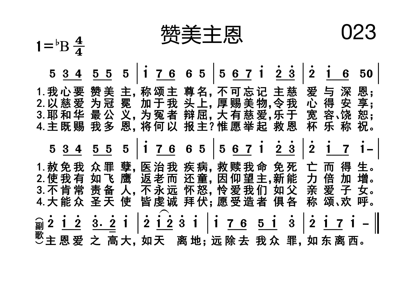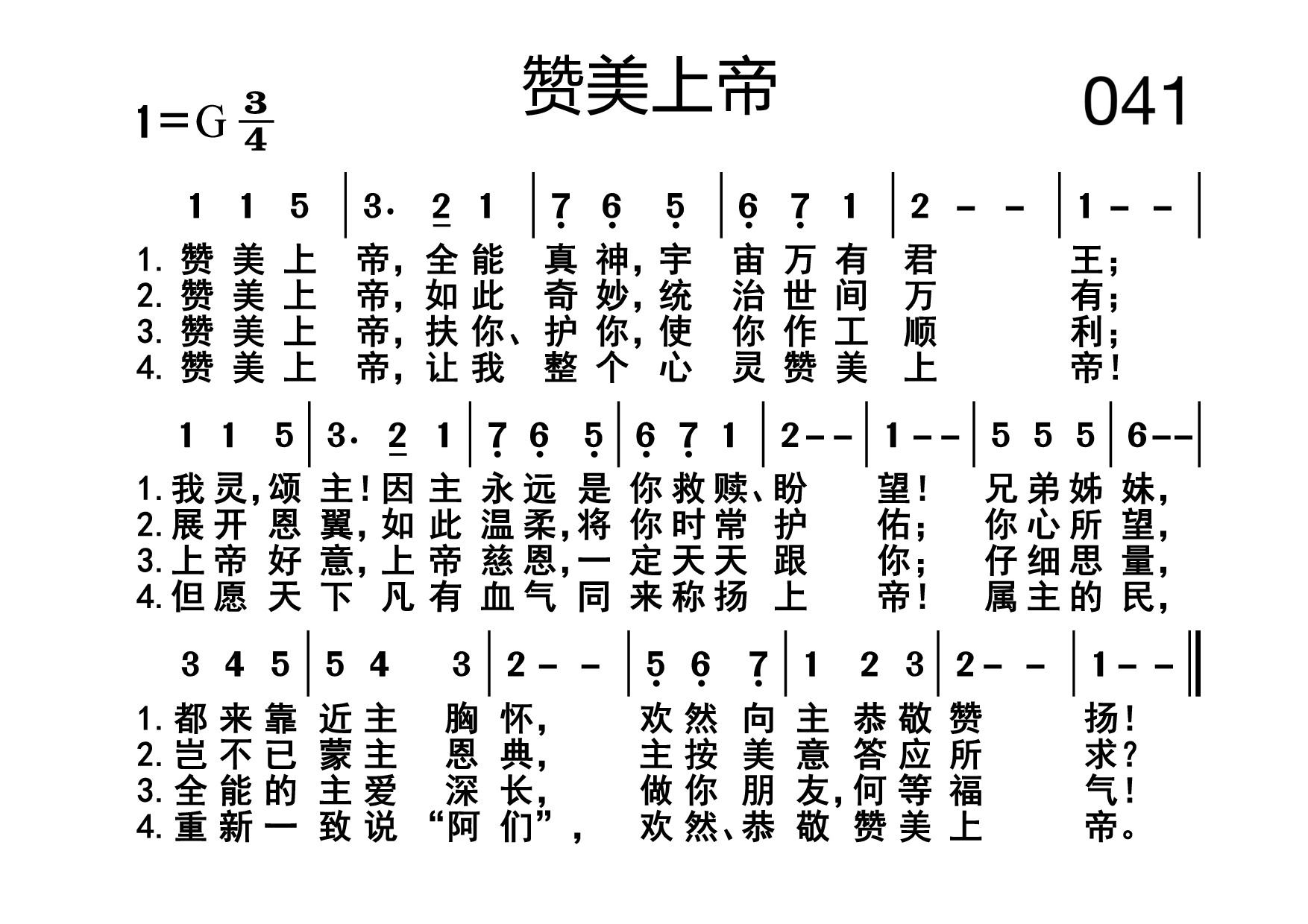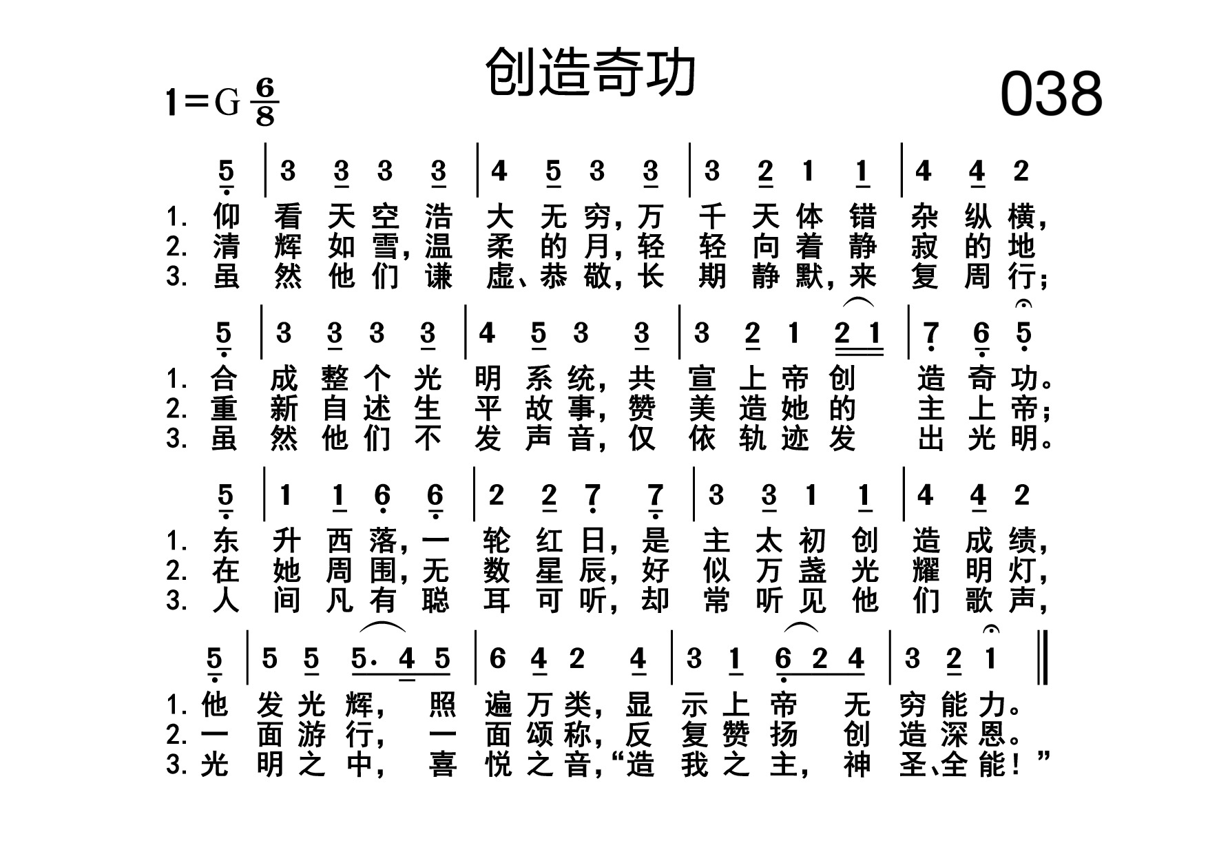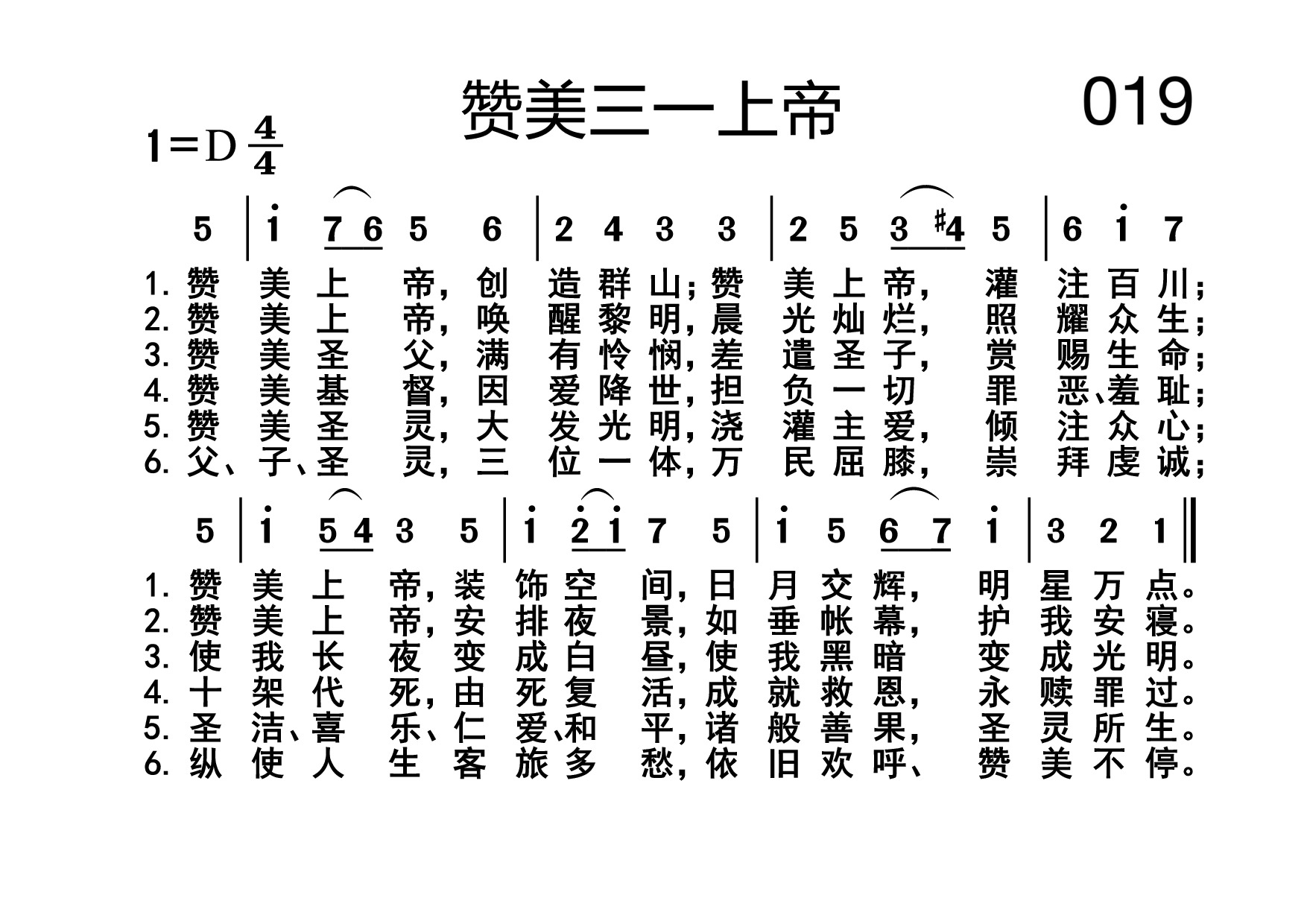 赞美上主 创造群山赞美上主 灌注百川赞美上主 装饰空间日月交辉 明星万点赞美上主 唤醒黎明晨光灿烂 照耀万灵赞美上主 安排夜景如垂帐幕 护我安寝赞美上主 大哉宏恩差遣圣子 赏赐生命使我长夜变成白昼使我黑暗变成光明赞美基督 因爱降生担负一切羞辱艰辛降生受死 由死复活舍身以作万世牺牲赞美圣灵 大发光明将主爱力照彻我心圣洁喜乐仁爱和平诸般善果 圣灵所生父子圣灵 三位一体万民屈膝 崇拜虔诚纵使人生羁旅多愁依旧欢呼赞美不停
