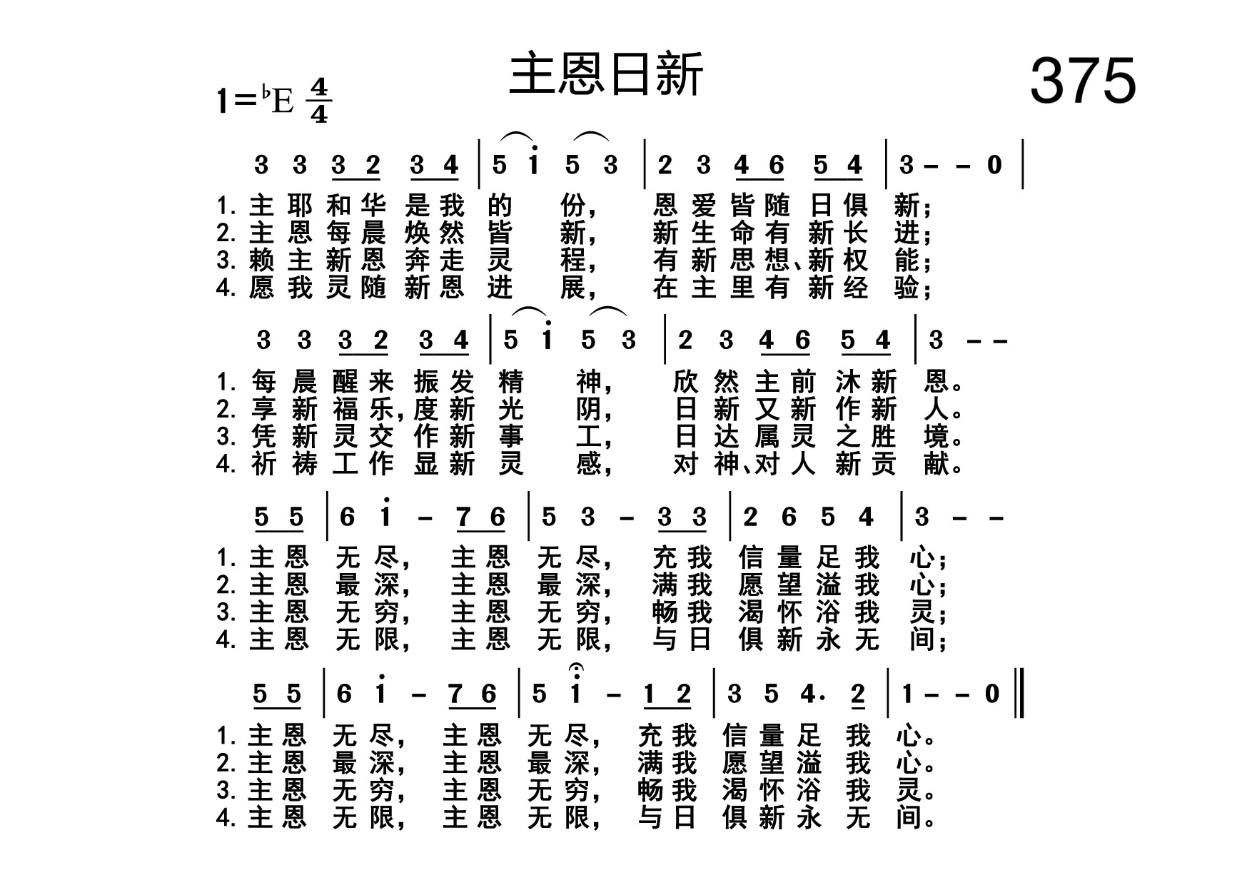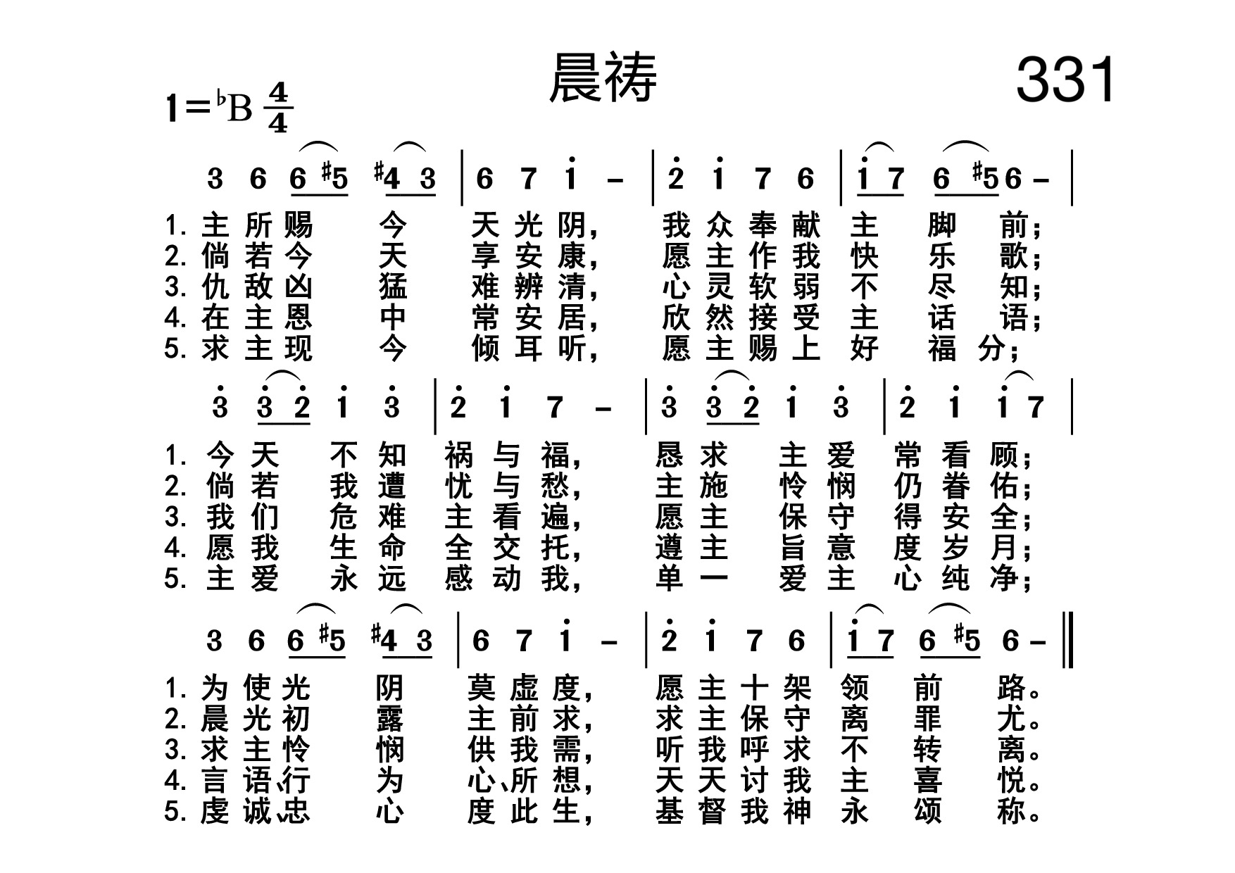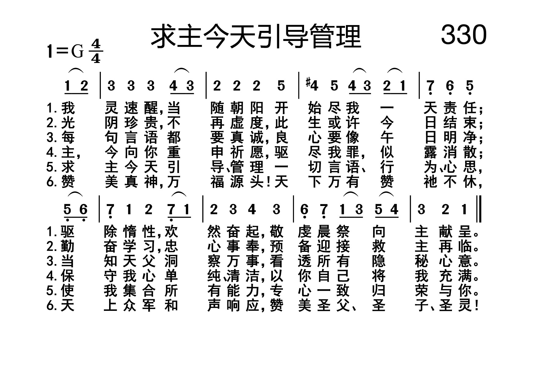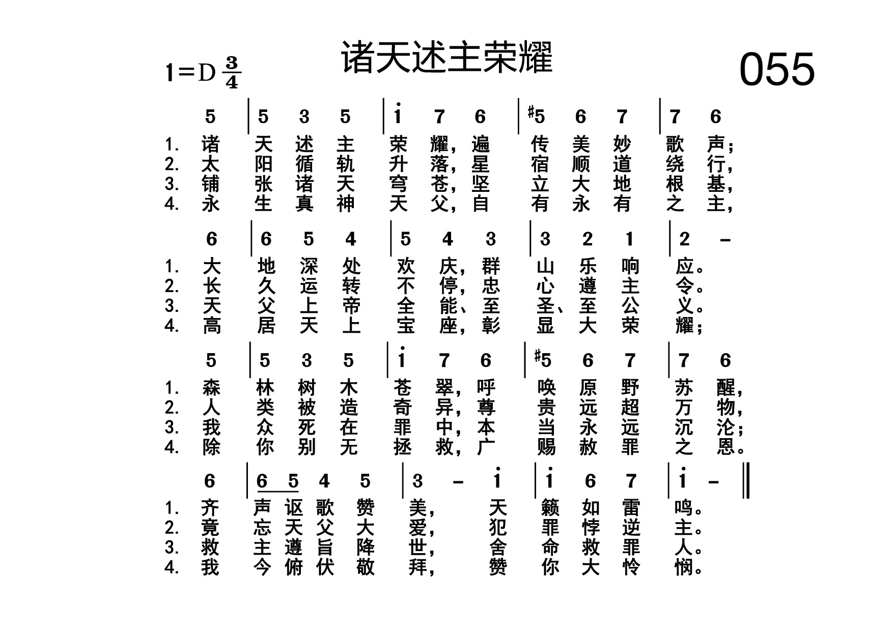 赞美上主 创造群山赞美上主 灌注百川赞美上主 装饰空间日月交辉 明星万点赞美上主 唤醒黎明晨光灿烂 照耀万灵赞美上主 安排夜景如垂帐幕 护我安寝赞美上主 大哉宏恩差遣圣子 赏赐生命使我长夜变成白昼使我黑暗变成光明赞美基督 因爱降生担负一切羞辱艰辛降生受死 由死复活舍身以作万世牺牲赞美圣灵 大发光明将主爱力照彻我心圣洁喜乐仁爱和平诸般善果 圣灵所生父子圣灵 三位一体万民屈膝 崇拜虔诚纵使人生羁旅多愁依旧欢呼赞美不停