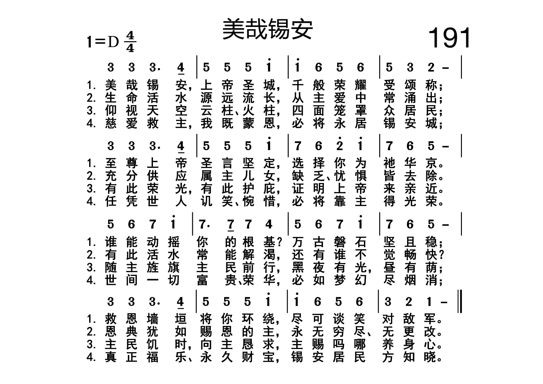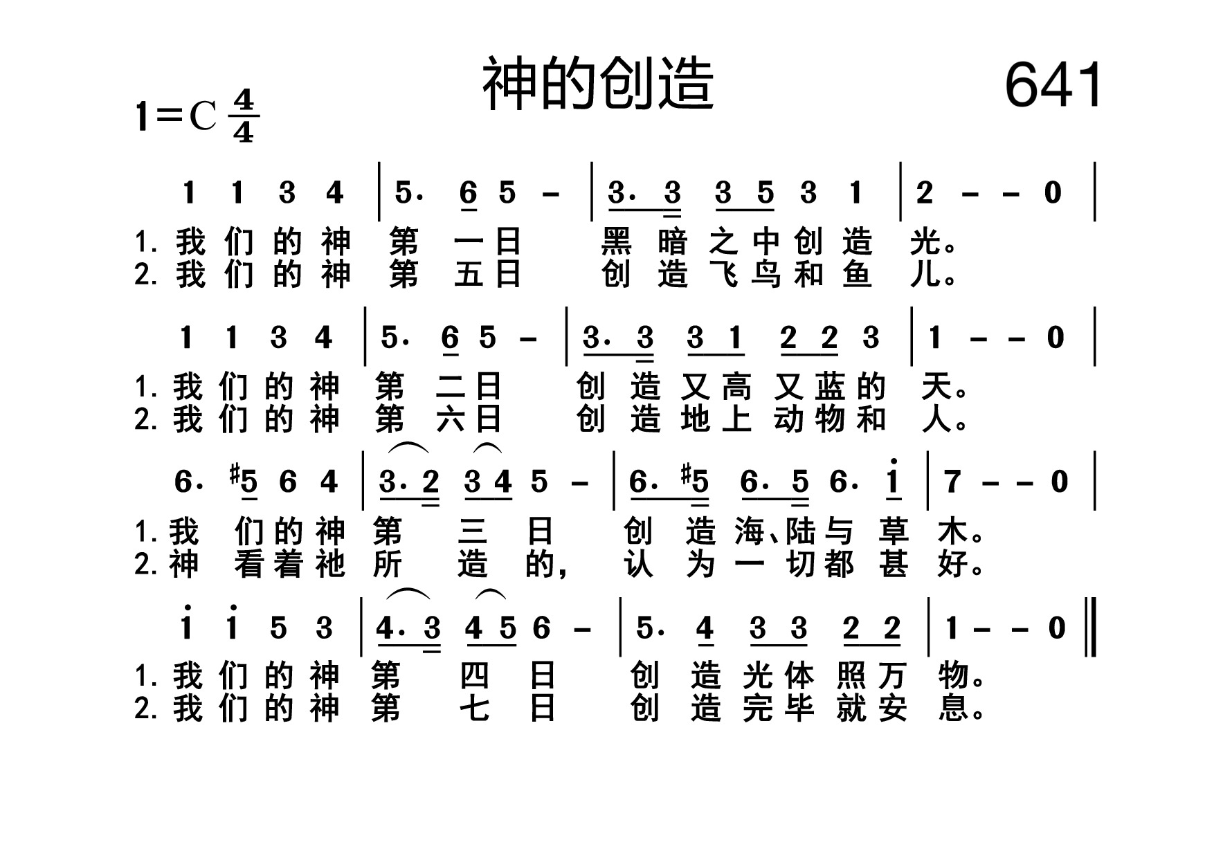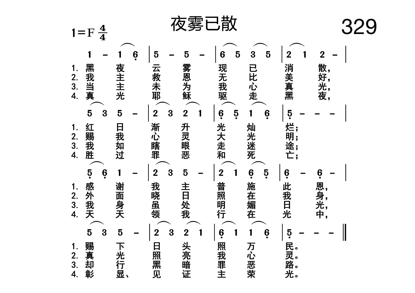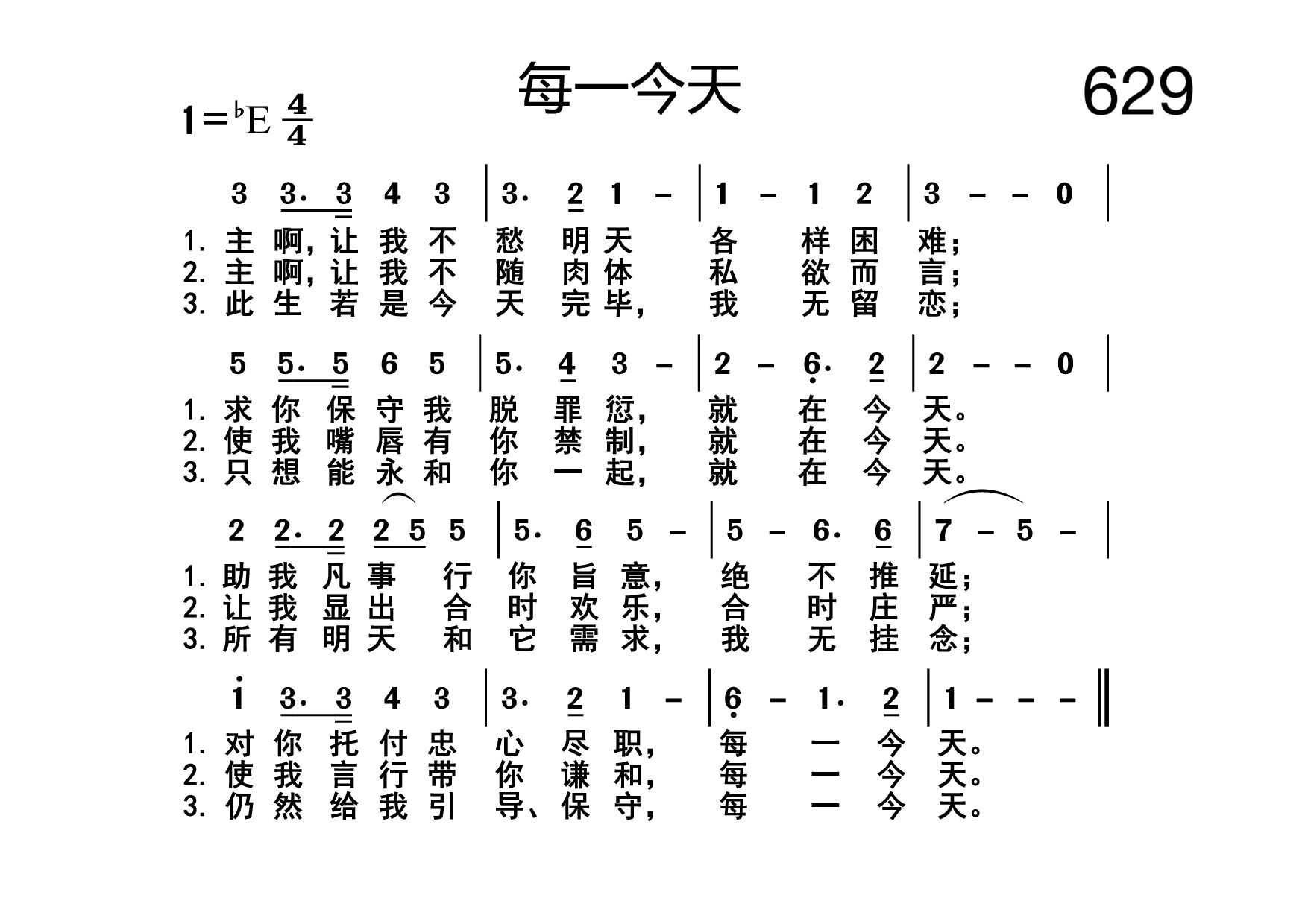 赞美上主 创造群山赞美上主 灌注百川赞美上主 装饰空间日月交辉 明星万点赞美上主 唤醒黎明晨光灿烂 照耀万灵赞美上主 安排夜景如垂帐幕 护我安寝赞美上主 大哉宏恩差遣圣子 赏赐生命使我长夜变成白昼使我黑暗变成光明赞美基督 因爱降生担负一切羞辱艰辛降生受死 由死复活舍身以作万世牺牲赞美圣灵 大发光明将主爱力照彻我心圣洁喜乐仁爱和平诸般善果 圣灵所生父子圣灵 三位一体万民屈膝 崇拜虔诚纵使人生羁旅多愁依旧欢呼赞美不停