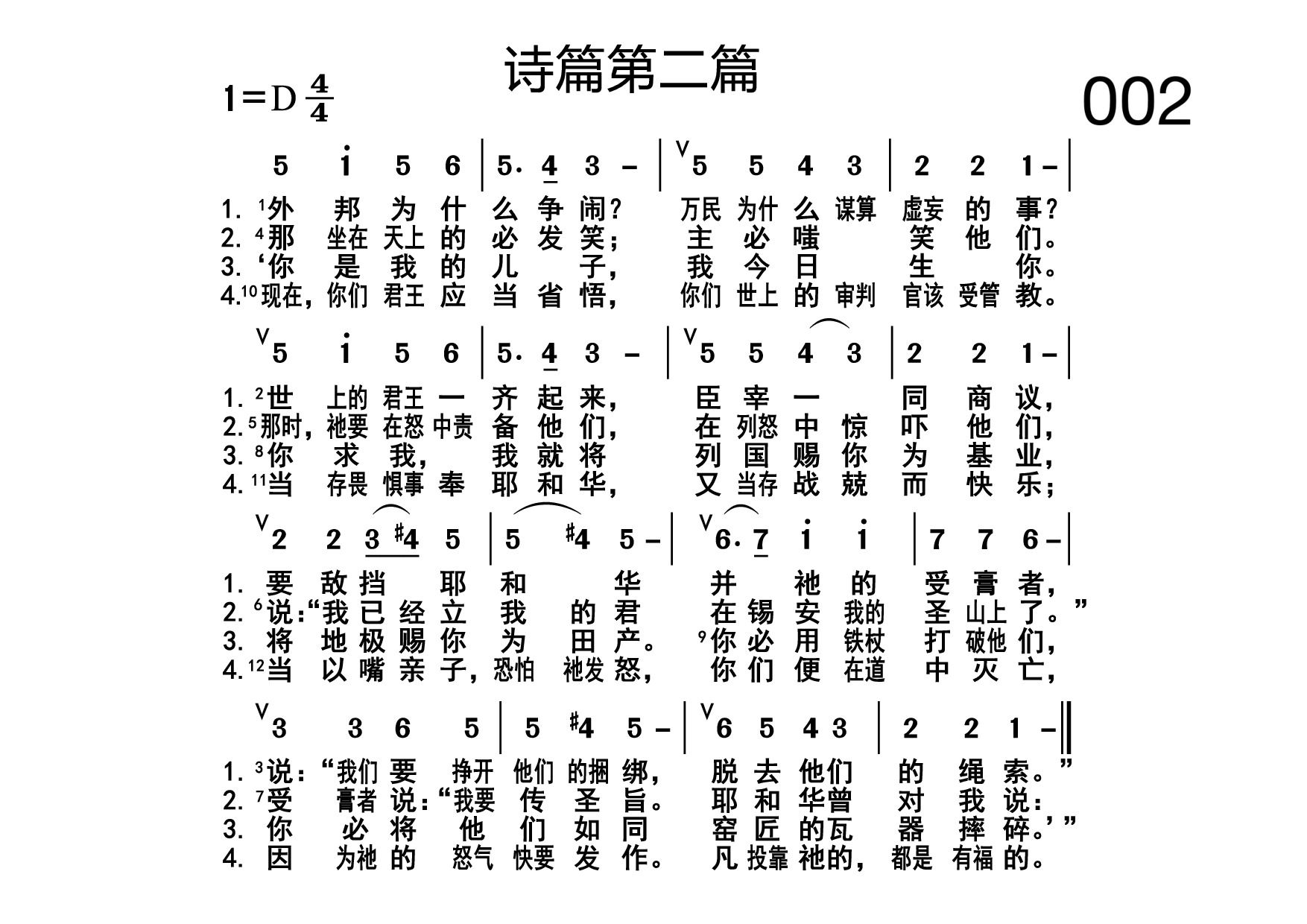 外邦为什么争闹?万民为什么谋算虚妄的事?世上的君王一齐起来,臣宰一同商议,要敌挡耶和华并他的受膏者,说:“我们要挣开他们的捆绑,脱去他们的绳索。”那坐在天上的必发笑;主必嗤笑他们。那时,他要在怒中责备他们,在烈怒中惊吓他们,说:“我已经立我的君在锡安我的圣山上了。”受膏者说:“我要传圣旨。耶和华曾对我说:‘你是我的儿子,我今日生你。你求我,我就将列国赐你为基业,将地极赐你为田产。你必用铁杖打破他们,你必将他们如同窑匠的瓦器摔碎。’”现在,你们君王应当省悟,你们世上的审判官该受管教。当存畏惧侍奉耶和华,又当存战兢而快乐;当以嘴亲子,恐怕他发怒,你们便在道中灭亡,因为他的怒气快要发作。凡投靠他的,都是有福的。