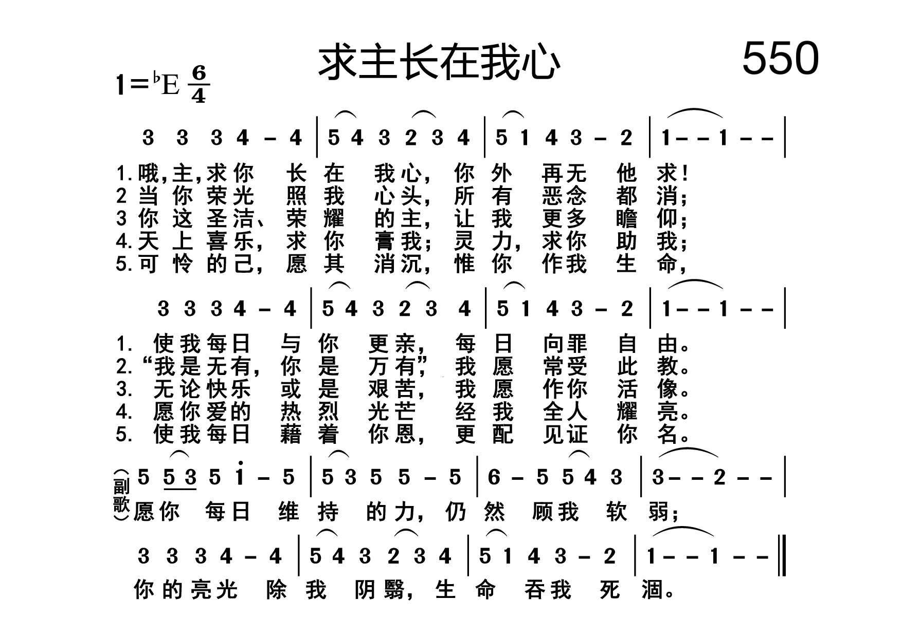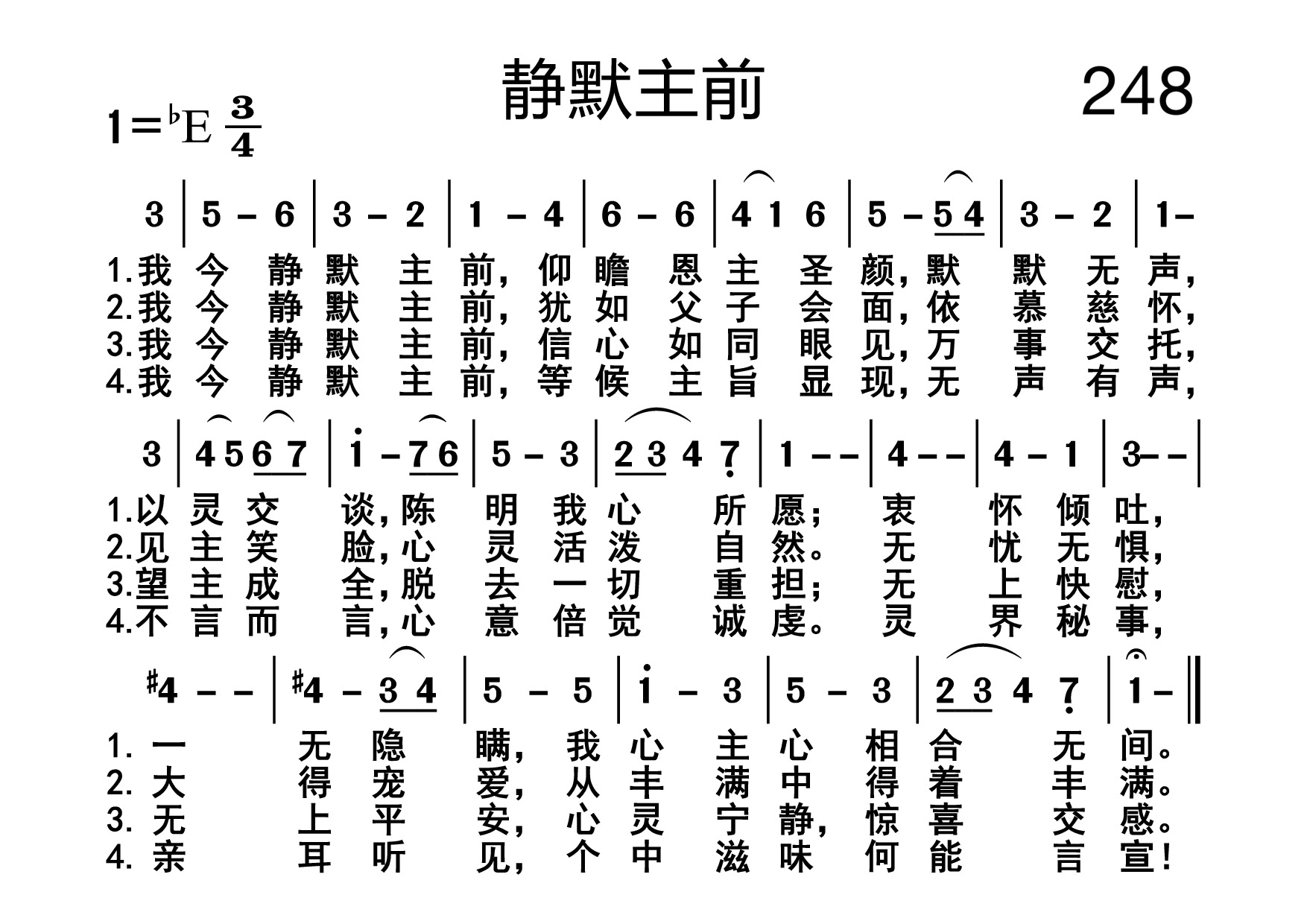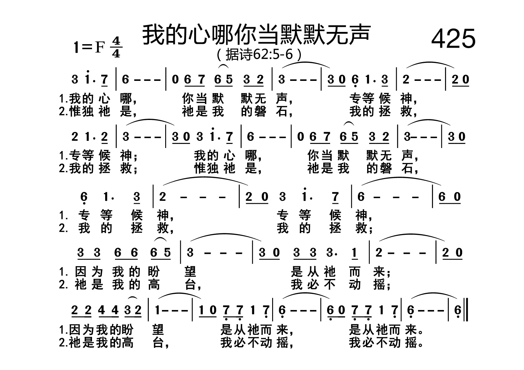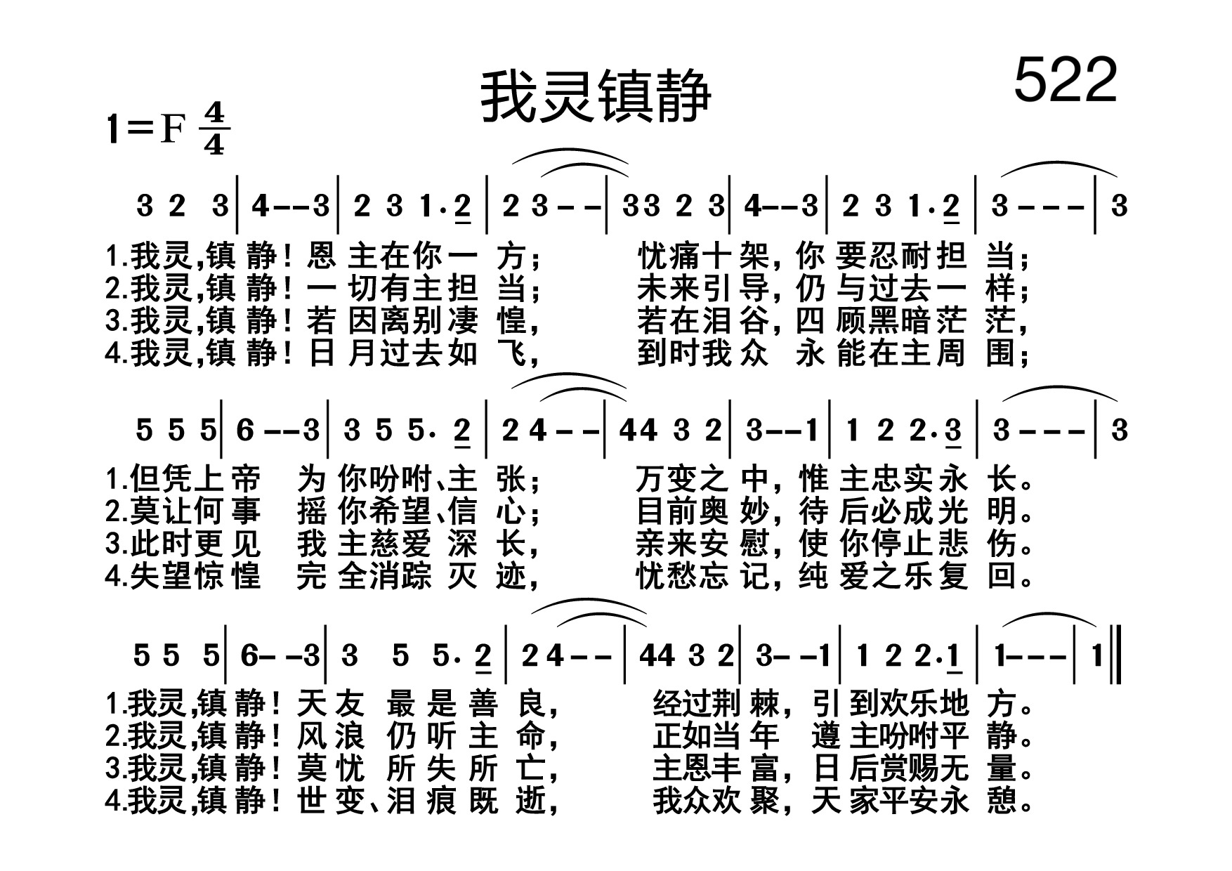 我灵,镇静:上主在你一方;忧痛十架,你要忍耐担当;但凭上帝为你吩咐主张;万变之中,惟主忠实永长。我灵,镇静:天友最是善良,经过荆棘,引到欢乐地方。我灵,镇静:上主决然担任,未来引导,仍似过去情形。莫让何事摇你希望信心;目前奥妙,待后必成光明。我灵,镇静:风浪依旧听遵,救主当年,所发吩咐声音。我灵,镇静:若因离别凄惶,若在泪谷,四顾黑暗茫茫,此时更见我主慈爱深长,亲来安慰,使你停止悲伤。我灵,镇静:莫忧所失所亡,主恩丰富,日后赏赐无量。我灵,镇静:日月过去如飞,到时我众,永能在主周围,失望惊惶完全消踪灭迹,忧愁忘记,纯爱之乐复回。我灵,镇静:世变泪痕即逝,我众欢聚,大家平安永憩。