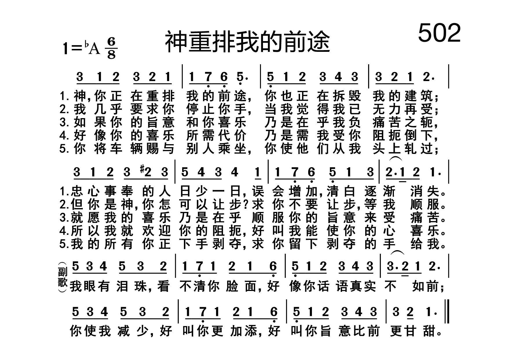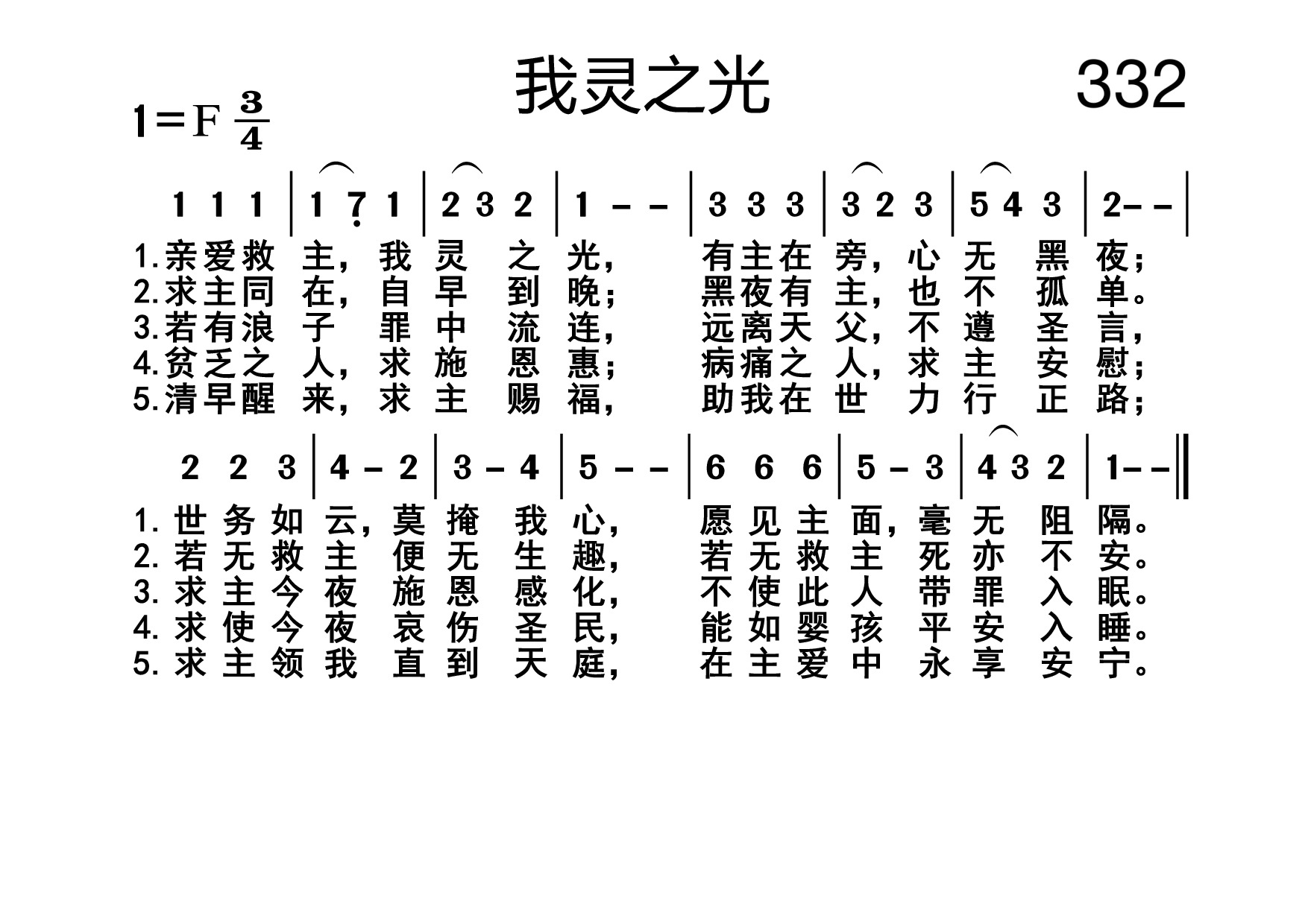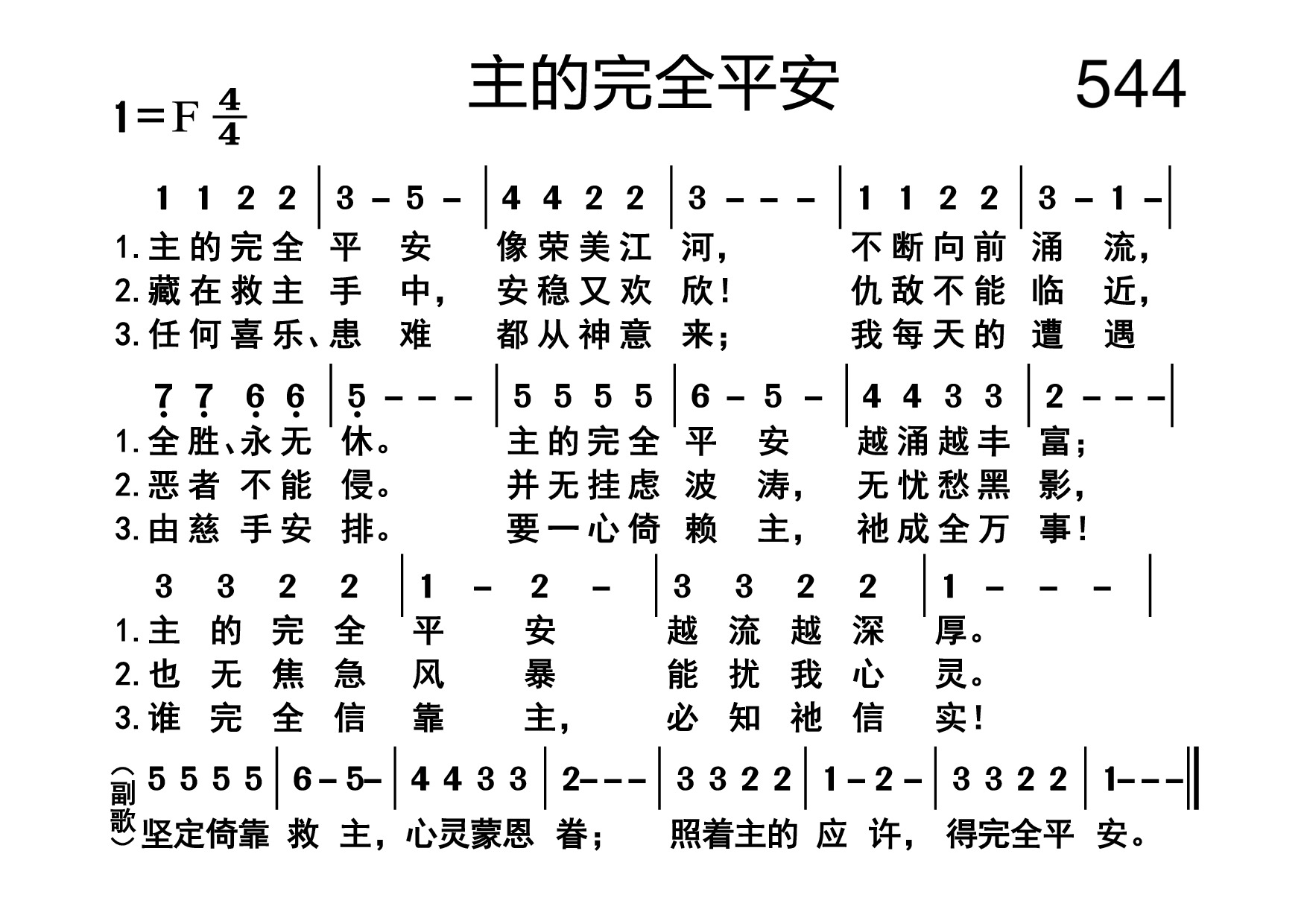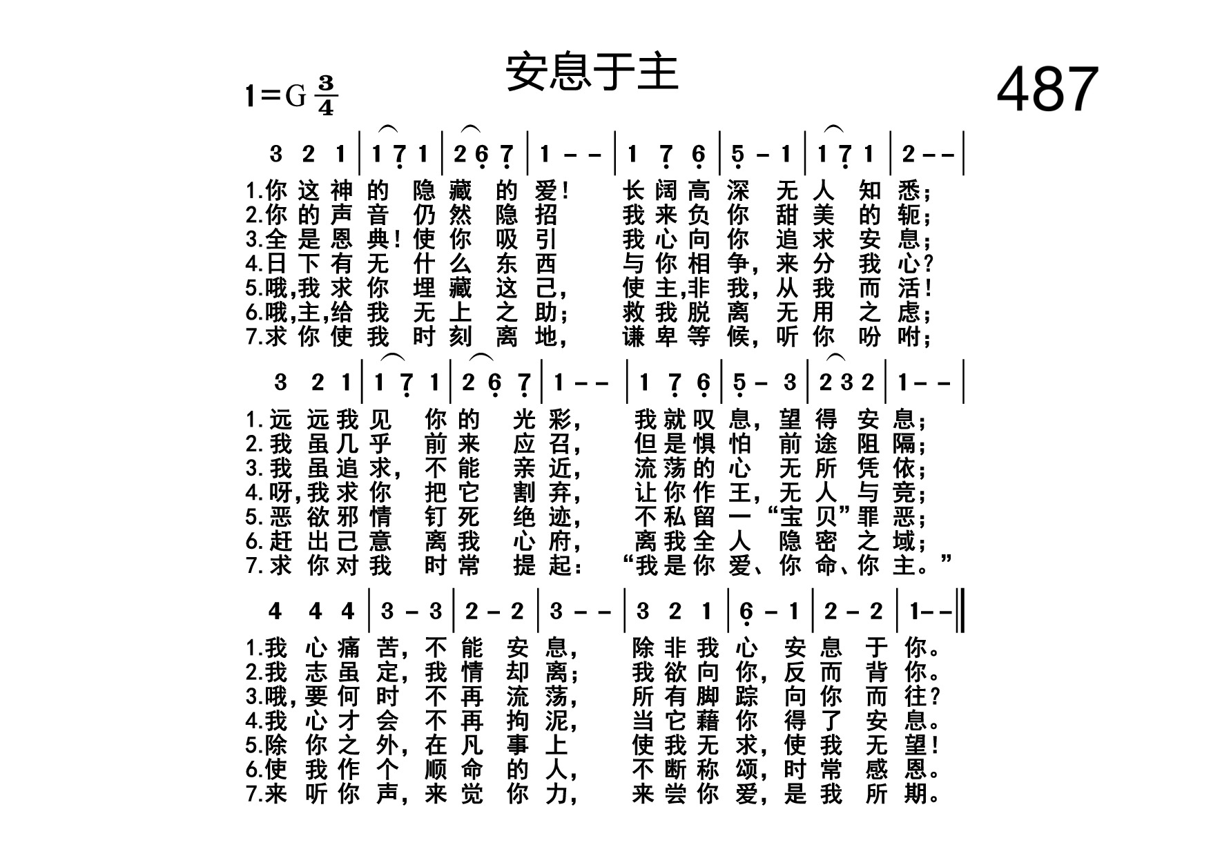 我灵,镇静:上主在你一方;忧痛十架,你要忍耐担当;但凭上帝为你吩咐主张;万变之中,惟主忠实永长。我灵,镇静:天友最是善良,经过荆棘,引到欢乐地方。我灵,镇静:上主决然担任,未来引导,仍似过去情形。莫让何事摇你希望信心;目前奥妙,待后必成光明。我灵,镇静:风浪依旧听遵,救主当年,所发吩咐声音。我灵,镇静:若因离别凄惶,若在泪谷,四顾黑暗茫茫,此时更见我主慈爱深长,亲来安慰,使你停止悲伤。我灵,镇静:莫忧所失所亡,主恩丰富,日后赏赐无量。我灵,镇静:日月过去如飞,到时我众,永能在主周围,失望惊惶完全消踪灭迹,忧愁忘记,纯爱之乐复回。我灵,镇静:世变泪痕即逝,我众欢聚,大家平安永憩。