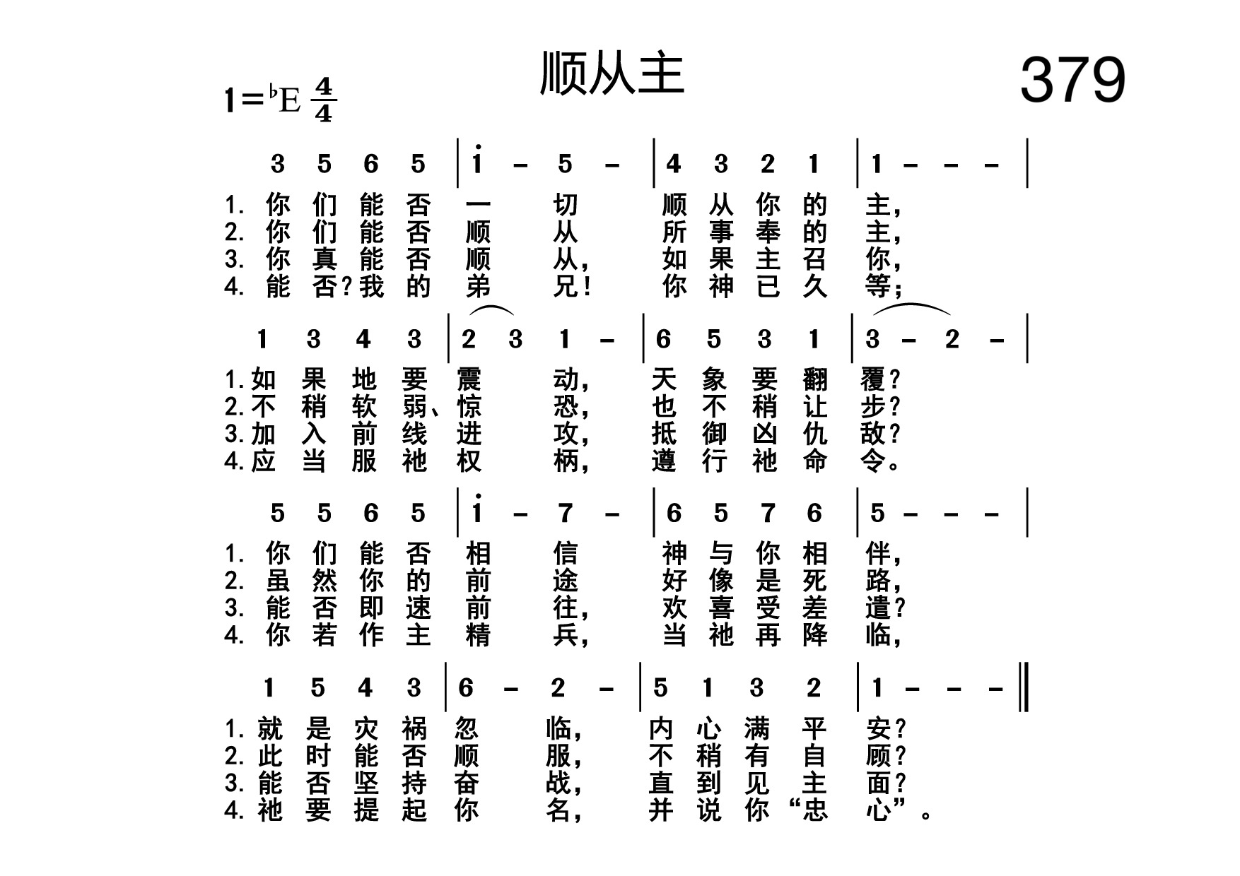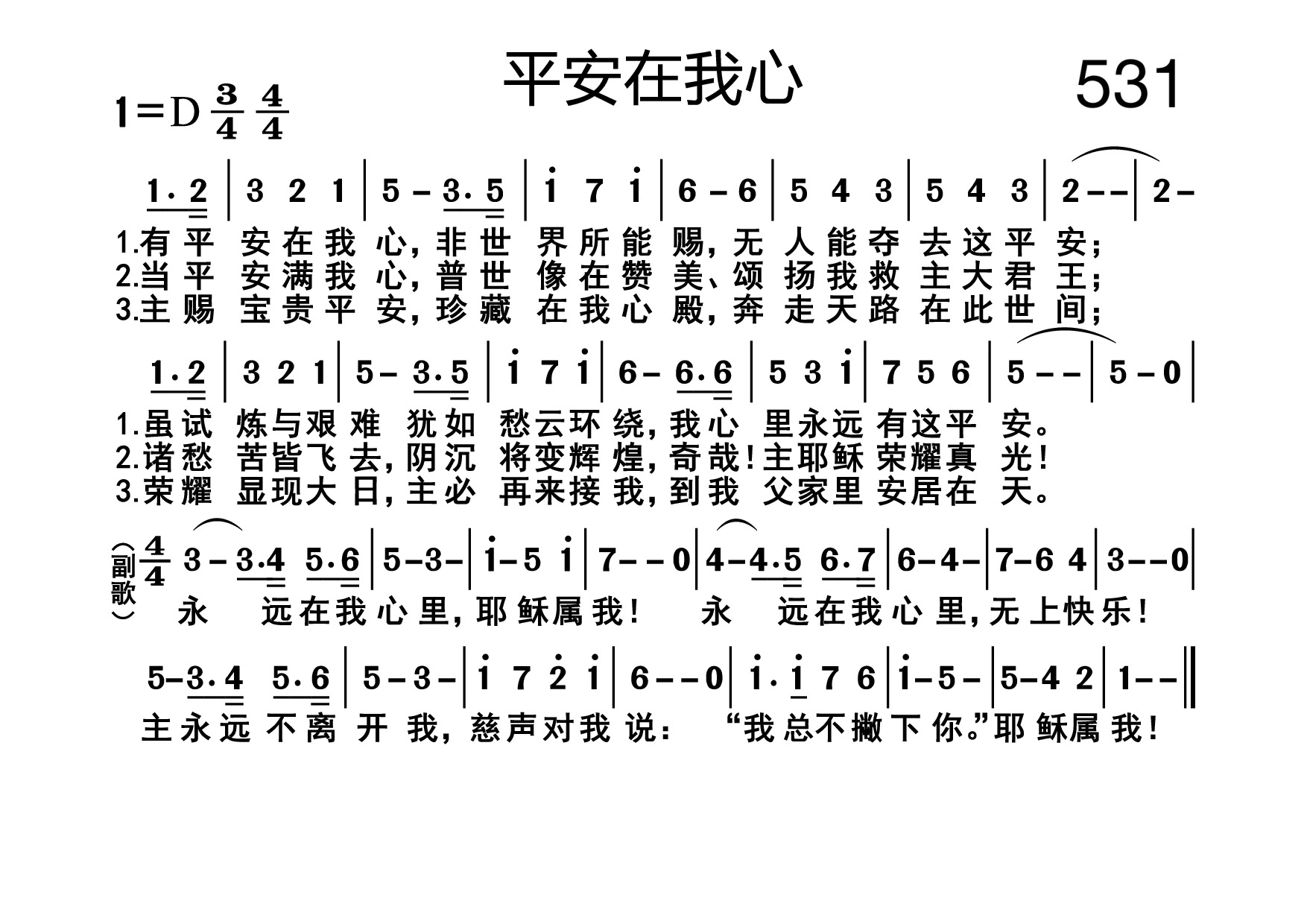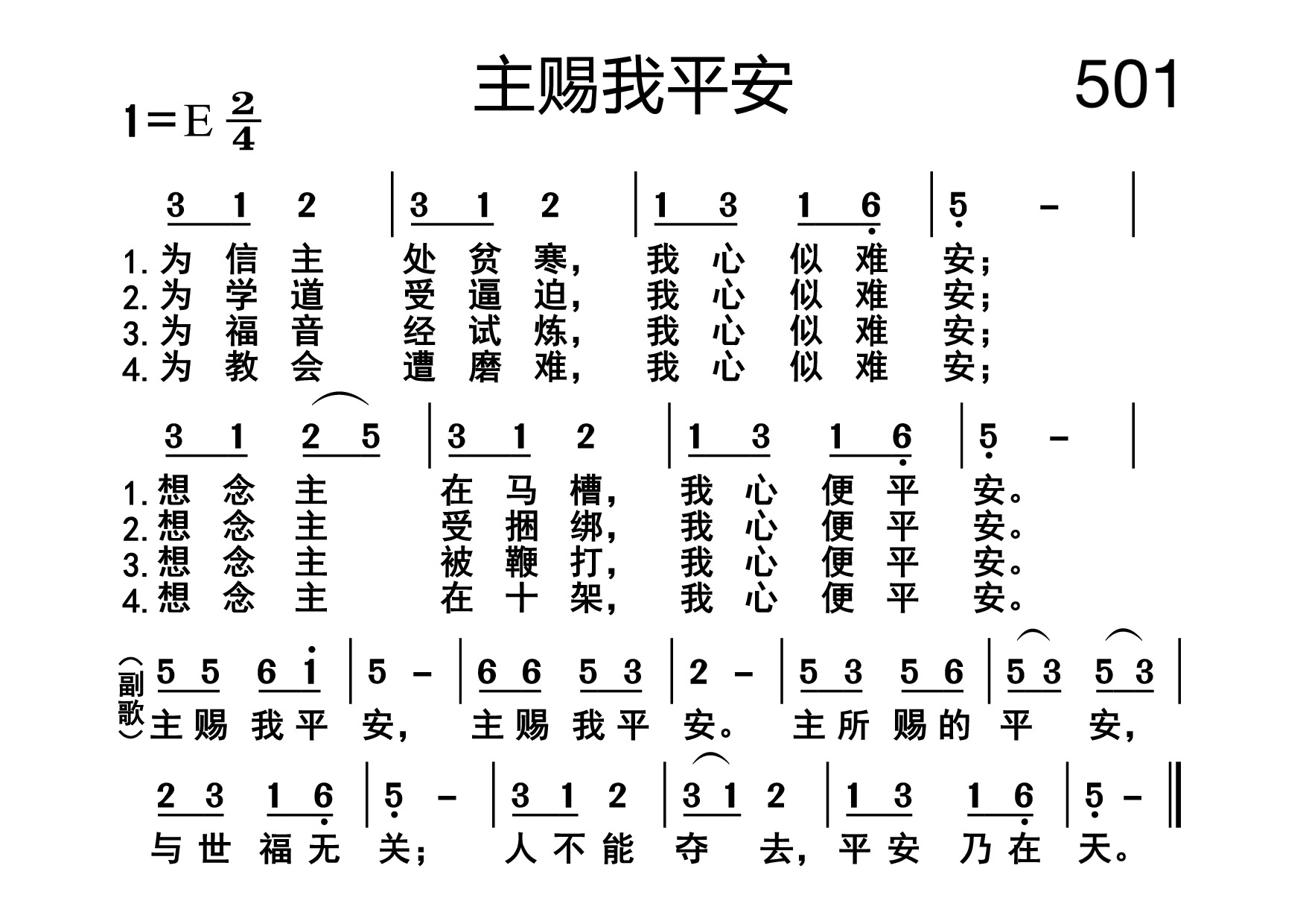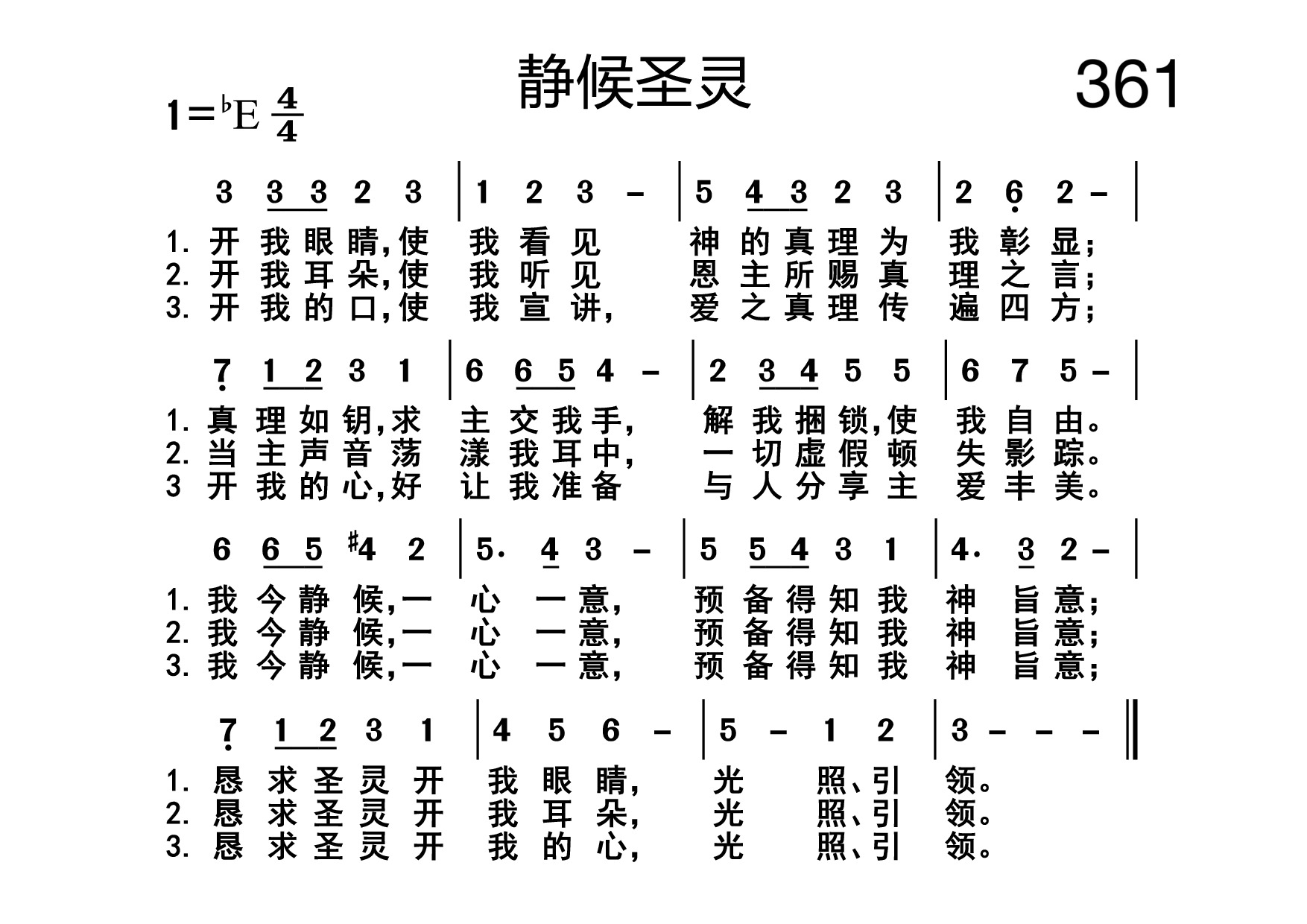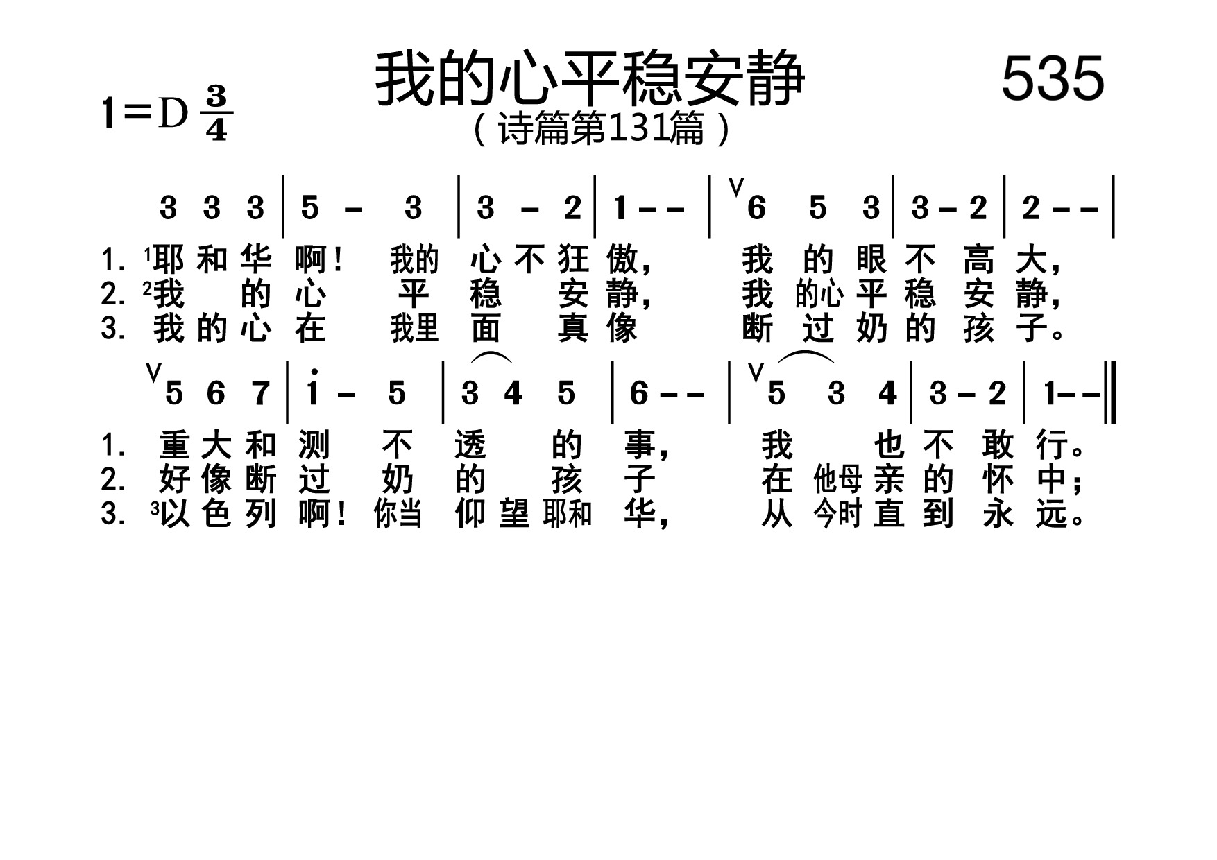 我灵,镇静:上主在你一方;忧痛十架,你要忍耐担当;但凭上帝为你吩咐主张;万变之中,惟主忠实永长。我灵,镇静:天友最是善良,经过荆棘,引到欢乐地方。我灵,镇静:上主决然担任,未来引导,仍似过去情形。莫让何事摇你希望信心;目前奥妙,待后必成光明。我灵,镇静:风浪依旧听遵,救主当年,所发吩咐声音。我灵,镇静:若因离别凄惶,若在泪谷,四顾黑暗茫茫,此时更见我主慈爱深长,亲来安慰,使你停止悲伤。我灵,镇静:莫忧所失所亡,主恩丰富,日后赏赐无量。我灵,镇静:日月过去如飞,到时我众,永能在主周围,失望惊惶完全消踪灭迹,忧愁忘记,纯爱之乐复回。我灵,镇静:世变泪痕即逝,我众欢聚,大家平安永憩。