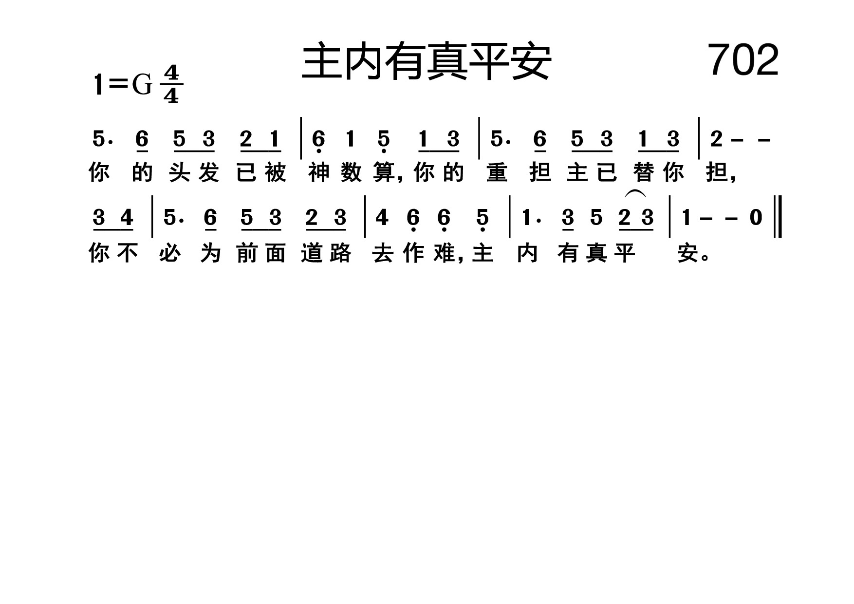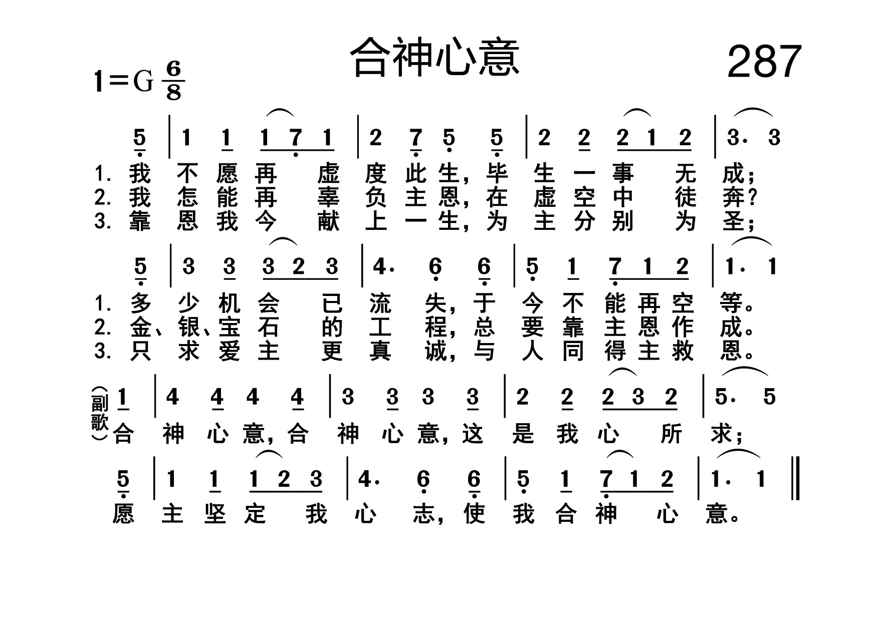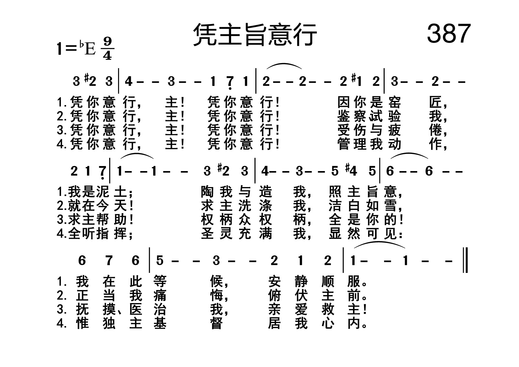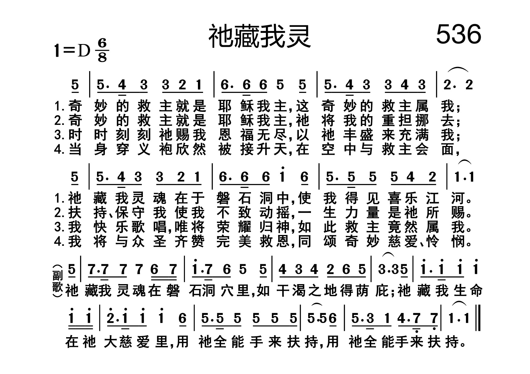 我灵,镇静:上主在你一方;忧痛十架,你要忍耐担当;但凭上帝为你吩咐主张;万变之中,惟主忠实永长。我灵,镇静:天友最是善良,经过荆棘,引到欢乐地方。我灵,镇静:上主决然担任,未来引导,仍似过去情形。莫让何事摇你希望信心;目前奥妙,待后必成光明。我灵,镇静:风浪依旧听遵,救主当年,所发吩咐声音。我灵,镇静:若因离别凄惶,若在泪谷,四顾黑暗茫茫,此时更见我主慈爱深长,亲来安慰,使你停止悲伤。我灵,镇静:莫忧所失所亡,主恩丰富,日后赏赐无量。我灵,镇静:日月过去如飞,到时我众,永能在主周围,失望惊惶完全消踪灭迹,忧愁忘记,纯爱之乐复回。我灵,镇静:世变泪痕即逝,我众欢聚,大家平安永憩。