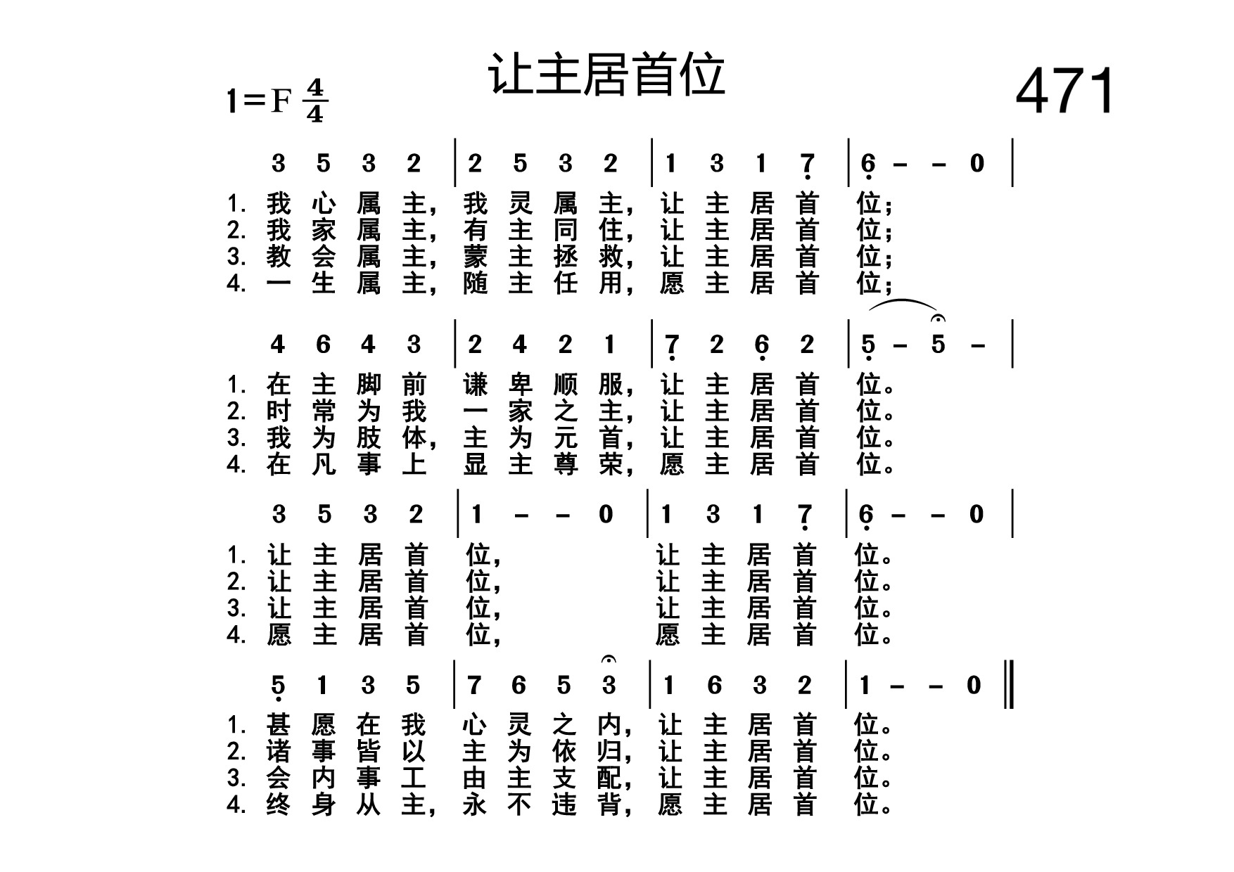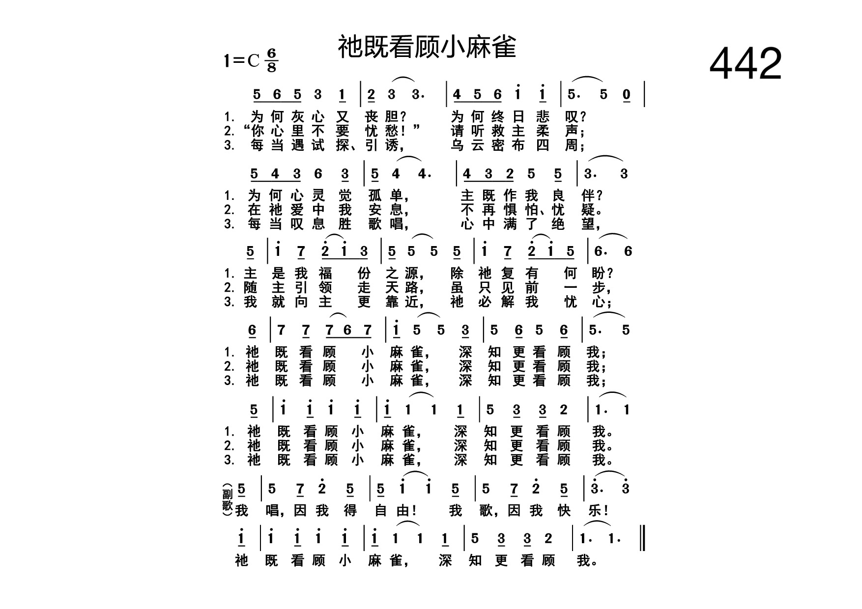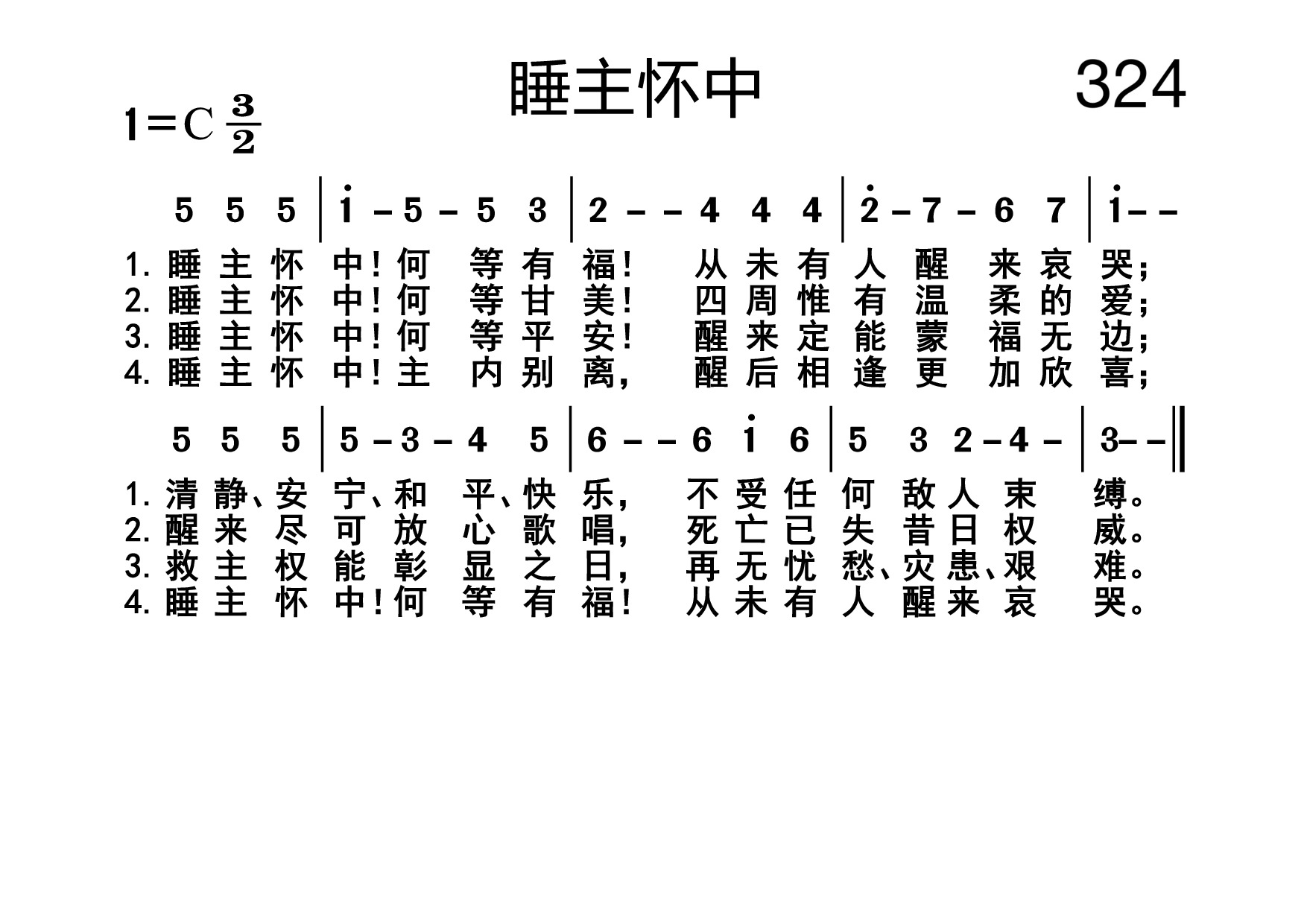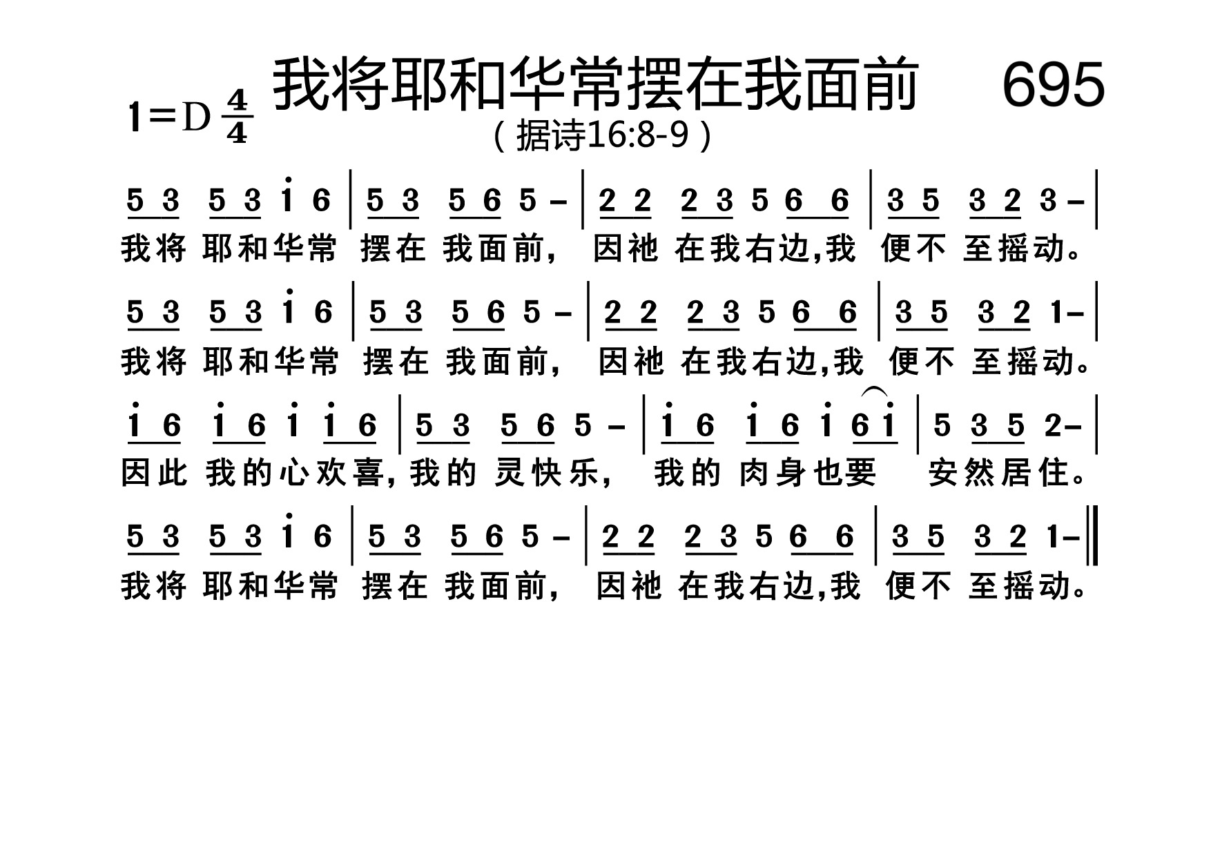 我灵,镇静:上主在你一方;忧痛十架,你要忍耐担当;但凭上帝为你吩咐主张;万变之中,惟主忠实永长。我灵,镇静:天友最是善良,经过荆棘,引到欢乐地方。我灵,镇静:上主决然担任,未来引导,仍似过去情形。莫让何事摇你希望信心;目前奥妙,待后必成光明。我灵,镇静:风浪依旧听遵,救主当年,所发吩咐声音。我灵,镇静:若因离别凄惶,若在泪谷,四顾黑暗茫茫,此时更见我主慈爱深长,亲来安慰,使你停止悲伤。我灵,镇静:莫忧所失所亡,主恩丰富,日后赏赐无量。我灵,镇静:日月过去如飞,到时我众,永能在主周围,失望惊惶完全消踪灭迹,忧愁忘记,纯爱之乐复回。我灵,镇静:世变泪痕即逝,我众欢聚,大家平安永憩。