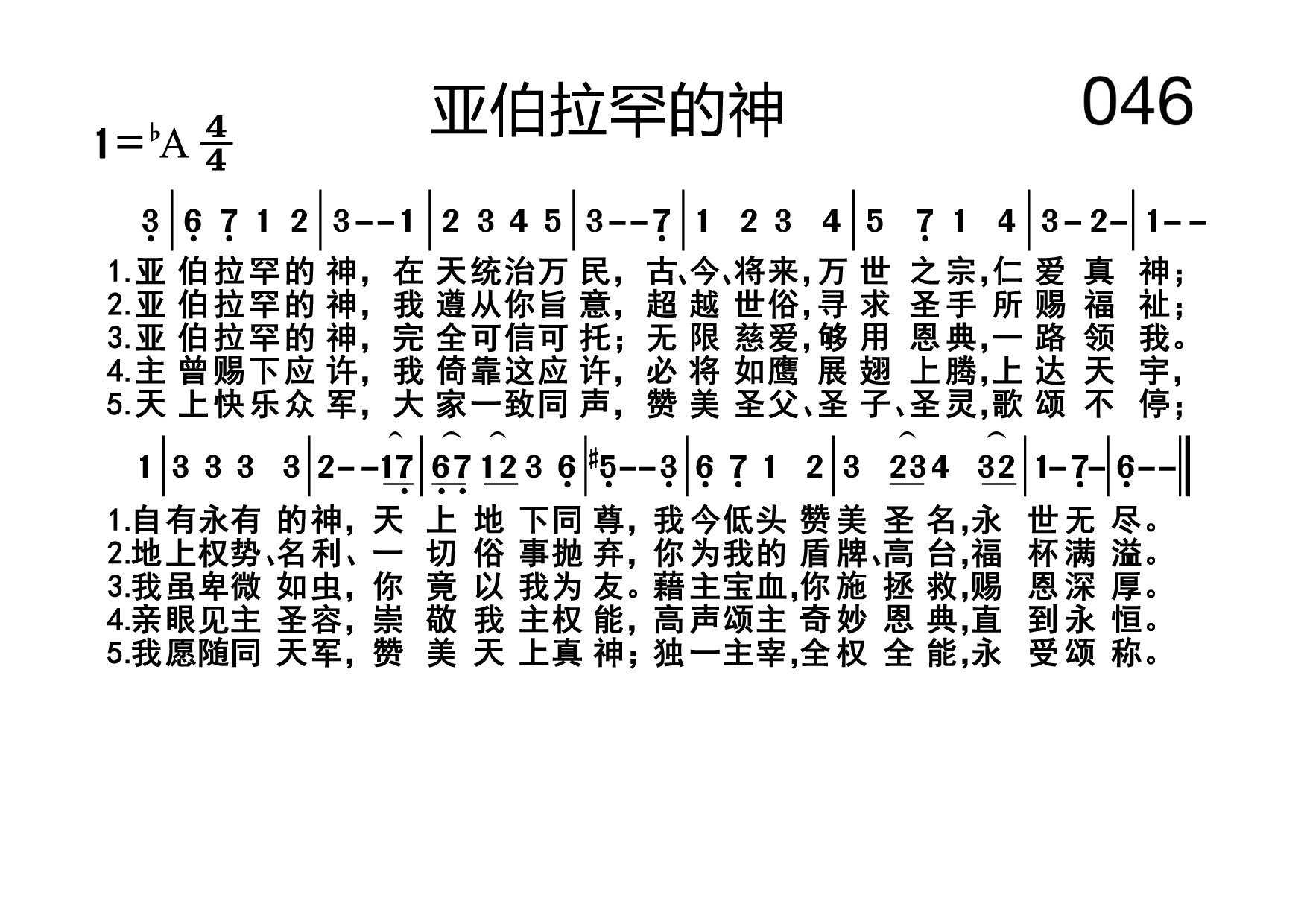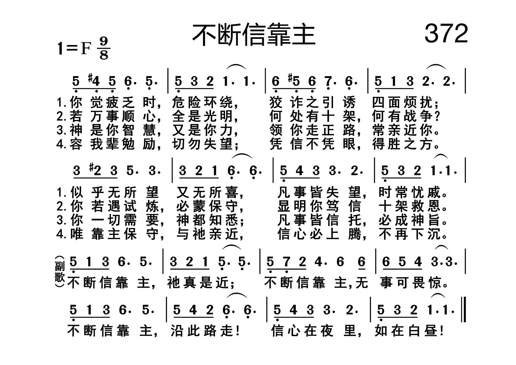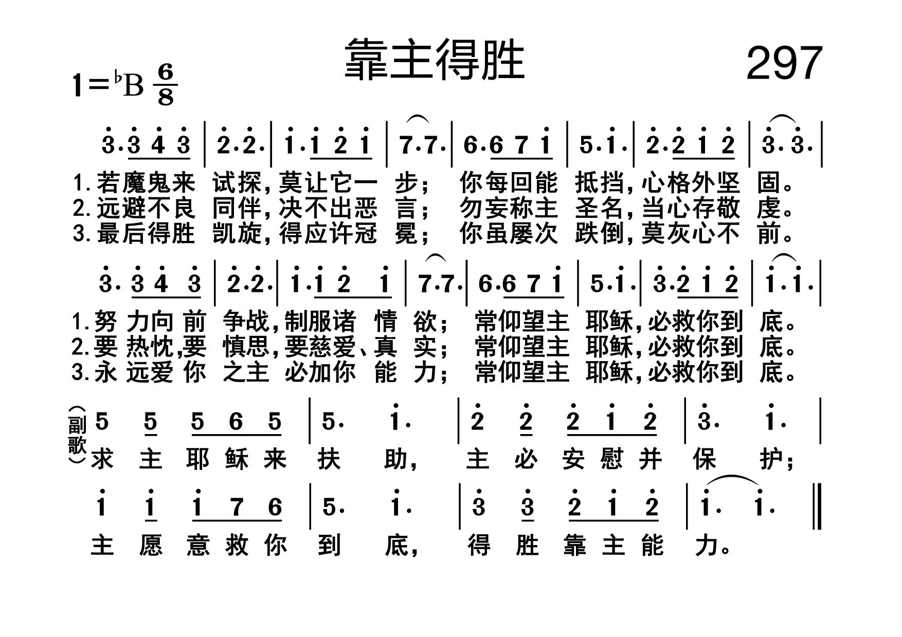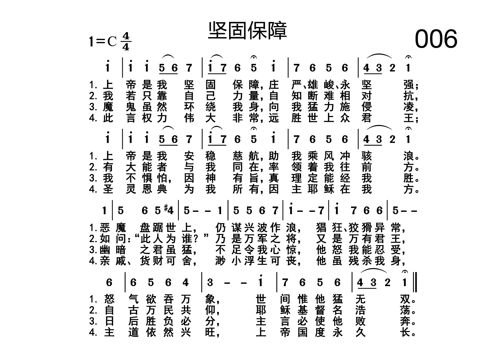 上主是我坚固保障,庄严雄峻,永坚强;上主是我安稳慈航,助我乘风冲骇浪。恶魔盘踞世上,仍谋兴波作浪,猖狂狡猾异常,怒气欲吞万象,世间惟他猛无双。我若单凭自己力量,自知断难相对抗,幸有神人踊跃先登,率领着我往前方。如问此人为谁?乃是万军之将,又是万有君王,自古万民共仰,耶稣基督名浩荡。魔鬼虽然环绕我身,向我尽量施侵凌,我不惧怕,因神有旨,真理定能因我胜。幽暗之君虽猛,不足令我心惊,他怒,我能忍受,日后胜负必分,主言必使他败奔。此言权力伟大非常,远胜世上众君王,圣灵恩典为我所有,因主耶稣在我方。亲戚货财可舍,渺小浮生可丧,他们虽杀我身,主道依然兴旺,上主国度永久长。