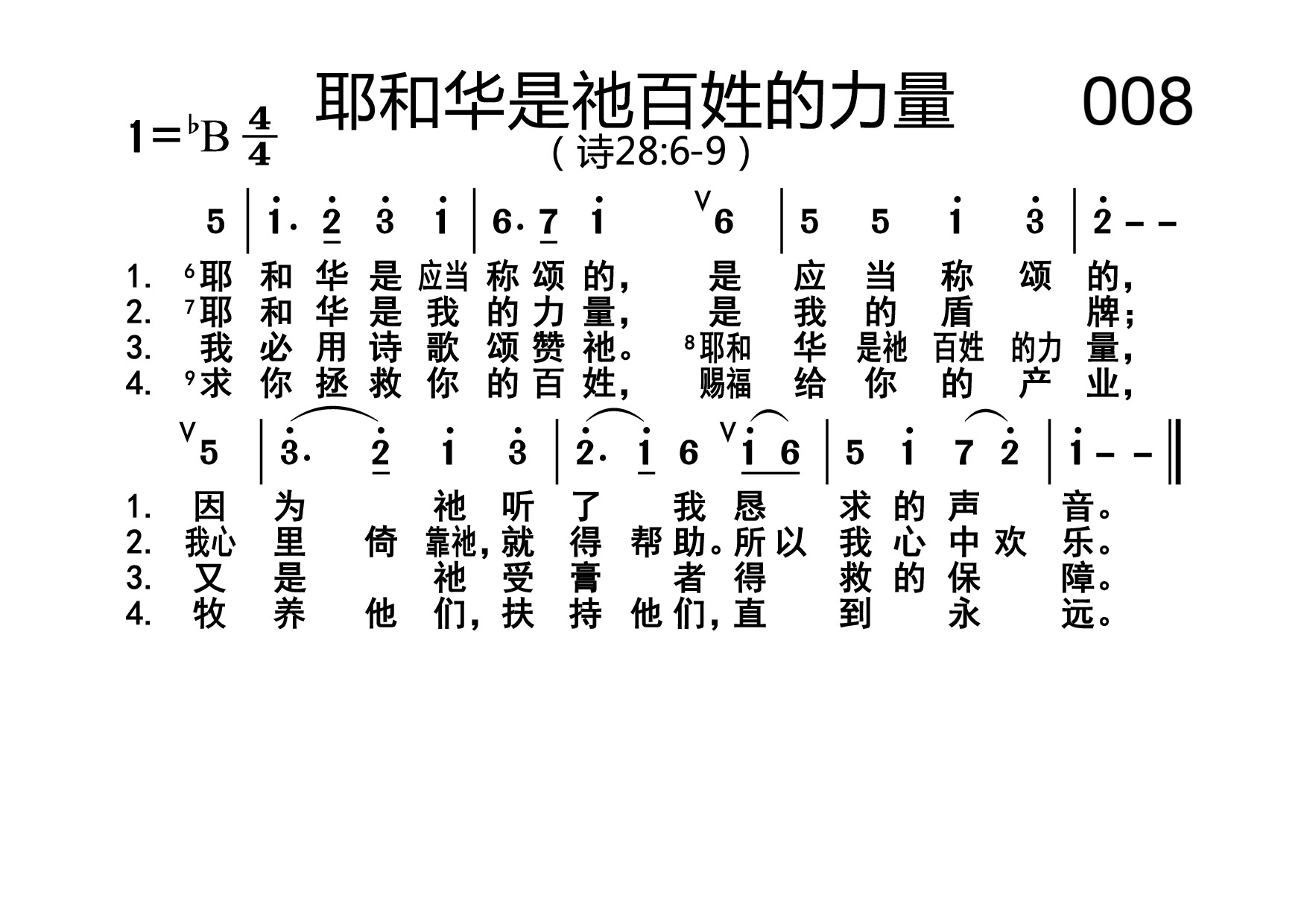 耶和华是应当称颂的,因为他听了我恳求的声音。耶和华是我的力量,是我的盾牌,我心里倚靠他,就得帮助;所以我心中欢乐,我必用诗歌颂赞他。耶和华是他百姓的力量,又是他受膏者得救的保障。求你拯救你的百姓,赐福给你的产业,牧养他们,扶持他们,直到永远。